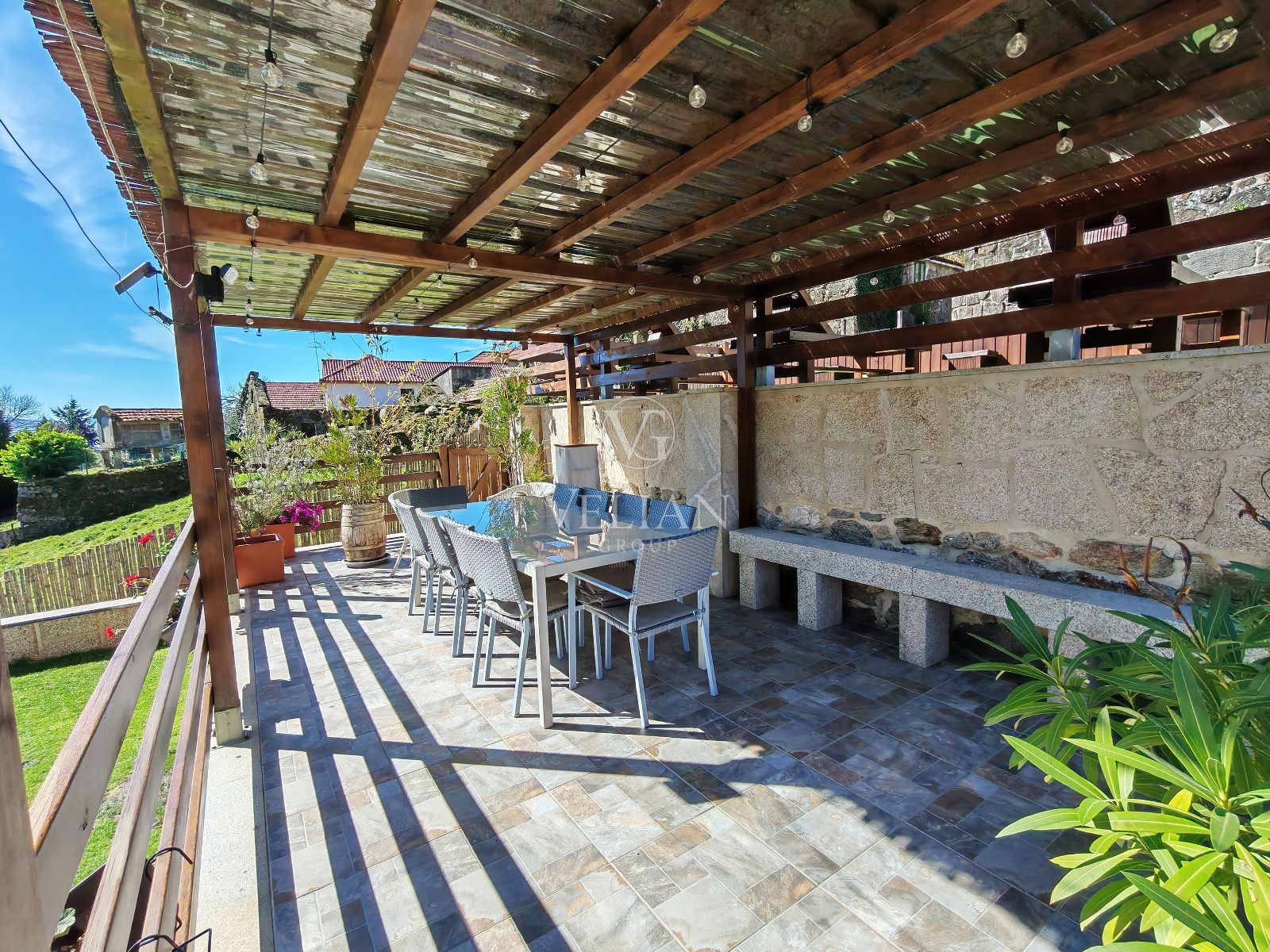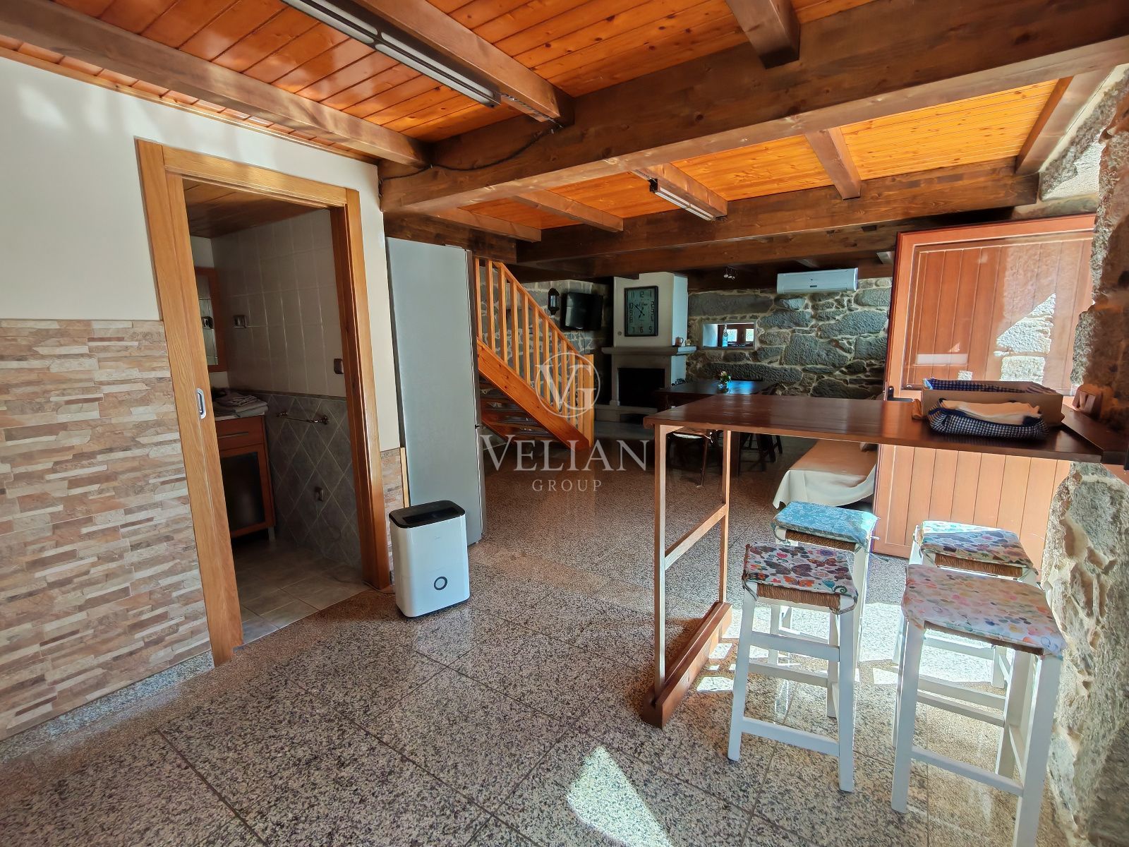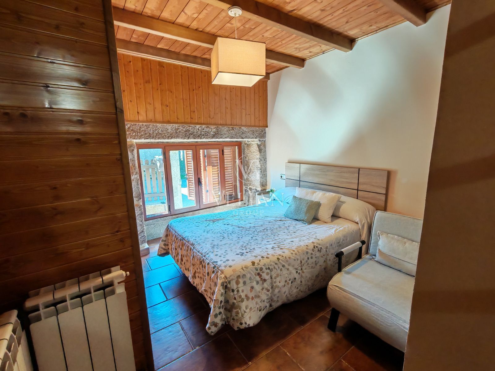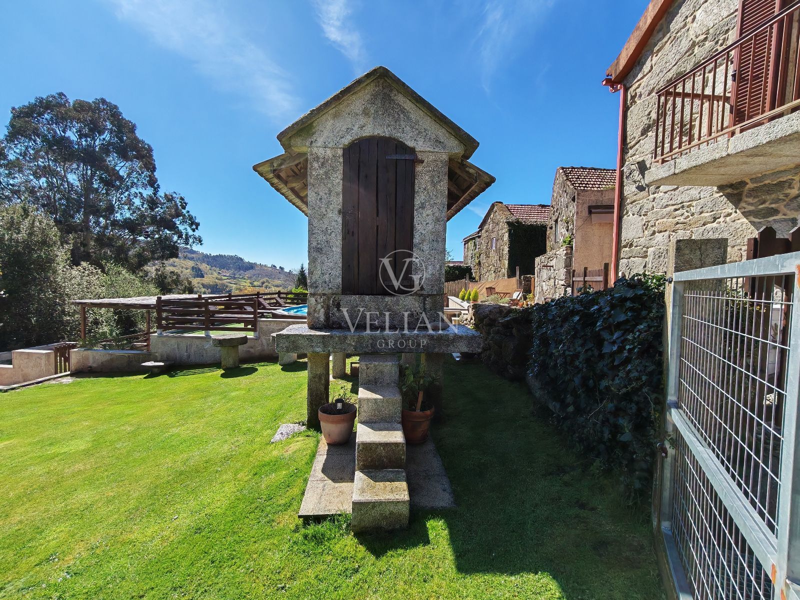 Se distribuye en 5 habitaciones con armarios, una de ellas con balcón y vistas despejadas, 3 baños completos, y una cocina americana integrada al salón-comedor, con chimenea de leña, creando un espacio cálido y acogedor. Desde el salón se accede a una amplia terraza con mesa y sillas, con vistas al jardín, la piscina y un hórreo típico gallego.