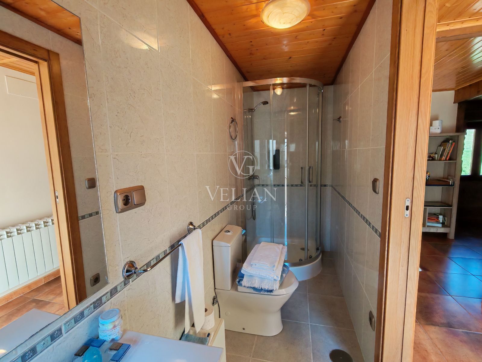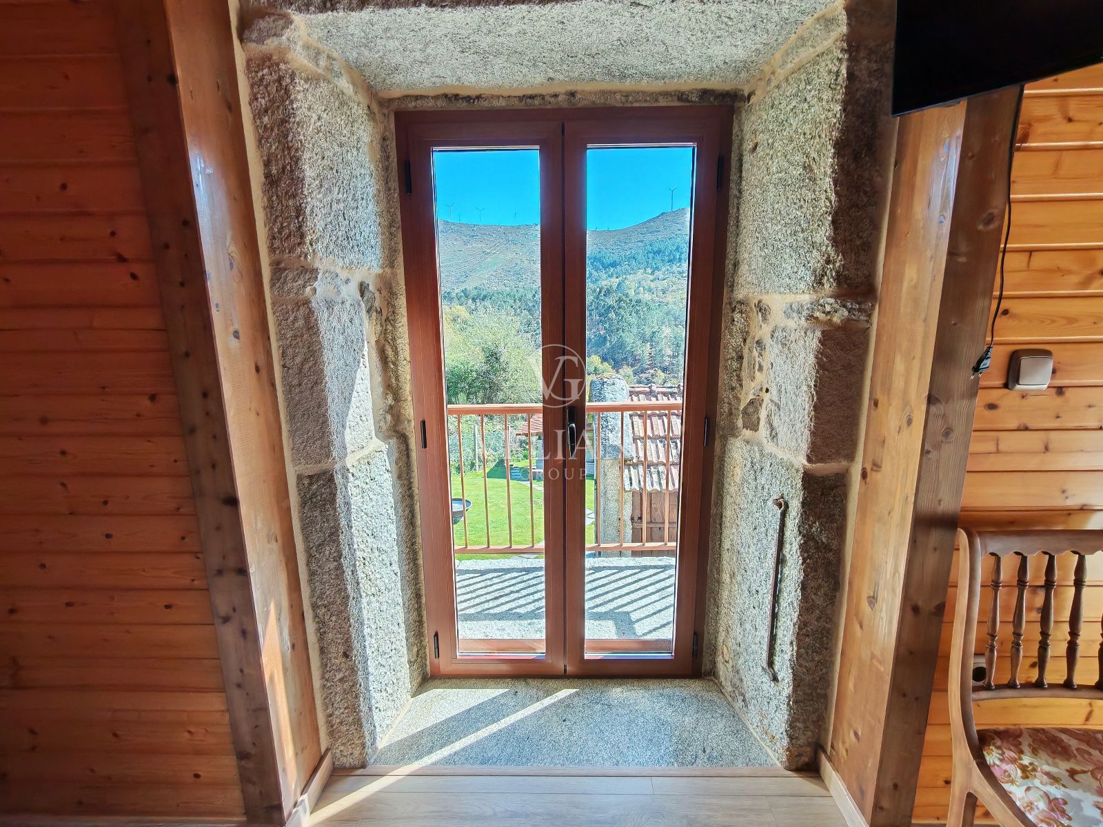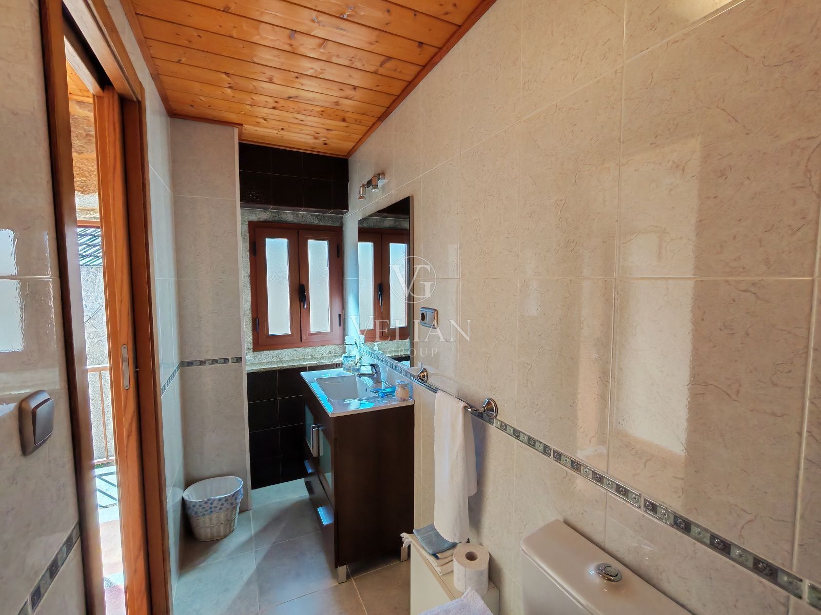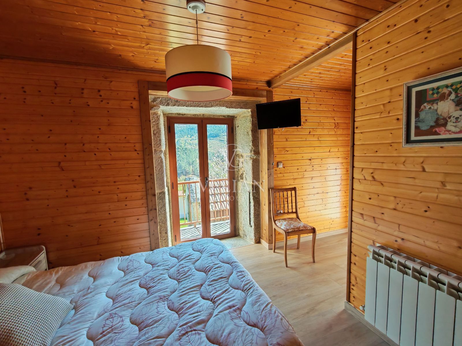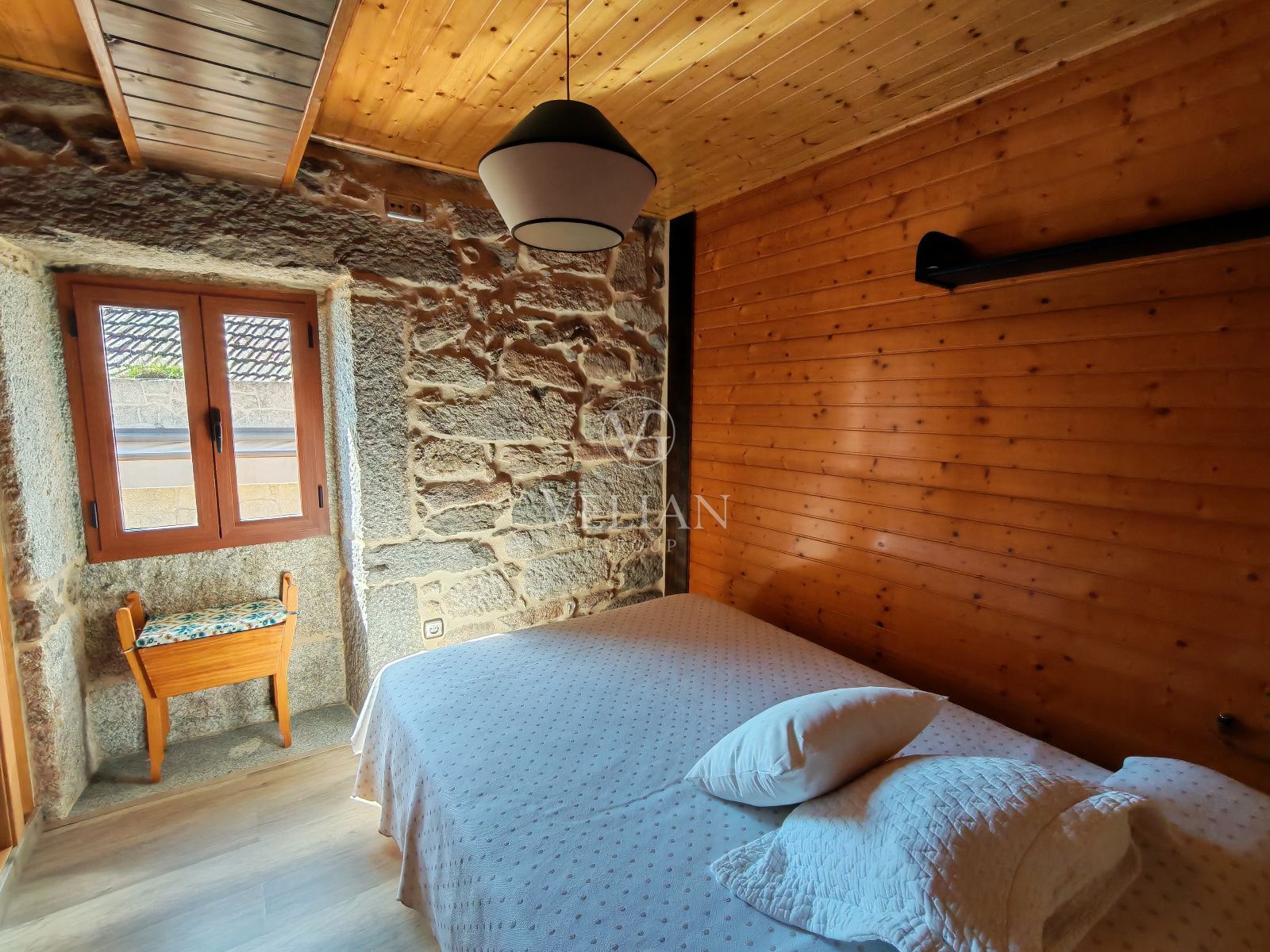 Se distribuye en 5 habitaciones con armarios, una de ellas con balcón y vistas despejadas, 3 baños completos, y una cocina americana integrada al salón-comedor, con chimenea de leña, creando un espacio cálido y acogedor. Desde el salón se accede a una amplia terraza con mesa y sillas, con vistas al jardín, la piscina y un hórreo típico gallego.