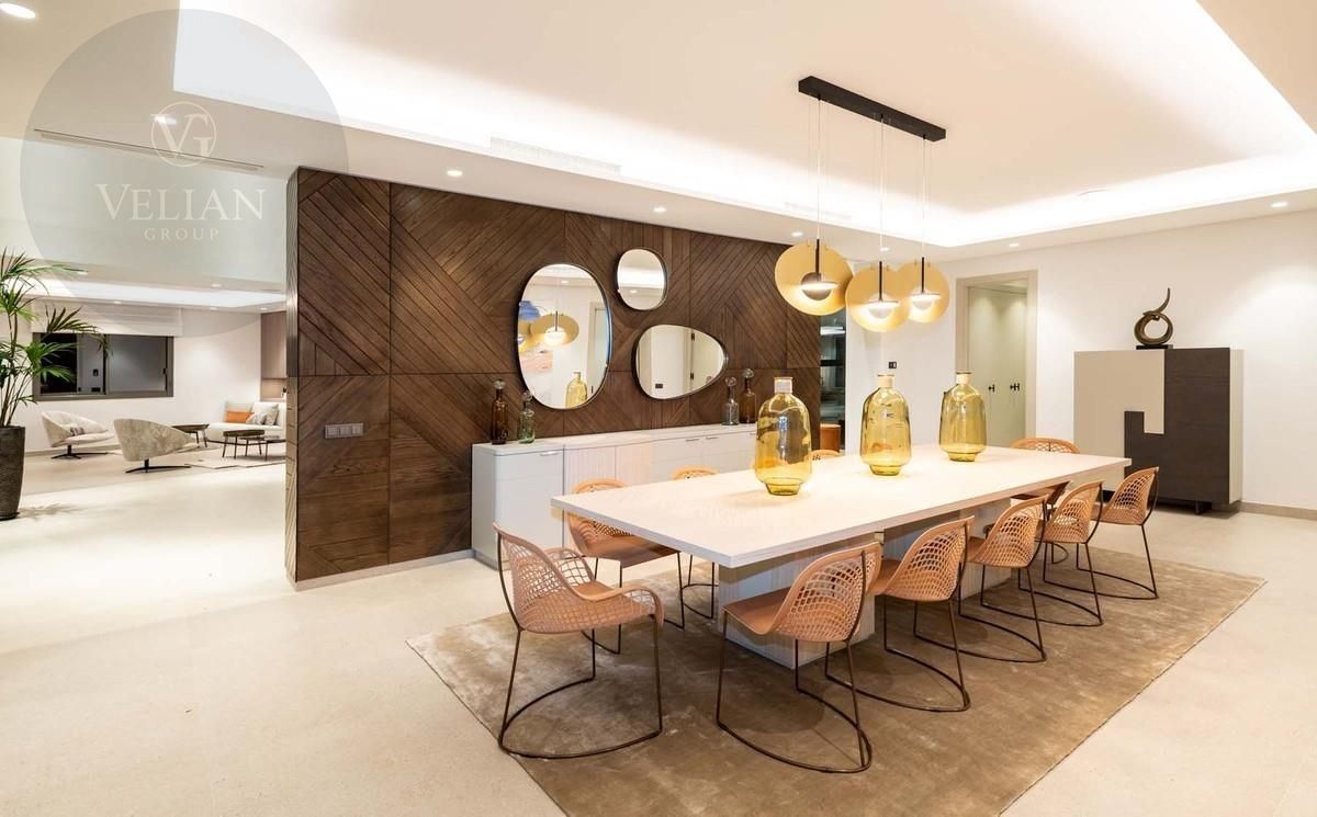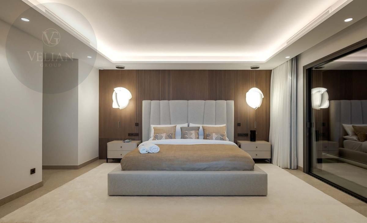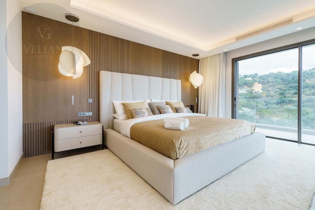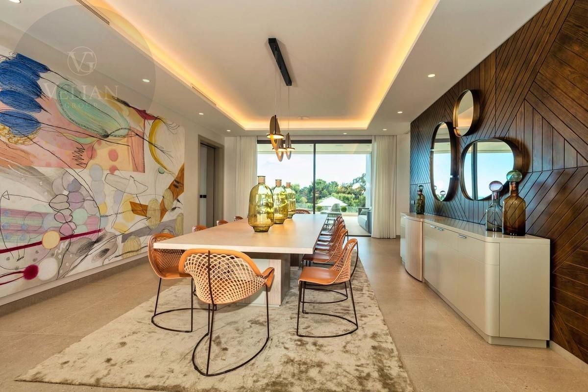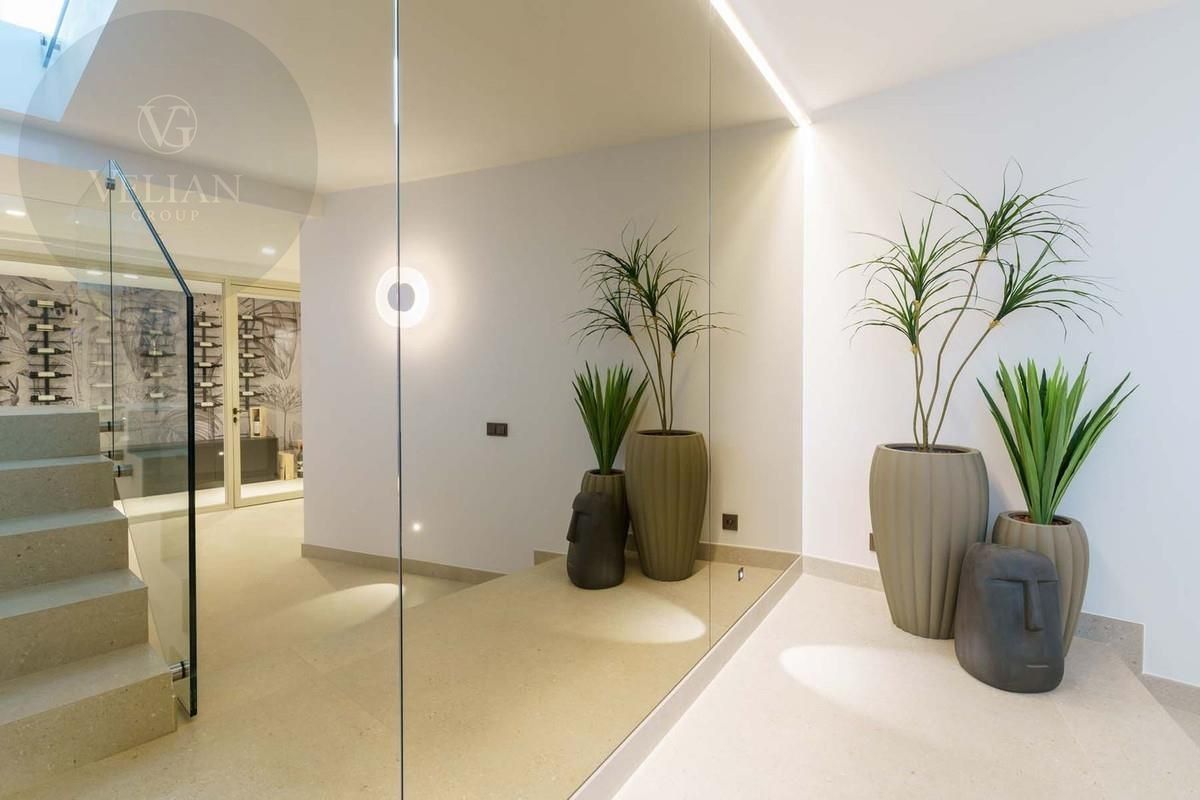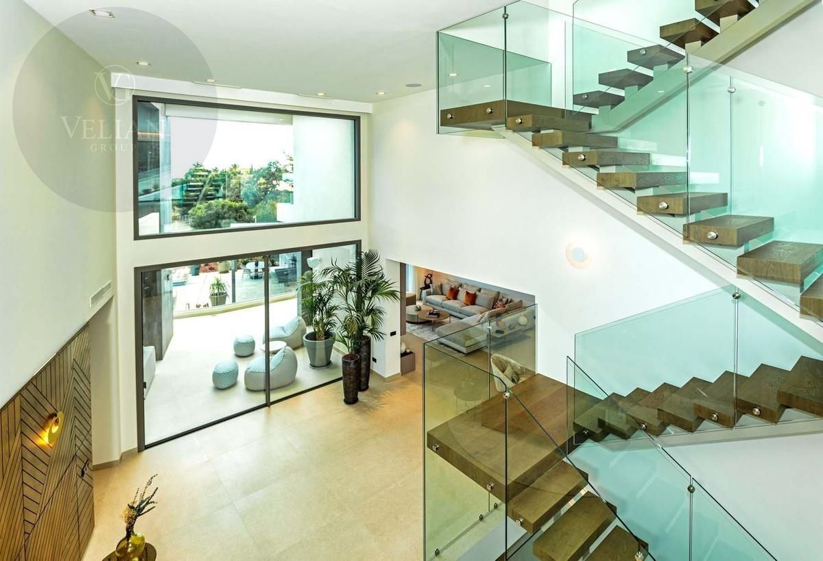 El primer piso está dividido en dos alas, una de las cuales incluye la gran suite principal con vistas panorámicas, baños completos para él y para ella y vestidores y una de las suites para invitados; a través de la galería de vidrio hacia la otra ala hay otra 2 suites para invitados, una de ellas con terraza privada. El nivel inferior de esta villa ofrece un sensacional spa interior completo que cuenta con una piscina climatizada con una máquina de natación contracorriente de alta gama, sauna, baño de vapor, baño completo y zona para cambiarse. Un gimnasio totalmente equipado, amplia sala de entretenimiento con mesa de billar, bar y sala de estar. Una bodega climatizada. Un dormitorio doble es un apartamento de invitados que incluye cocina totalmente equipada y baño. Un solárium en la azotea que constituye la zona chill out perfecta para sentarse y disfrutar de las inmejorables vistas. Sistema domótico, calefacción por suelo radiante en toda la propiedad, sistema de calefacción y aire acondicionado integrado, sistema de sonido en toda la propiedad, incluidas las zonas de terraza exterior