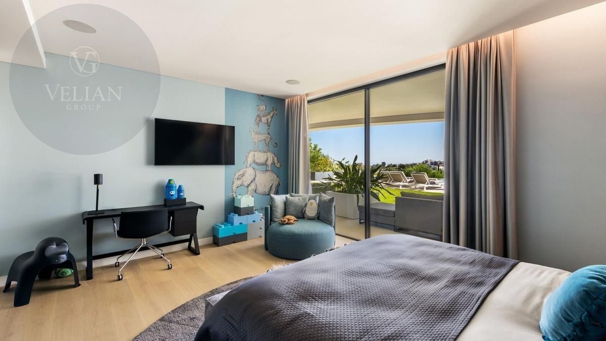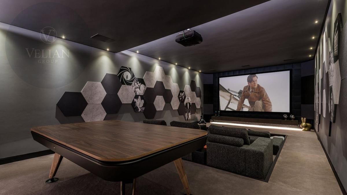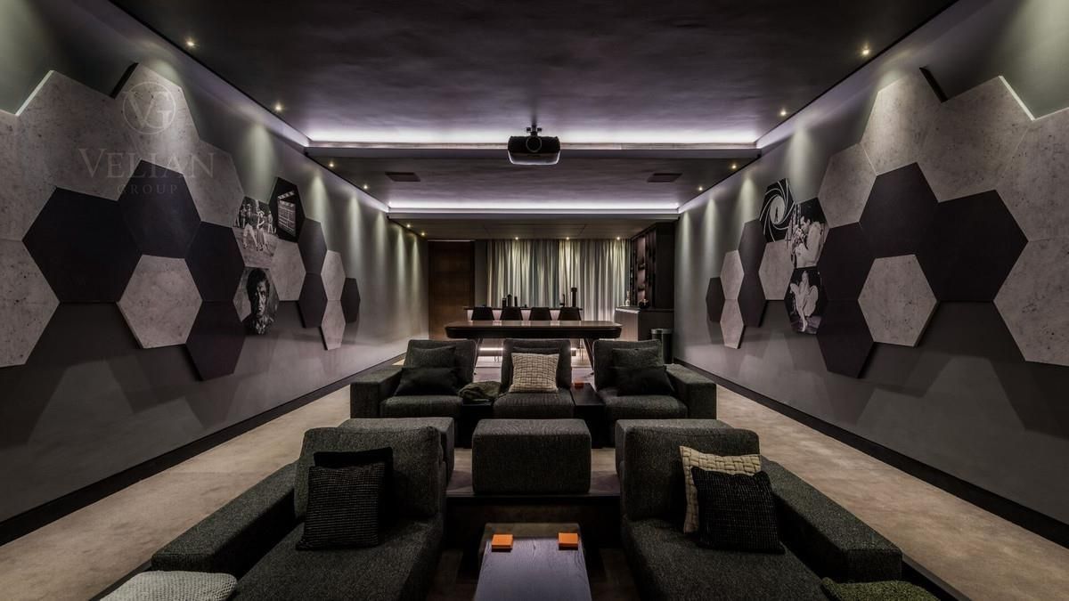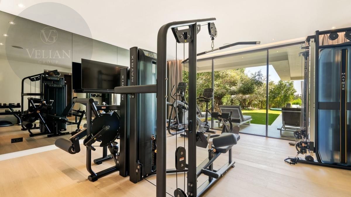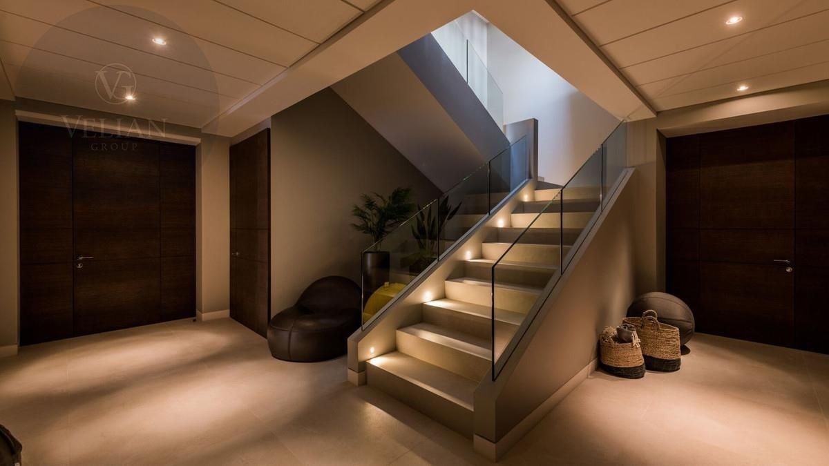 Desde el vestíbulo principal, descendemos un nivel donde hay 4 amplios dormitorios con baños en suite y todos con acceso directo a los exuberantes jardines y piscina más allá. En este nivel, también hay un gimnasio completo y sauna, bodega y cine en casa, con cocina de hospitalidad por Siematic, y zona de juegos. El garaje cerrado tiene capacidad para 4 coches y también hay un lavadero independiente. Los jardines adyacentes están cuidadosamente cuidados y rodean la piscina infinita con cocina exterior y barbacoa de Siematic con zona para sentarse. Para las noches más frescas los huéspedes también pueden disfrutar de una segunda zona de fogata en el jardín.