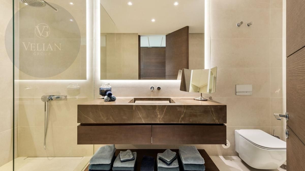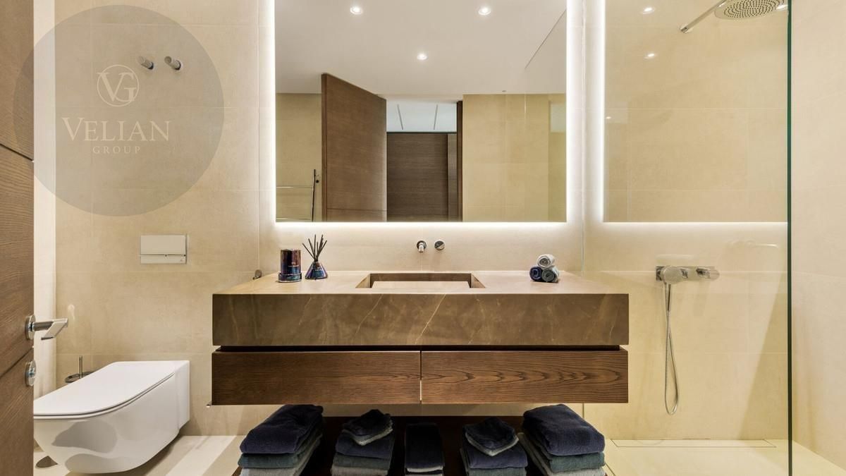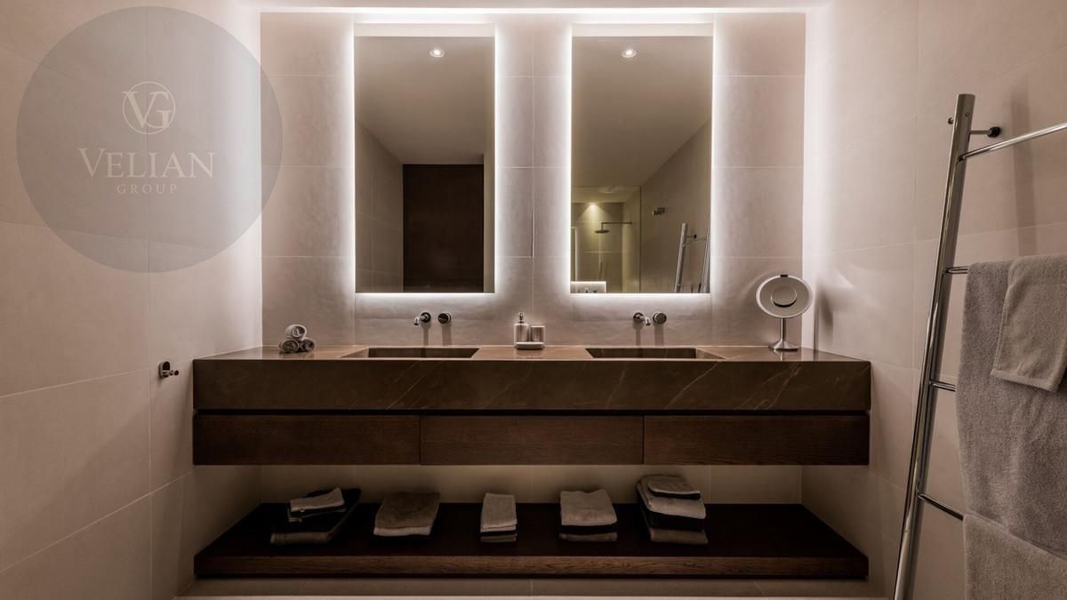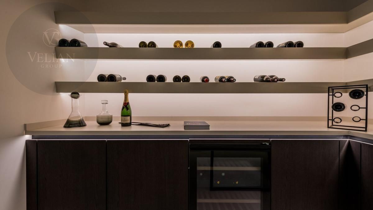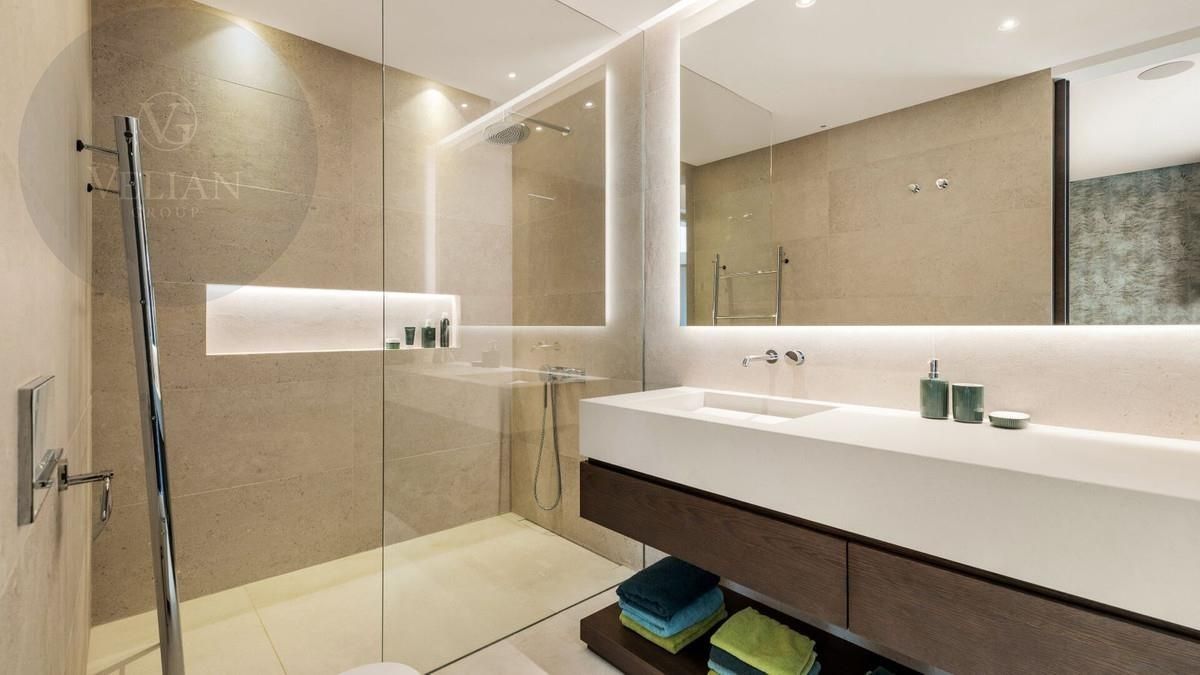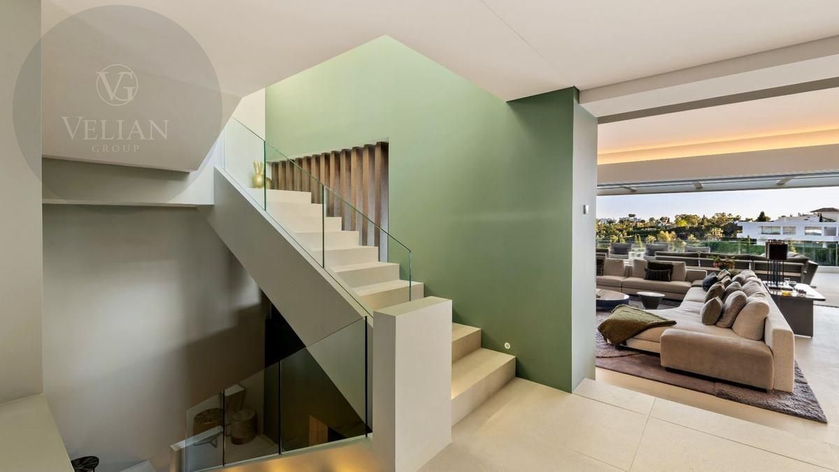 La entrada principal con gran vestíbulo, baño de invitados y ascensor, conduce a la gran sala de estar y comedor de planta abierta con cocina de diseño de Siematic que incluye electrodomésticos Gaggenau. También hay acceso de servicio a la cocina desde el puerto de coches en la entrada de la calle a la villa. En la zona de estar, las silenciosas ventanas eléctricas desaparecen cuidadosamente en las paredes revestidas de piedra para llevarnos a la generosa terraza flotante donde podemos disfrutar de las magníficas vistas al Mediterráneo y al campo de golf. En este nivel de la villa también se encuentra el lujoso dormitorio principal con terraza privada, baño en suite y vestidor privado.