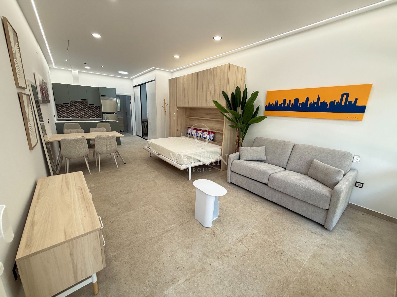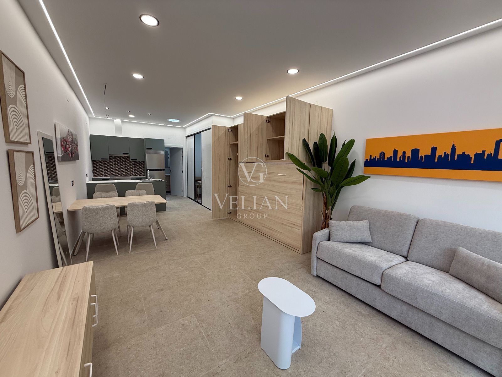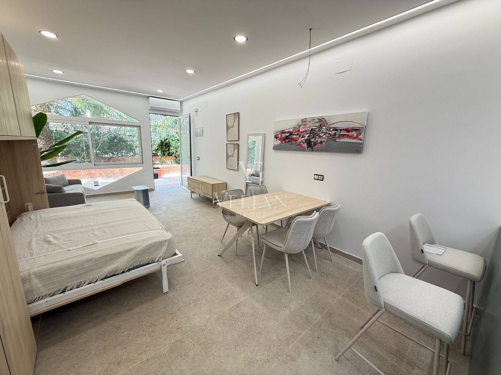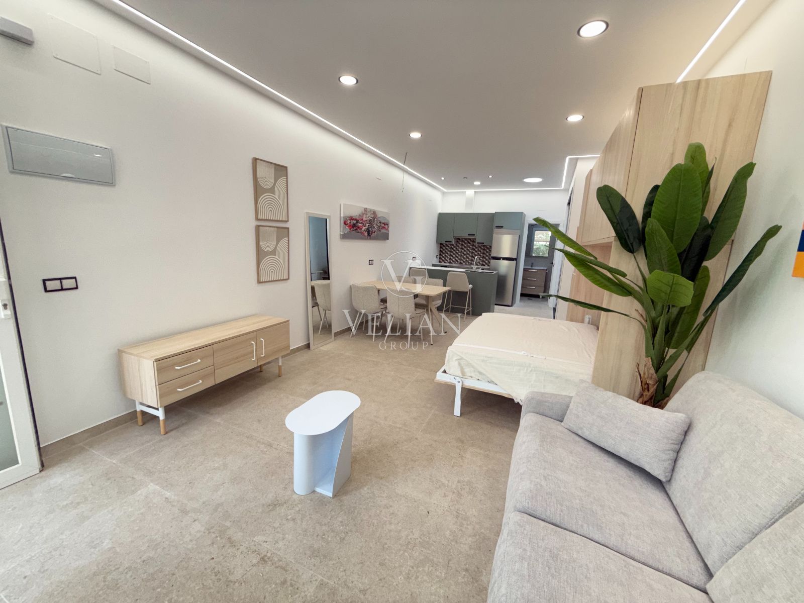 * 2 estudios de aproximadamente 43 m² cada uno, con salón-comedor con cocina americana, baño completo y espacio optimizado para sofá cama.