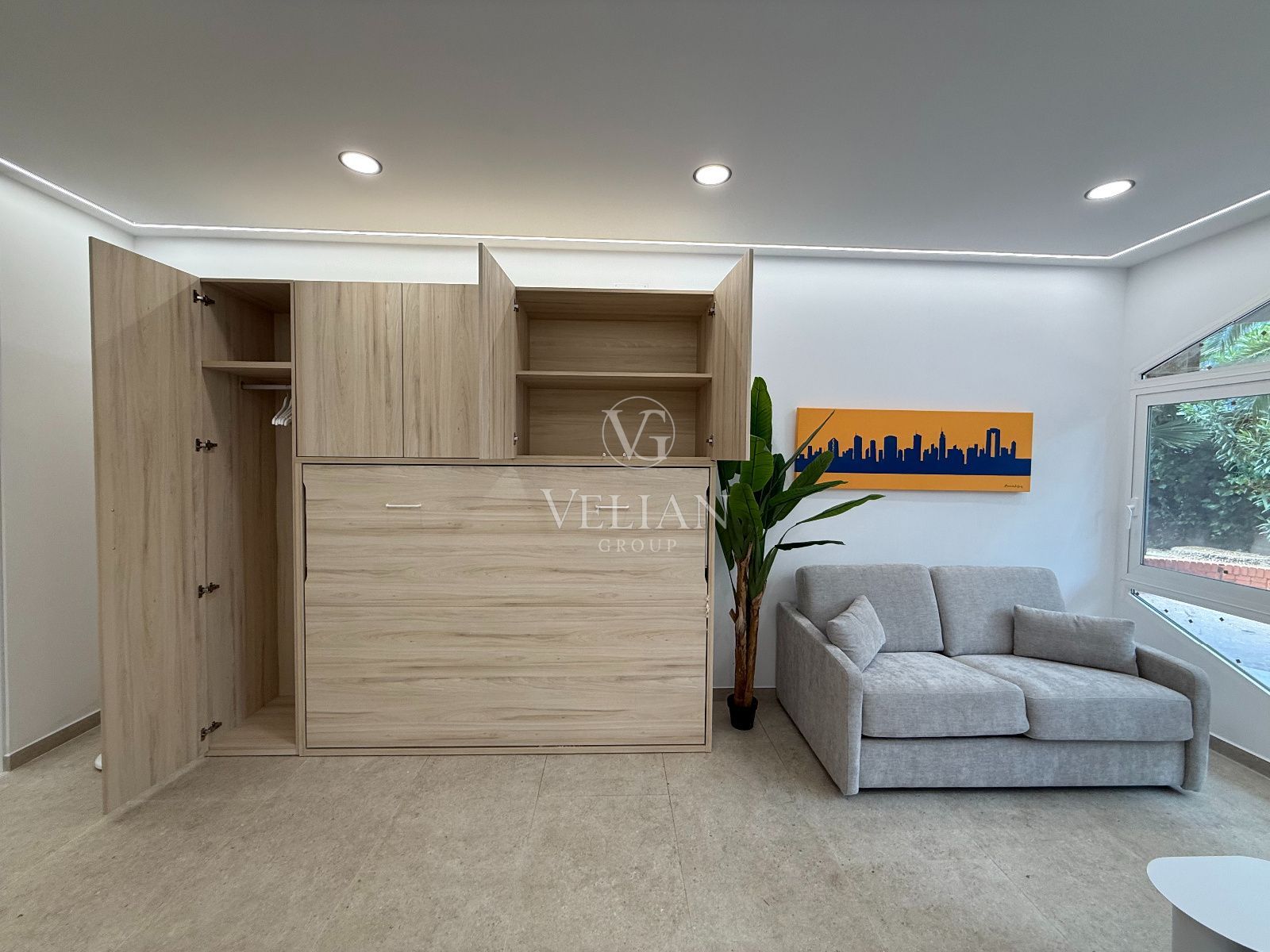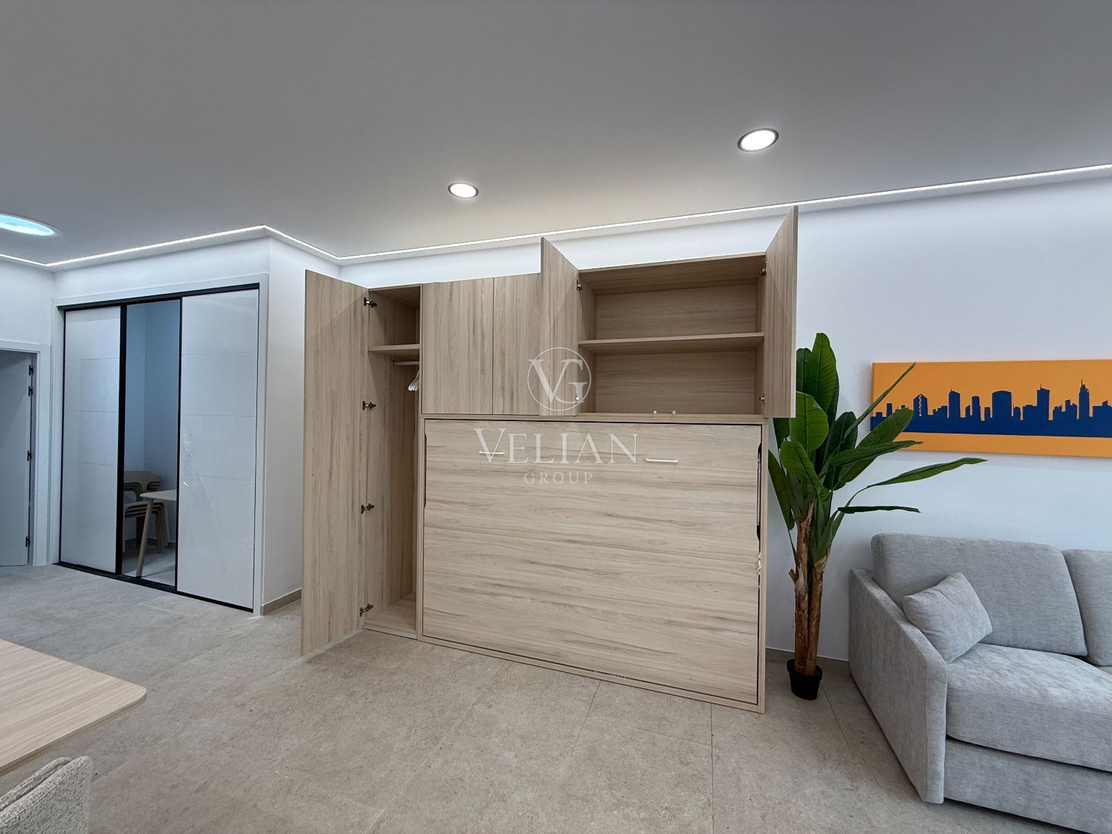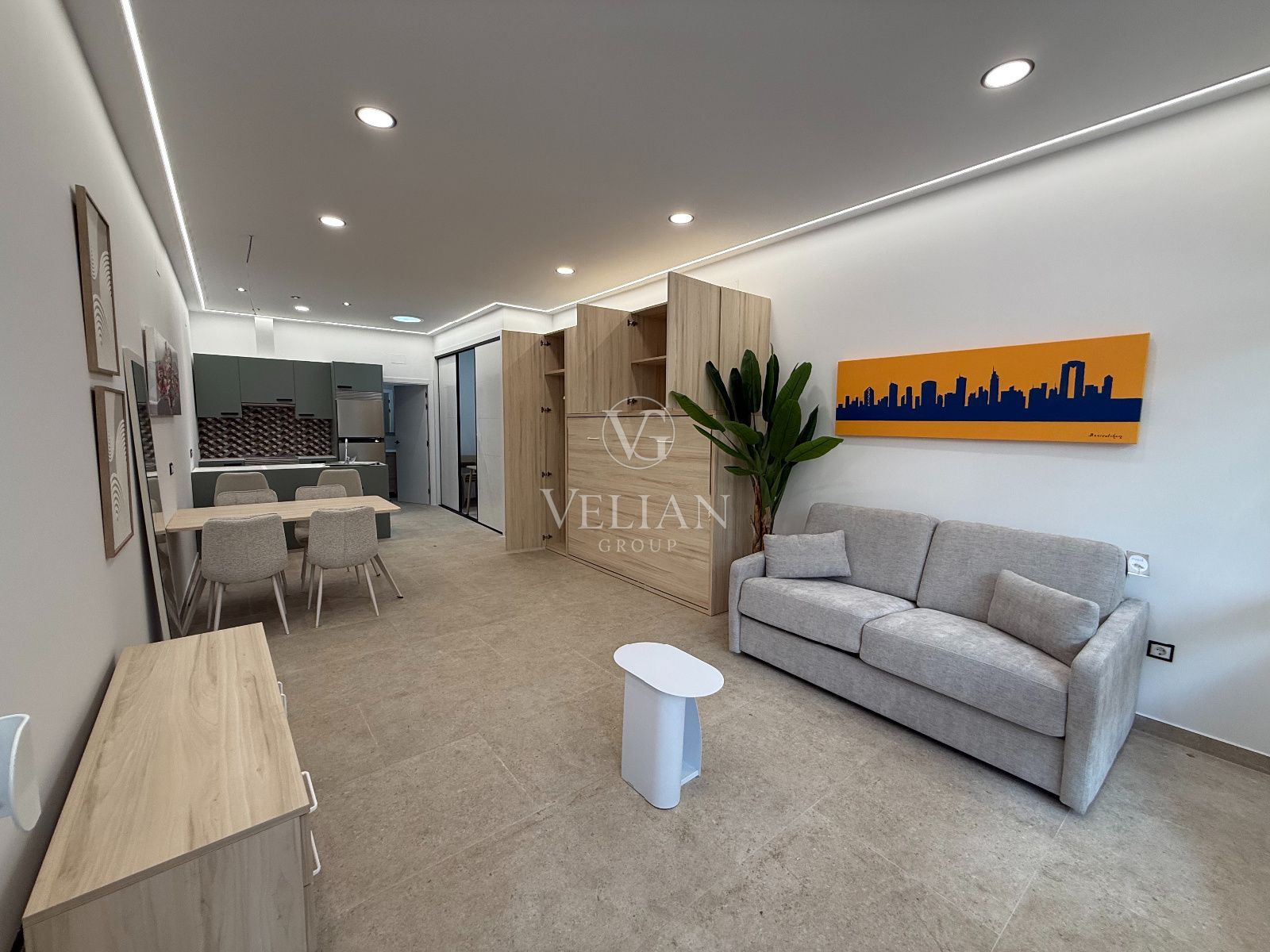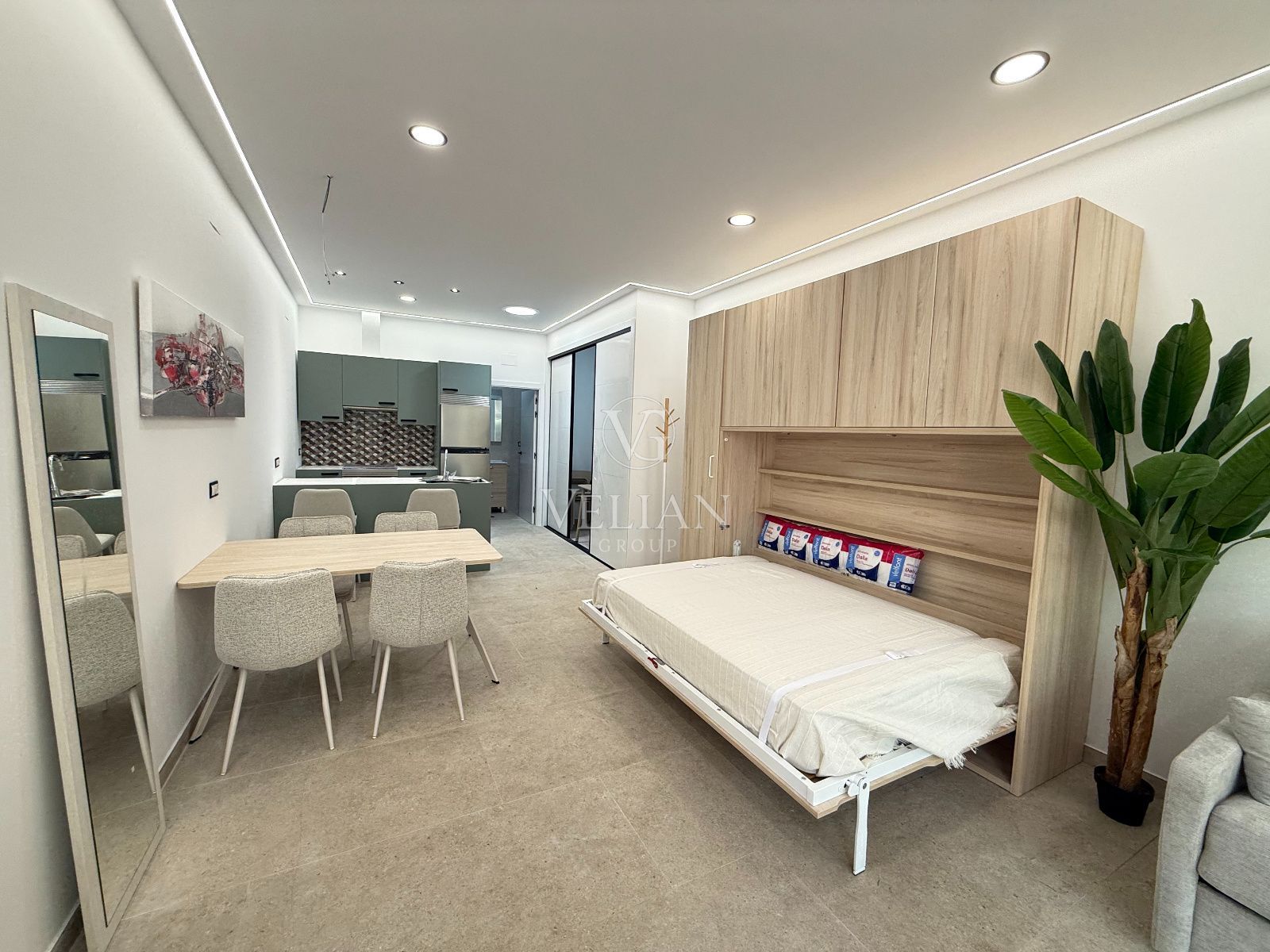 * 2 estudios de aproximadamente 43 m² cada uno, con salón-comedor con cocina americana, baño completo y espacio optimizado para sofá cama.