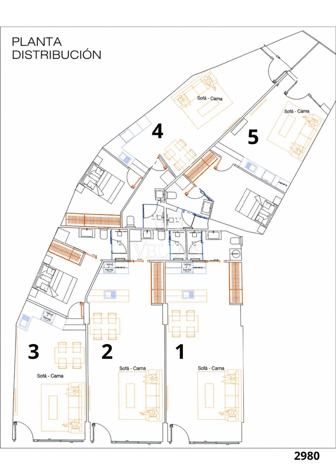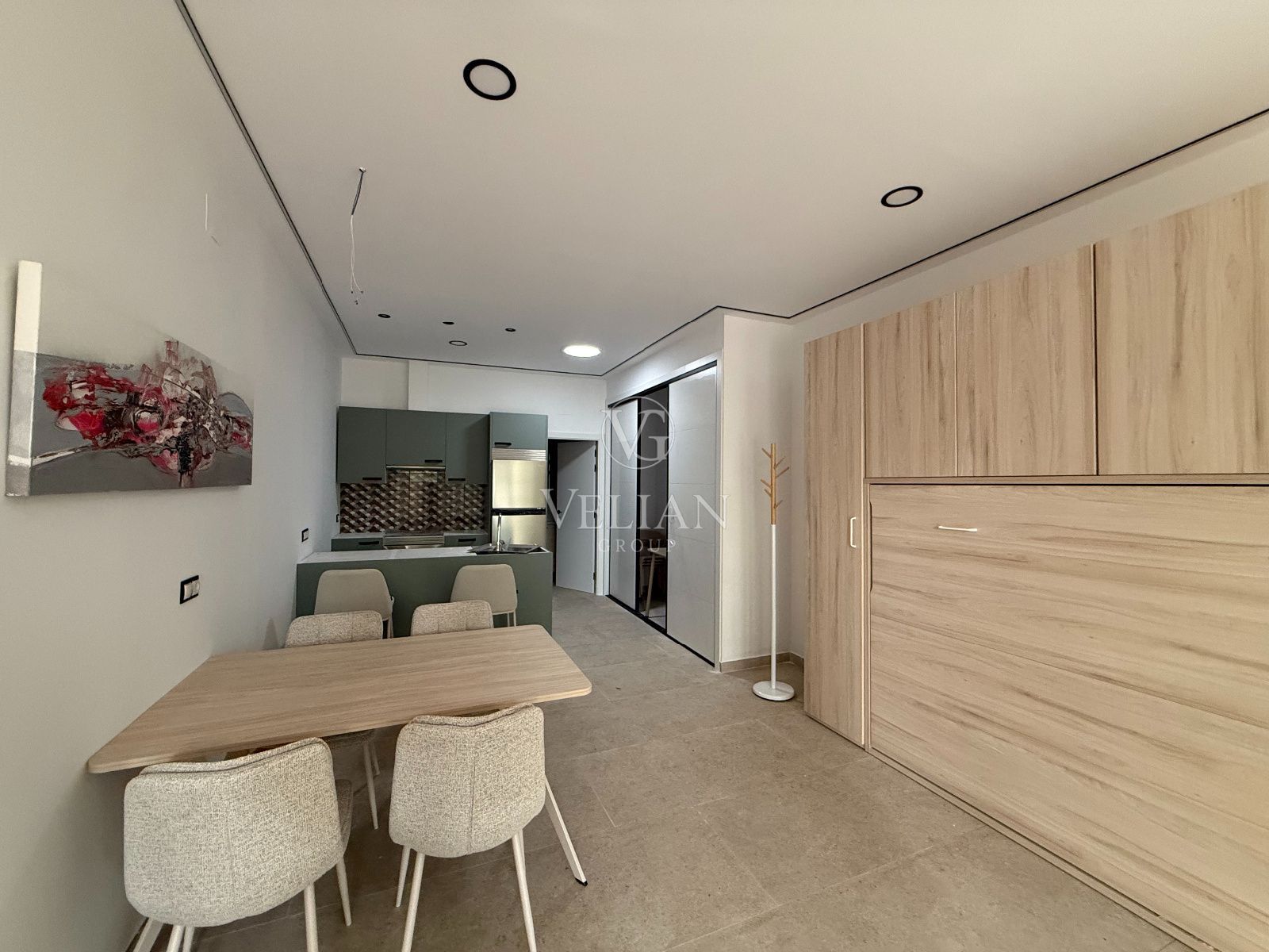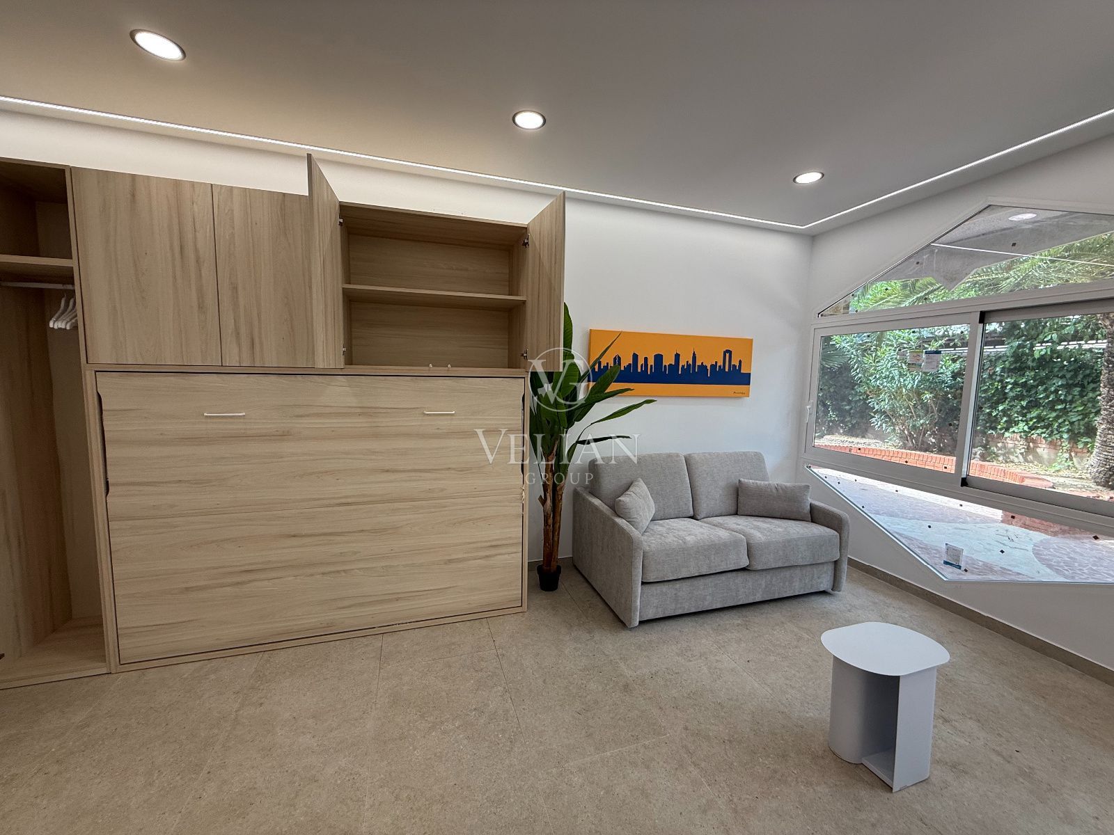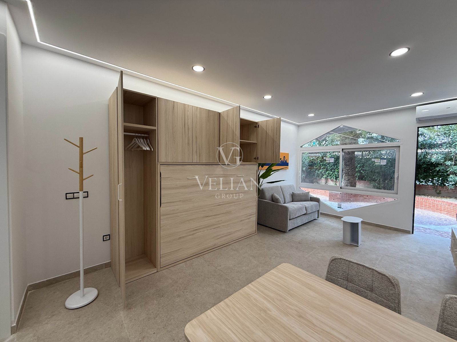 * 2 estudios de aproximadamente 43 m² cada uno, con salón-comedor con cocina americana, baño completo y espacio optimizado para sofá cama.