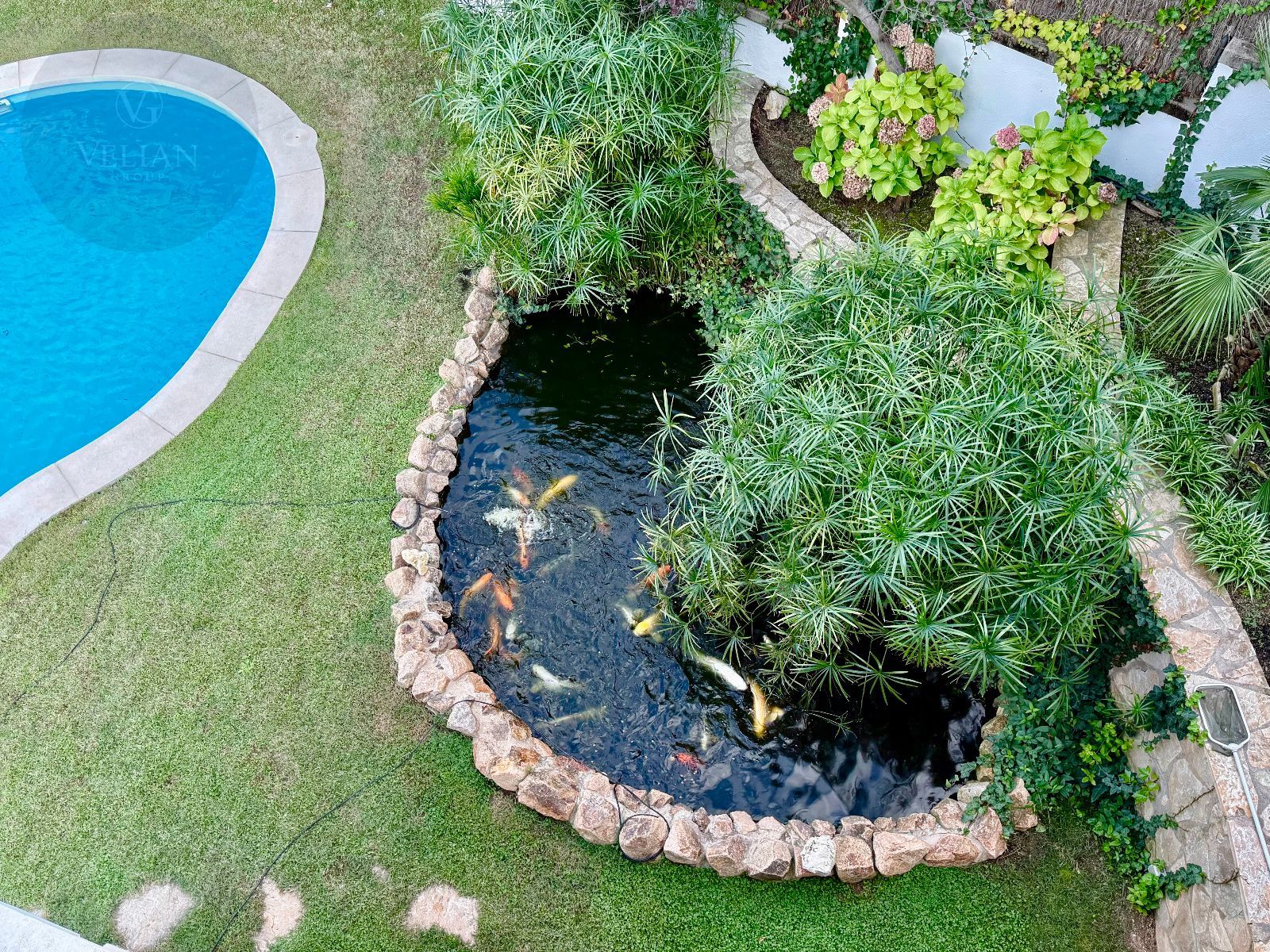 El exterior de la finca ofrece una magnífica piscina privada, de agua salada, estanco de agua, varias terrazas conectadas con las habitaciones y zonas ajardinadas que garantizan intimidad, además de vistas despejadas hacia la montaña. Está rodeada de almendros, que aportan gran privacidad.