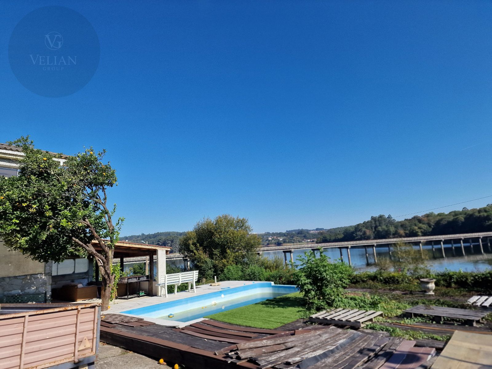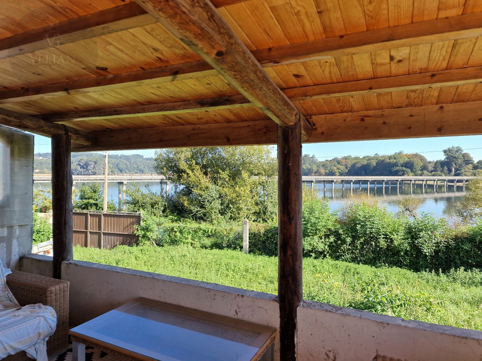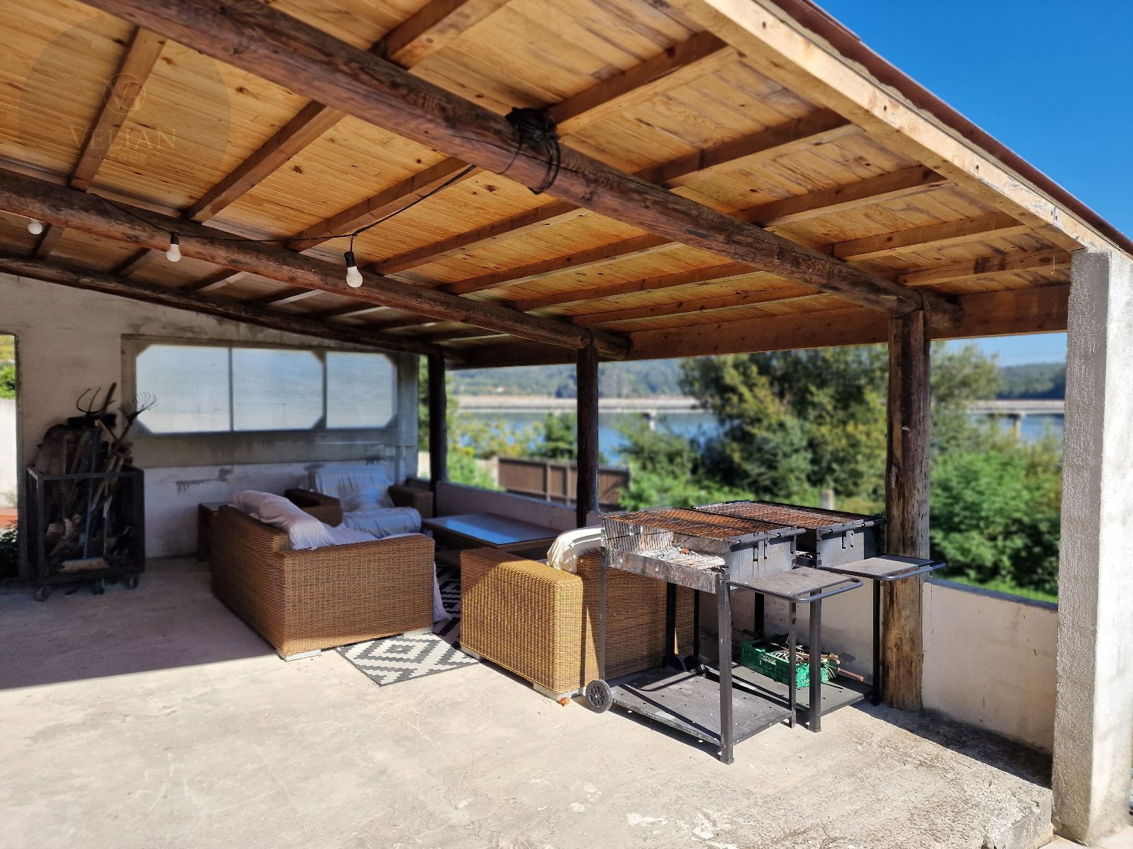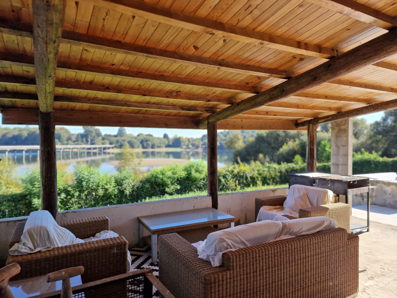 En el exterior, la finca incluye una galería cubierta con barbacoa, perfecta para disfrutar de comidas al aire libre con vistas directas al lago, además de amplias zonas verdes con gran potencial paisajístico.