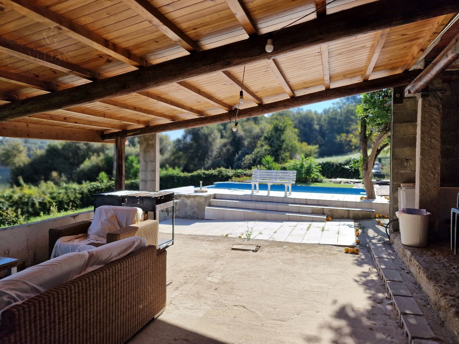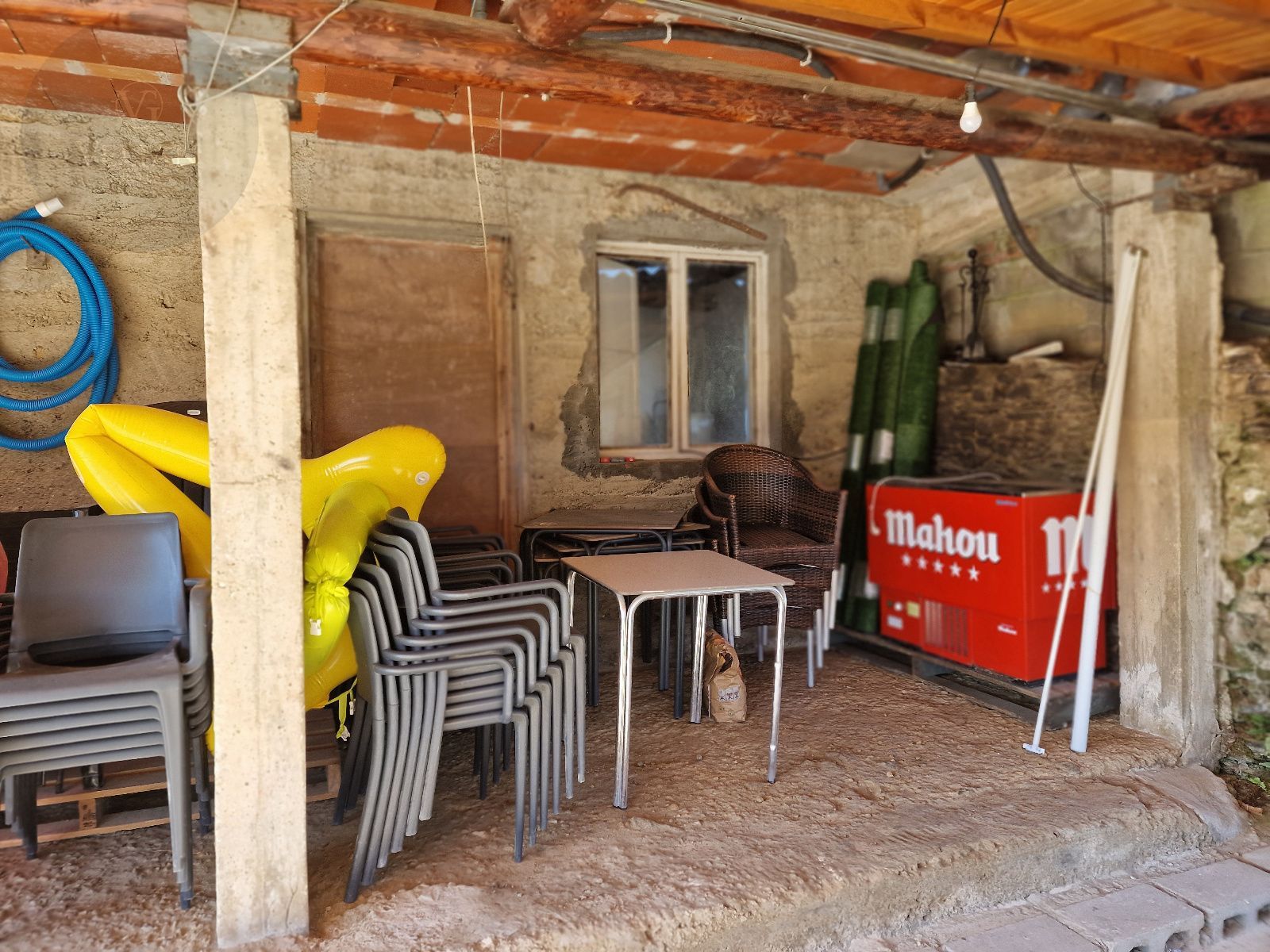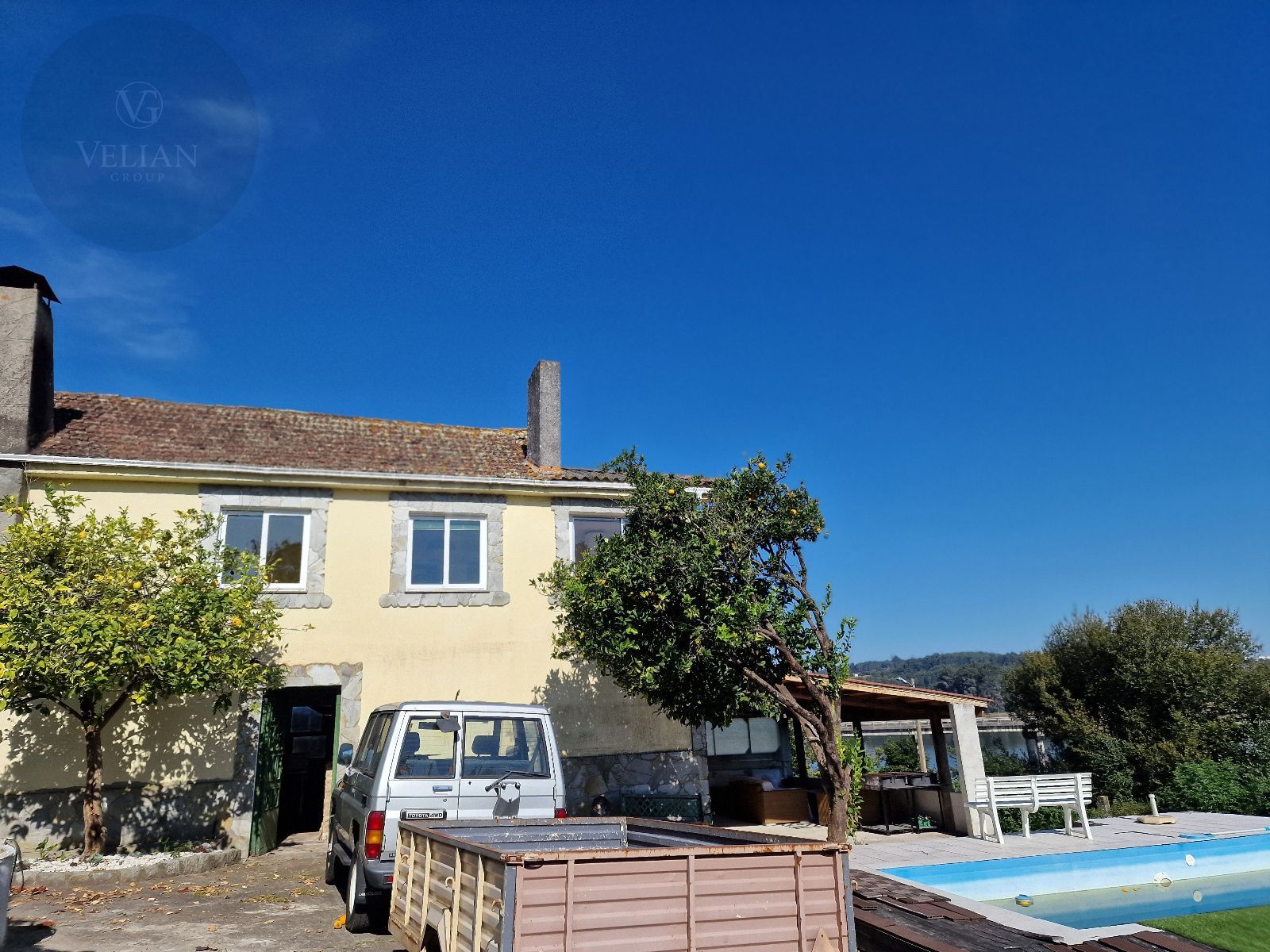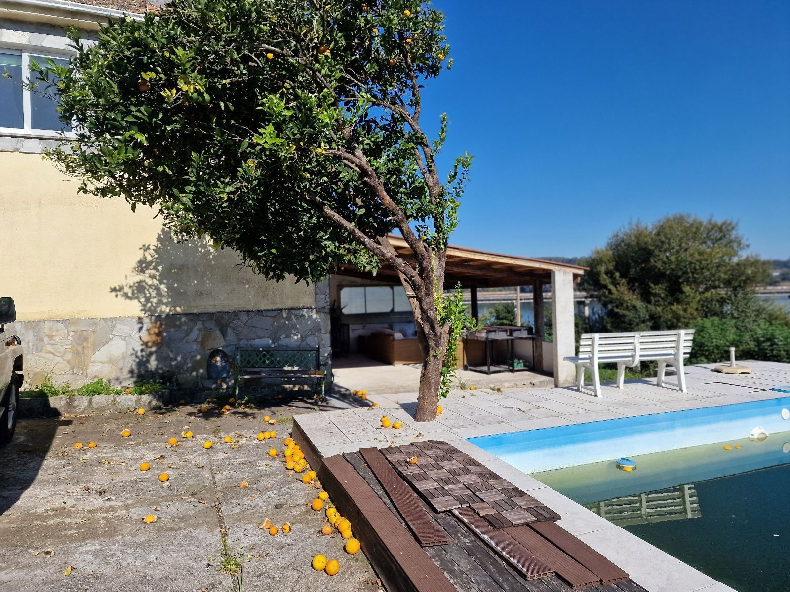 En el exterior, la finca incluye una galería cubierta con barbacoa, perfecta para disfrutar de comidas al aire libre con vistas directas al lago, además de amplias zonas verdes con gran potencial paisajístico.