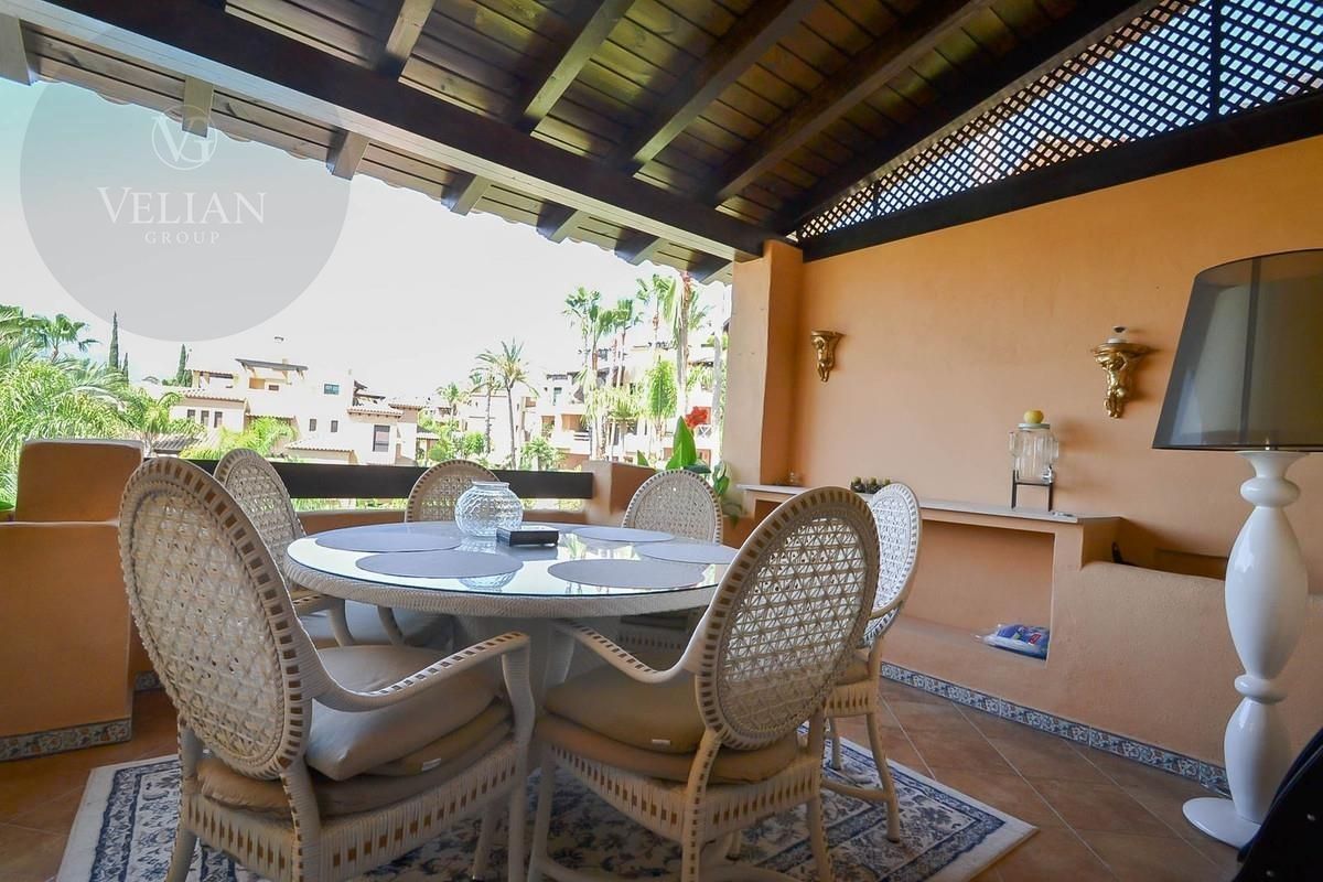 Esta terraza está orientada al sur con fantásticas vistas al mar, la montaña y los jardines y la piscina comunitarios, , comedor y cocina con barbacoa.