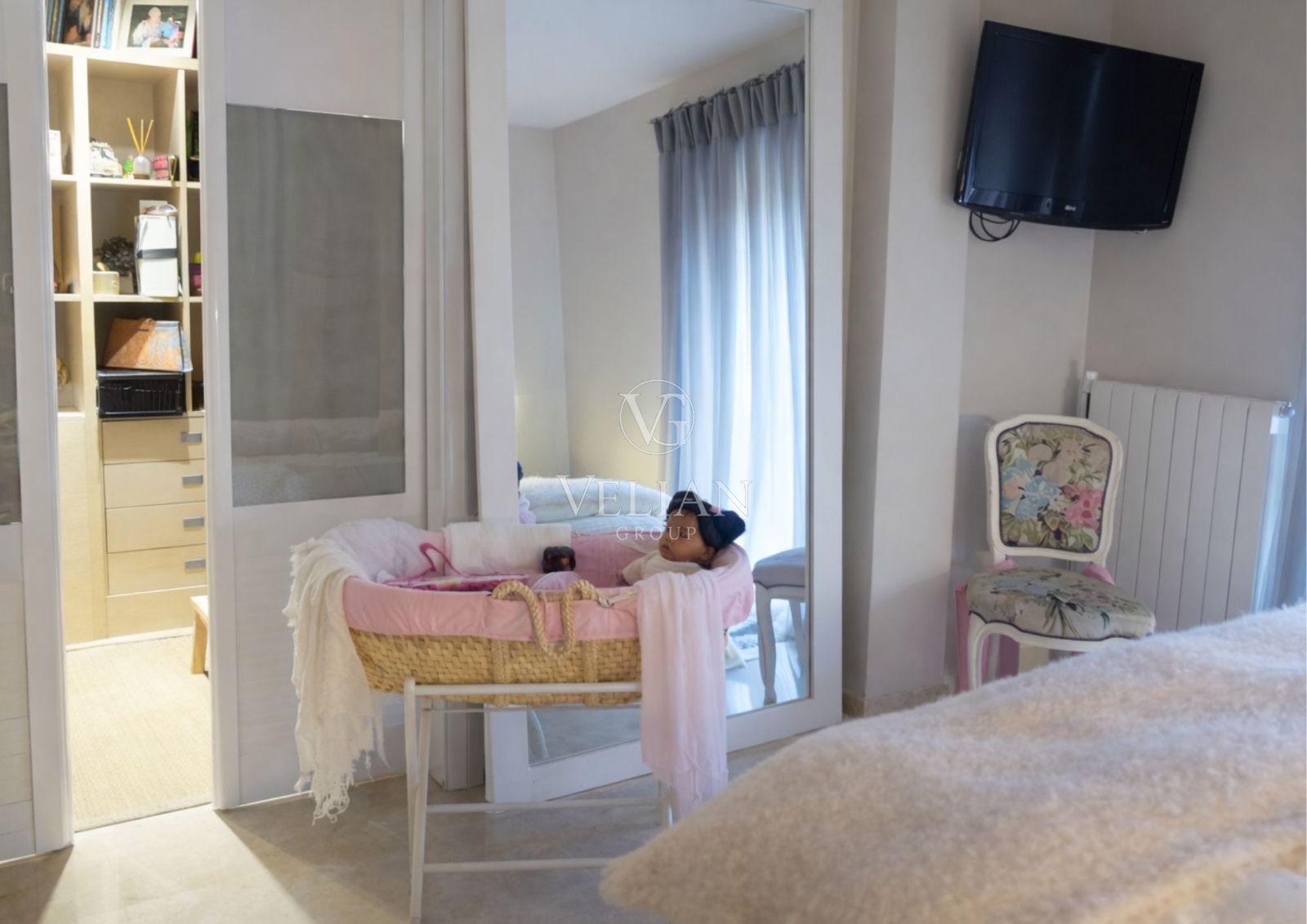 La primera planta alberga el dormitorio principal con vestidor y baño en suite, junto a dos dormitorios adicionales con armarios empotrados y un baño completo.