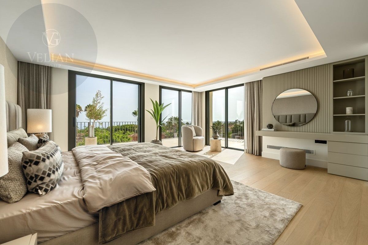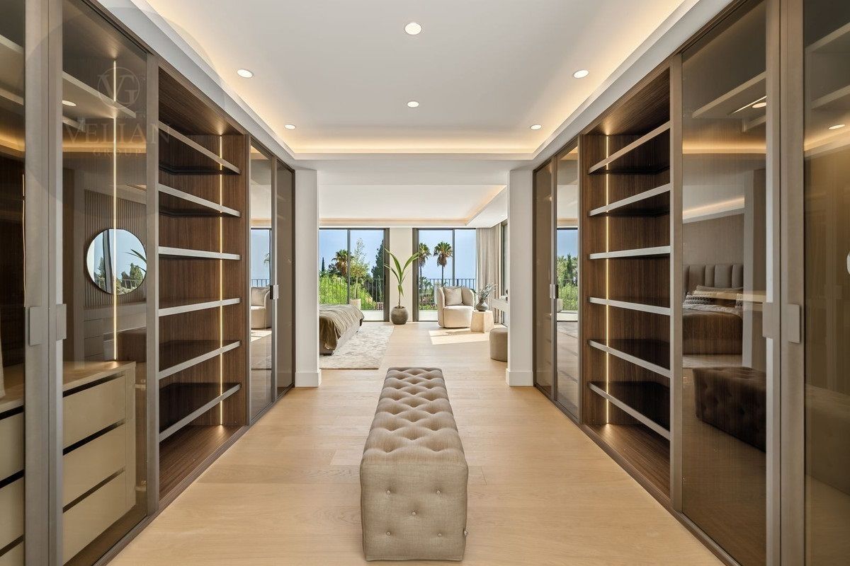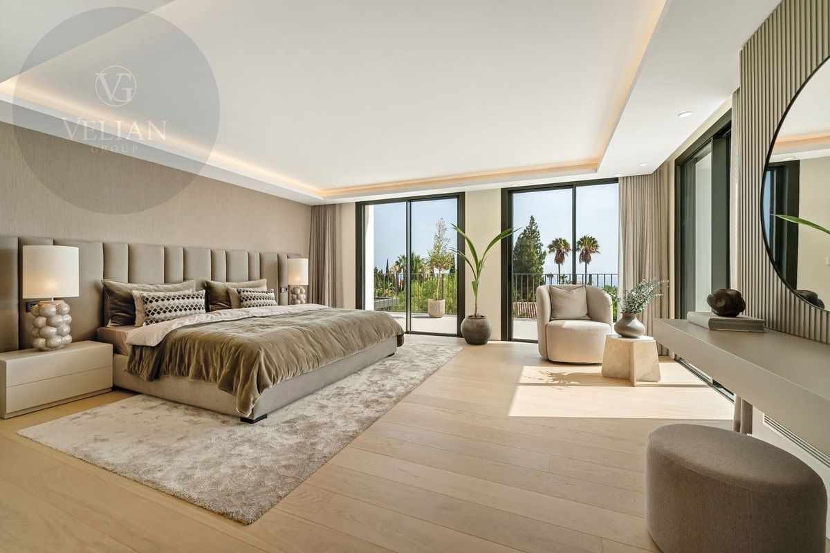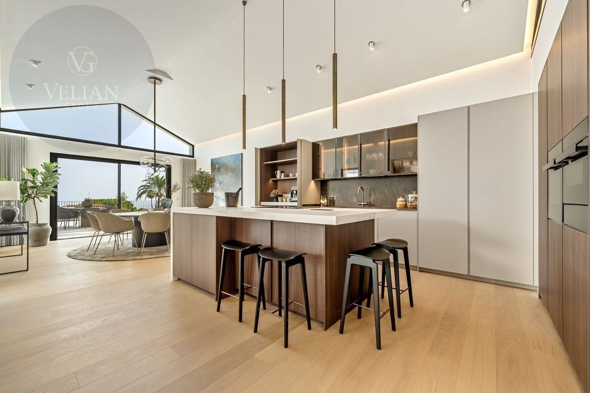 El espacio principal está compuesto por un amplio salón y comedor de planta abierta que giran en torno a una cocina de diseño con isla central. La villa dispone de cinco suites de dormitorio, entre ellas una suite principal con terraza privada, vistas panorámicas al mar y un vestidor de diseño abierto.