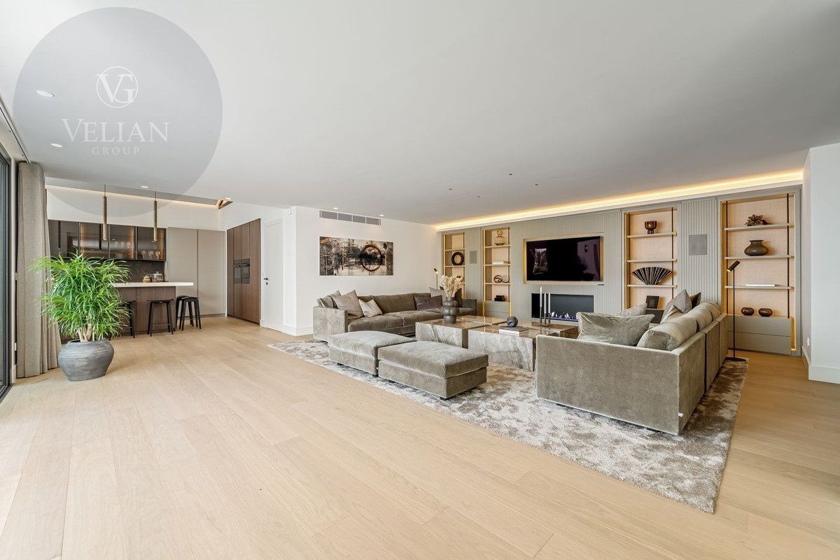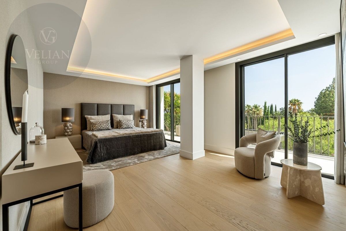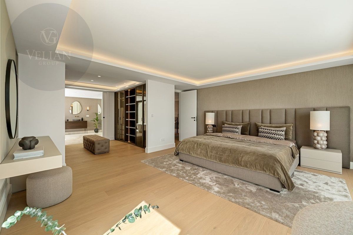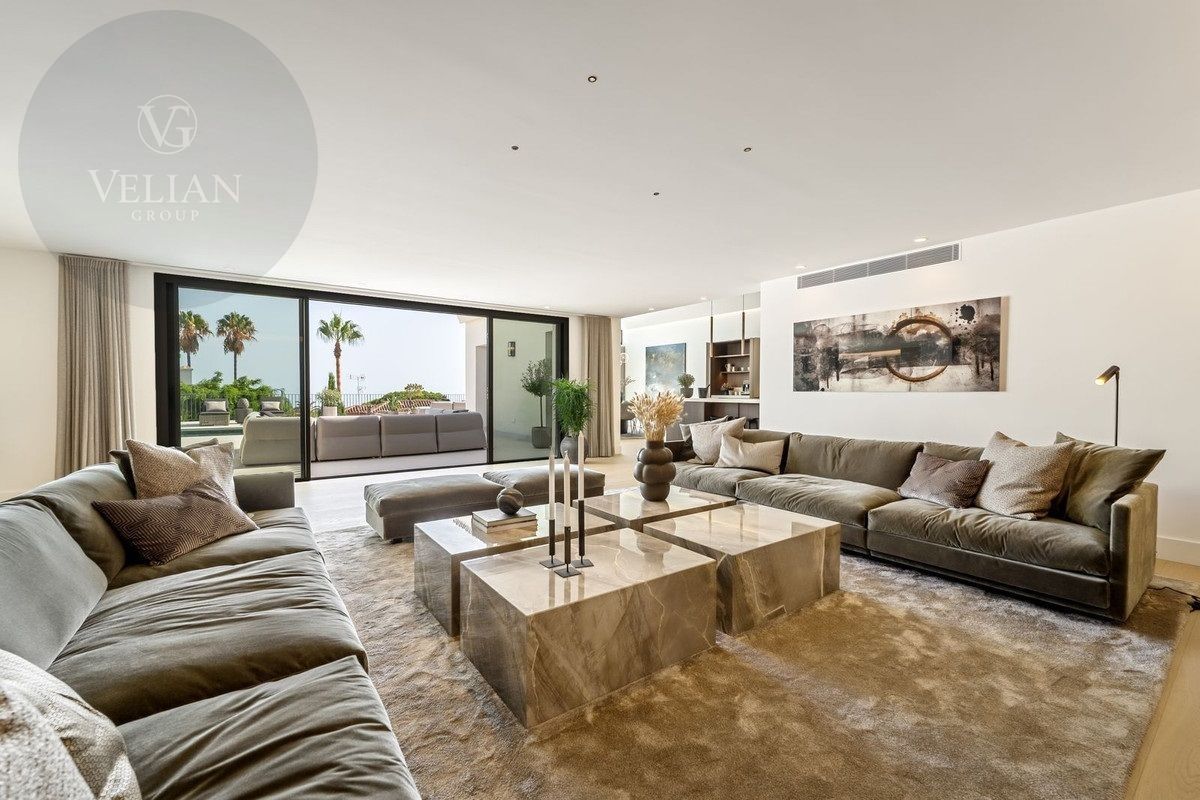 El espacio principal está compuesto por un amplio salón y comedor de planta abierta que giran en torno a una cocina de diseño con isla central. La villa dispone de cinco suites de dormitorio, entre ellas una suite principal con terraza privada, vistas panorámicas al mar y un vestidor de diseño abierto.