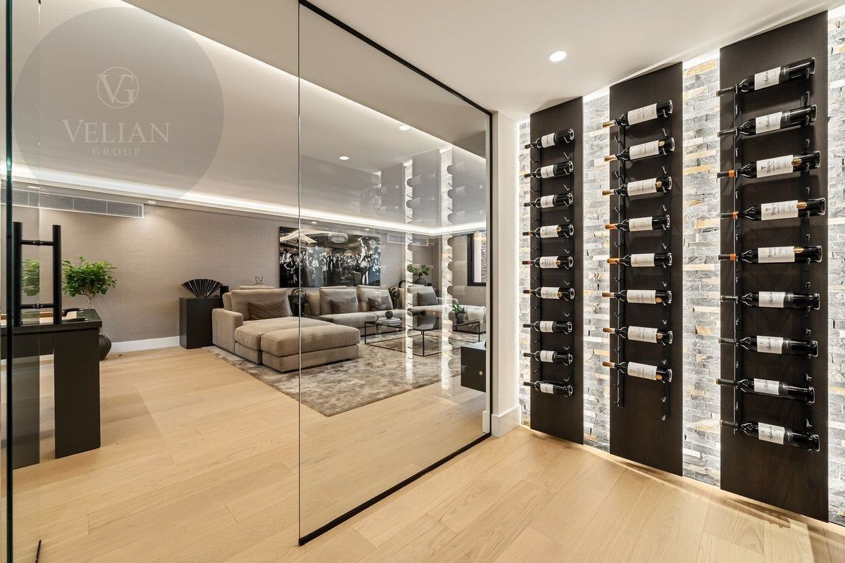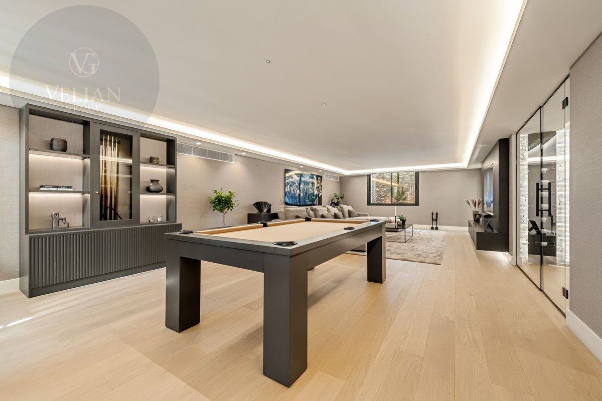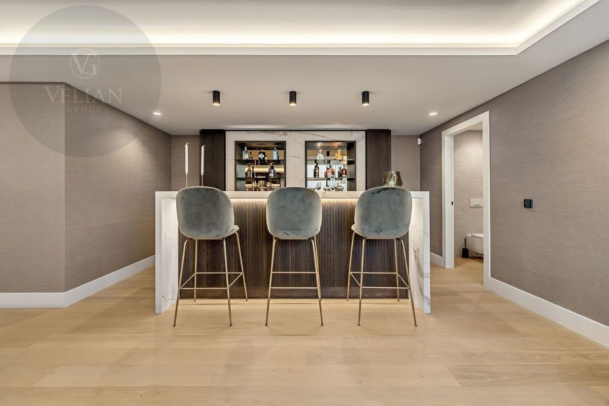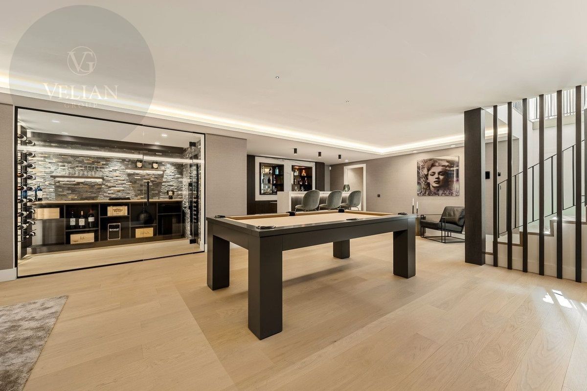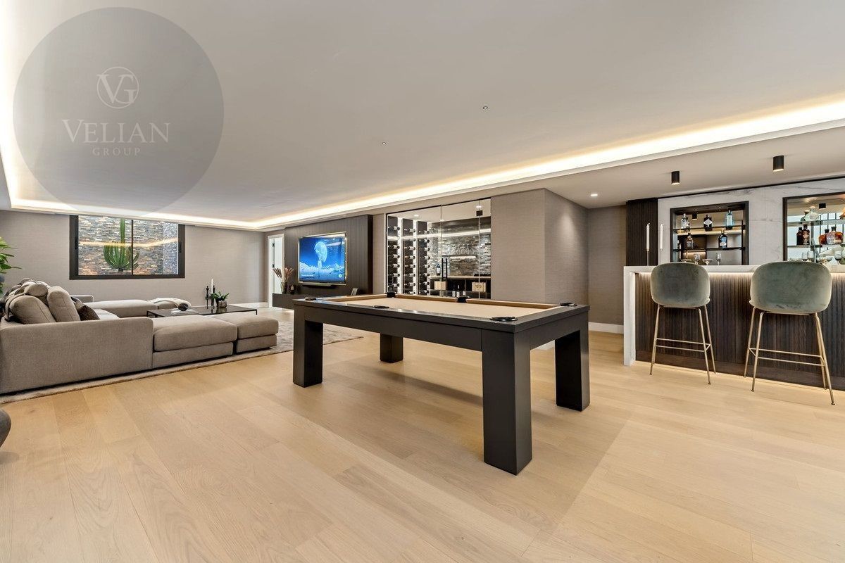 La planta inferior está pensada para el entretenimiento, con un elegante salón con bar, bodega acristalada y mesa de billar, además de dos aseos de cortesía y generosas zonas de almacenamiento.