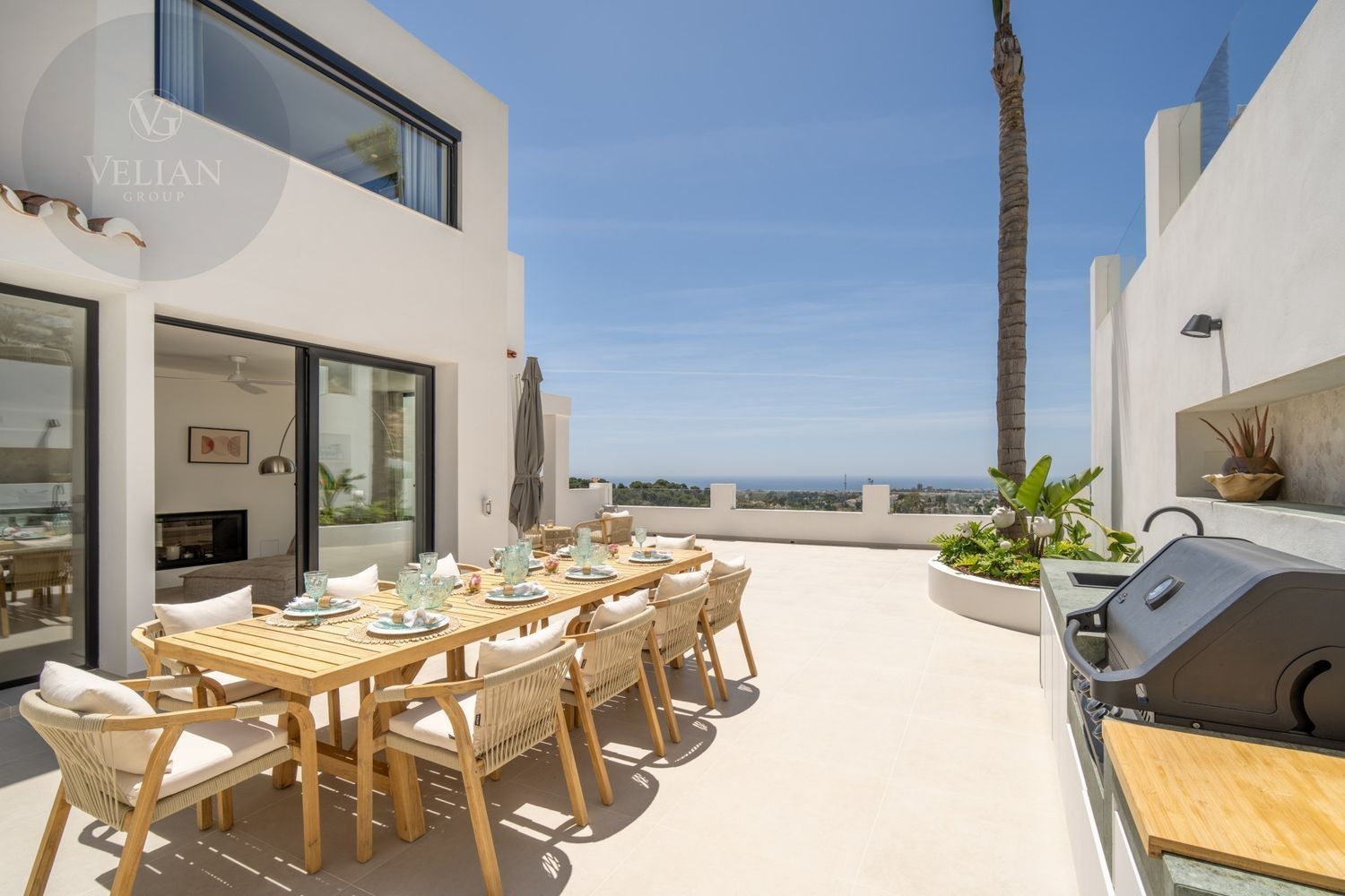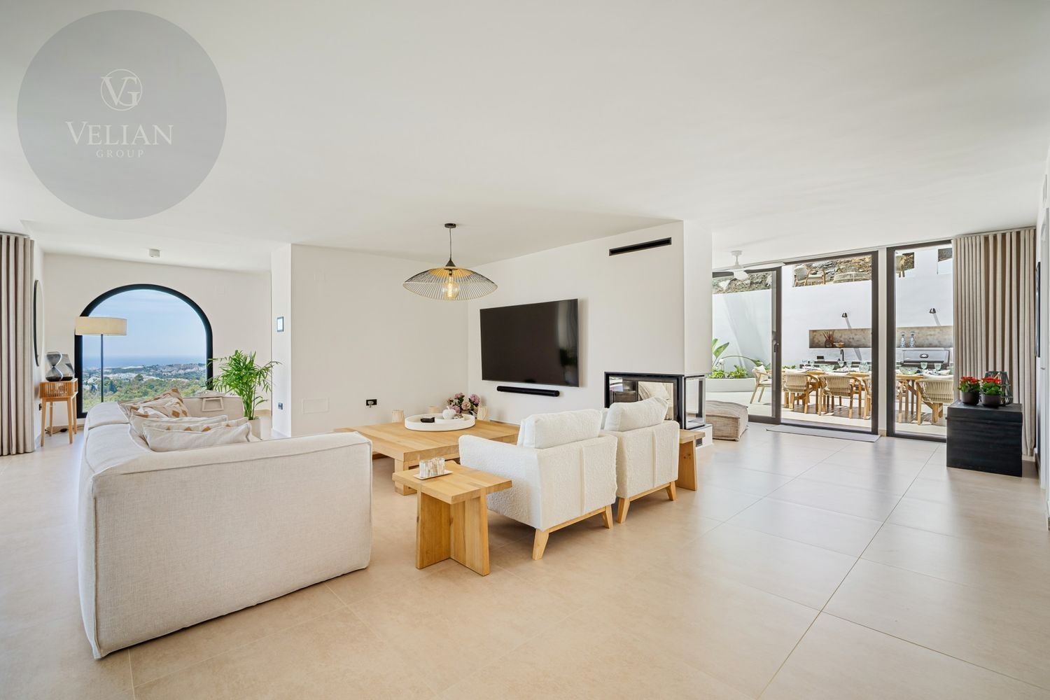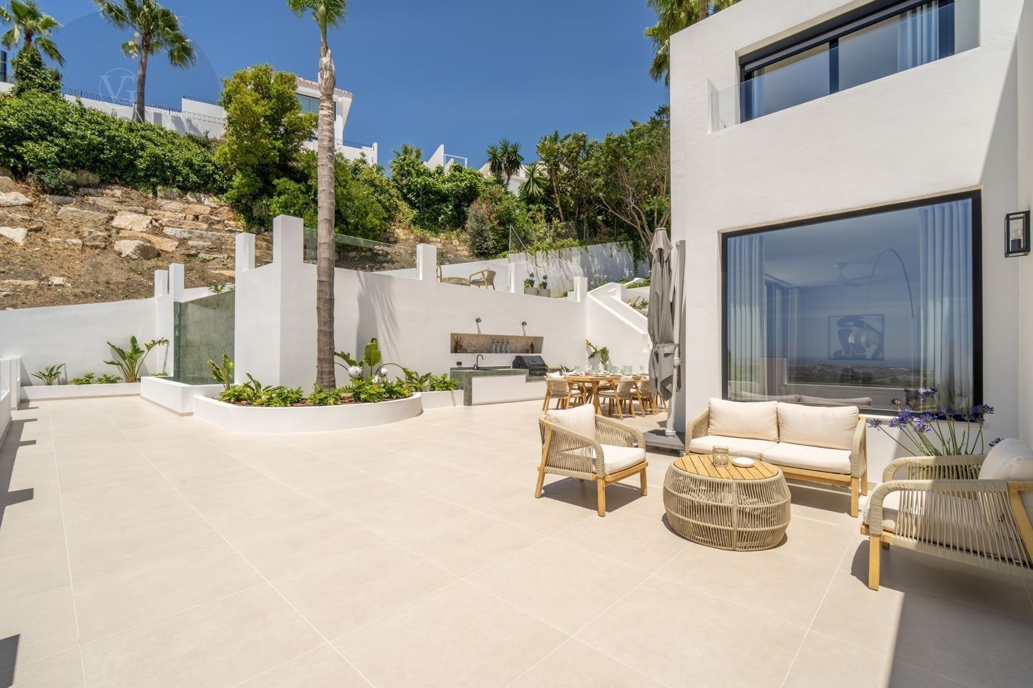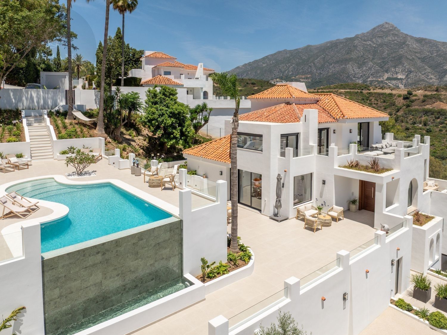 Bienvenido a Villa Luma, una residencia mediterránea bellamente reinventada, situada en el prestigioso enclave de Las Lomas de Nueva Andalucía. Orientada al sur y bañada por la luz natural, esta casa ofrece algunas de las vistas al mar más impresionantes de toda la zona de Nueva Andalucía. Distribuida en tres niveles, la vivienda cuenta con cinco dormitorios, uno de ellos actualmente utilizado como oficina, y está diseñada para combinar una elegante vida interior con un disfrute exterior amplio y cómodo.El interior de la villa se define por tonos neutros suaves, materiales de alta calidad y espacios generosos. El corazón del hogar es una zona de estar de concepto abierto, conectada perfectamente con una cocina moderna y estilizada, y un comedor formal, todo ello con acceso a amplias terrazas ideales para recibir invitados o simplemente disfrutar de las vistas. La suite principal ocupa la planta superior, ofreciendo una privacidad total junto con un vestidor espacioso y vistas serenas al mar Mediterráneo. La planta baja incluye una acogedora sala de estar ideal como zona de entretenimiento o sala de televisión.En el exterior, Villa Luma destaca por su jardinería meticulosamente cuidada, múltiples zonas de descanso y una espectacular piscina infinita que se fusiona visualmente con el horizonte. Aunque no dispone de garaje ni ascensor, la propiedad ofrece espacio para aparcar cómodamente hasta cuatro coches dentro del área cerrada, además de espacio adicional para tres vehículos más justo fuera de la entrada superior. Con su orientación inmejorable, estilo refinado y raras vistas costeras, Villa Luma representa una oportunidad única de adquirir una vivienda lista para entrar a vivir en una de las direcciones más codiciadas de Marbella.
