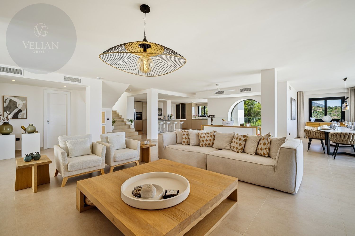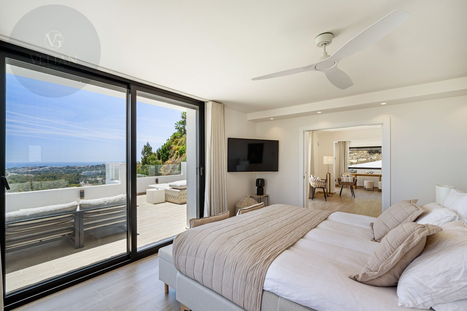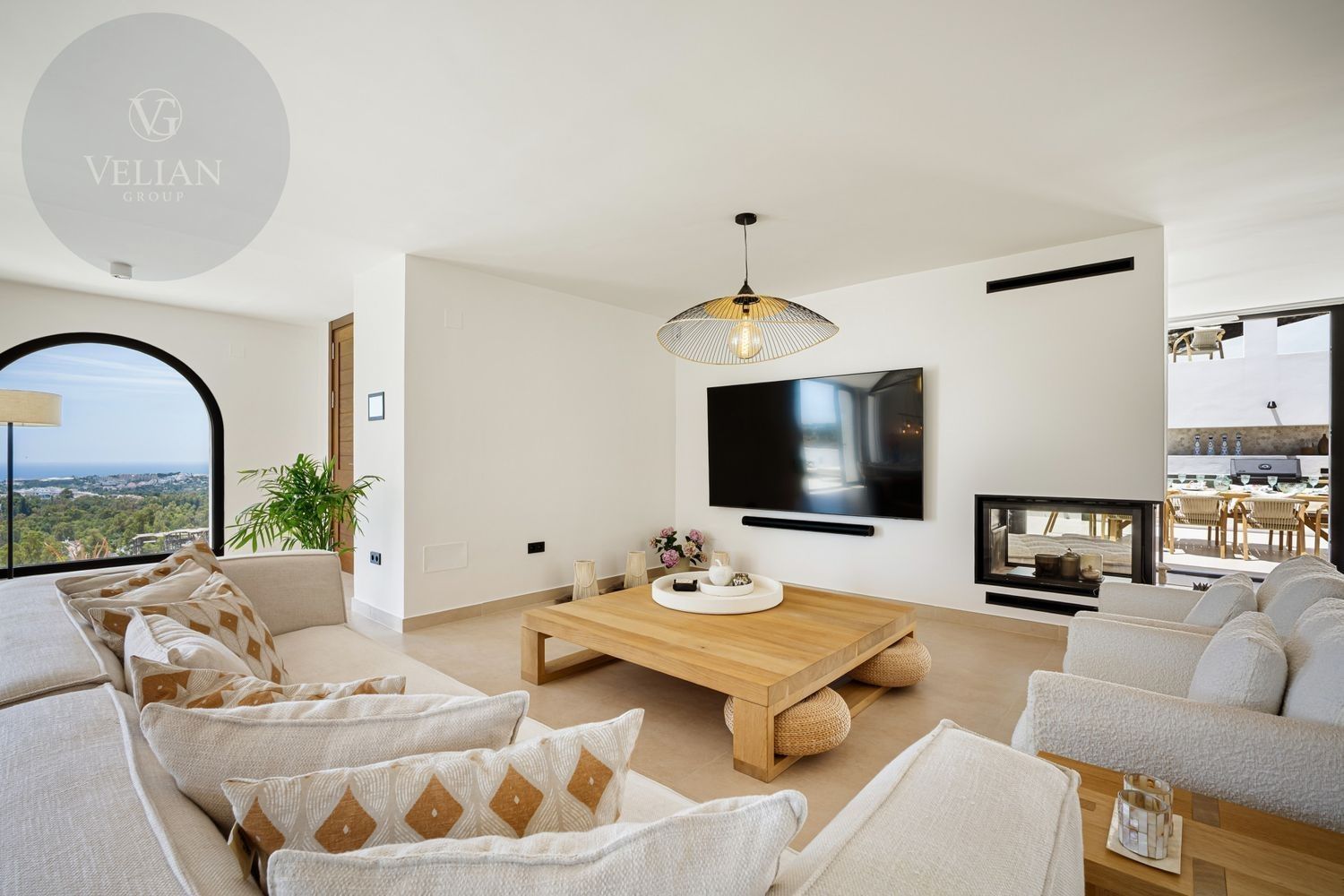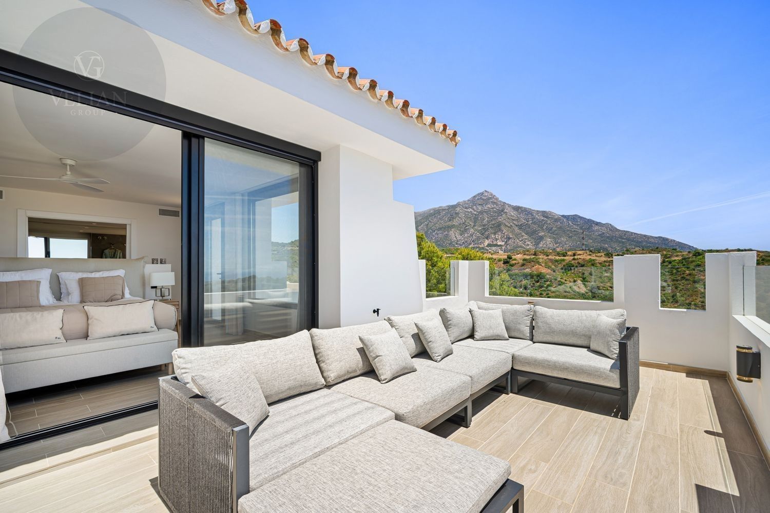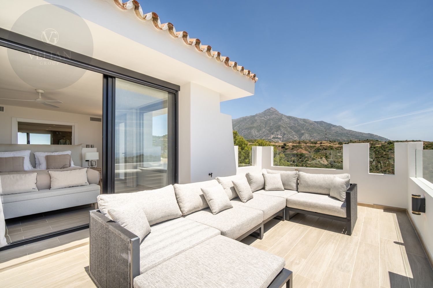 Bienvenido a Villa Luma, una residencia mediterránea bellamente reinventada, situada en el prestigioso enclave de Las Lomas de Nueva Andalucía. Orientada al sur y bañada por la luz natural, esta casa ofrece algunas de las vistas al mar más impresionantes de toda la zona de Nueva Andalucía. Distribuida en tres niveles, la vivienda cuenta con cinco dormitorios, uno de ellos actualmente utilizado como oficina, y está diseñada para combinar una elegante vida interior con un disfrute exterior amplio y cómodo.El interior de la villa se define por tonos neutros suaves, materiales de alta calidad y espacios generosos. El corazón del hogar es una zona de estar de concepto abierto, conectada perfectamente con una cocina moderna y estilizada, y un comedor formal, todo ello con acceso a amplias terrazas ideales para recibir invitados o simplemente disfrutar de las vistas. La suite principal ocupa la planta superior, ofreciendo una privacidad total junto con un vestidor espacioso y vistas serenas al mar Mediterráneo. La planta baja incluye una acogedora sala de estar ideal como zona de entretenimiento o sala de televisión.En el exterior, Villa Luma destaca por su jardinería meticulosamente cuidada, múltiples zonas de descanso y una espectacular piscina infinita que se fusiona visualmente con el horizonte. Aunque no dispone de garaje ni ascensor, la propiedad ofrece espacio para aparcar cómodamente hasta cuatro coches dentro del área cerrada, además de espacio adicional para tres vehículos más justo fuera de la entrada superior. Con su orientación inmejorable, estilo refinado y raras vistas costeras, Villa Luma representa una oportunidad única de adquirir una vivienda lista para entrar a vivir en una de las direcciones más codiciadas de Marbella.