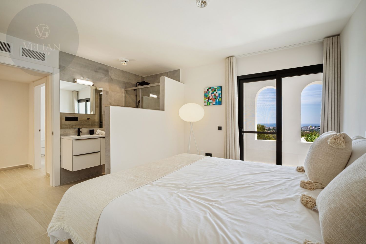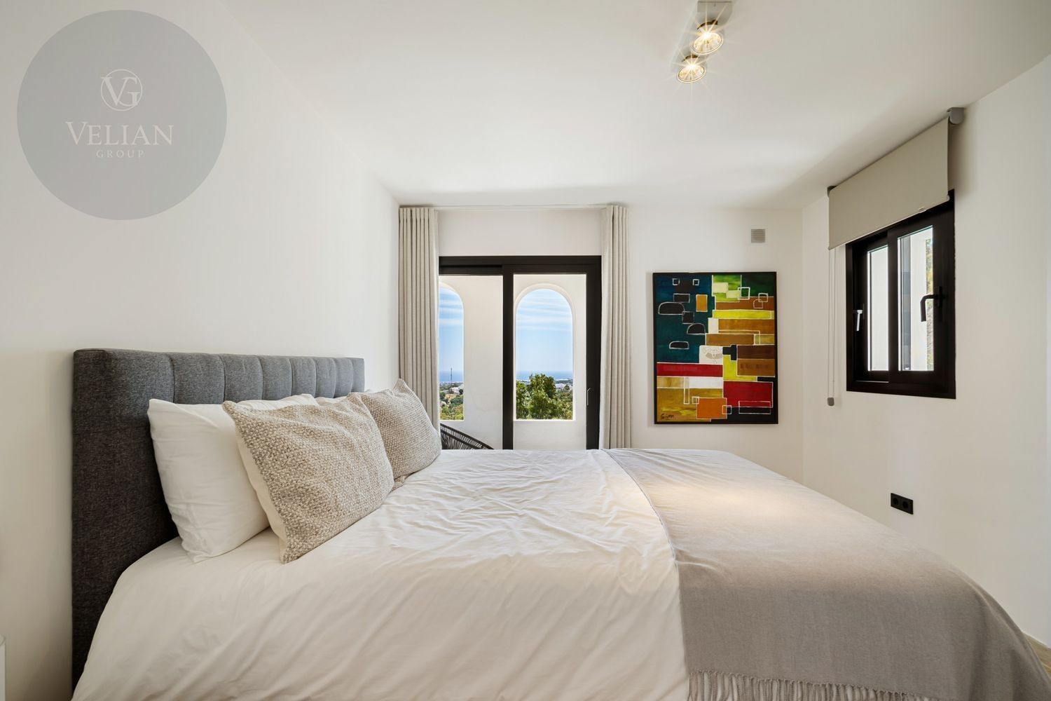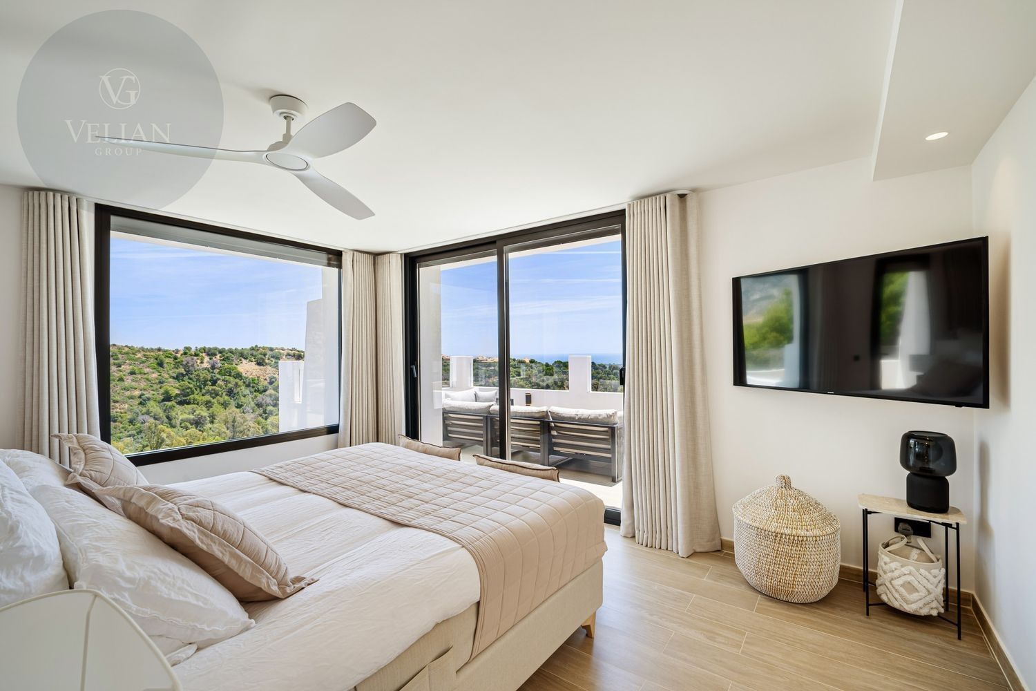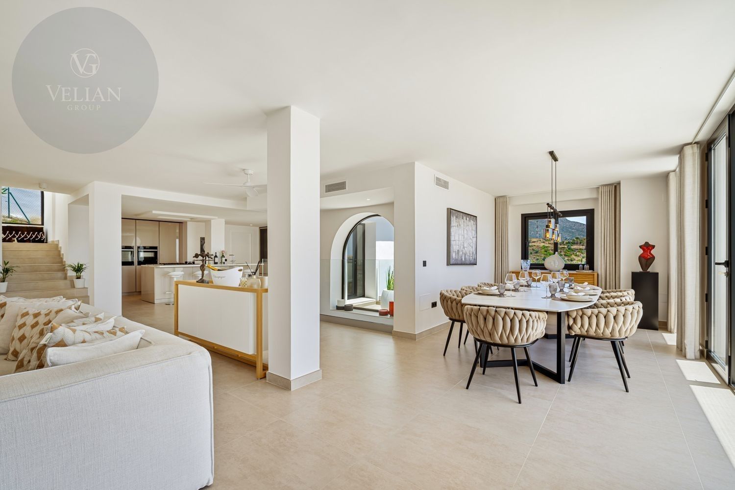 Bienvenido a Villa Luma, una residencia mediterránea bellamente reinventada, situada en el prestigioso enclave de Las Lomas de Nueva Andalucía. Orientada al sur y bañada por la luz natural, esta casa ofrece algunas de las vistas al mar más impresionantes de toda la zona de Nueva Andalucía. Distribuida en tres niveles, la vivienda cuenta con cinco dormitorios, uno de ellos actualmente utilizado como oficina, y está diseñada para combinar una elegante vida interior con un disfrute exterior amplio y cómodo.El interior de la villa se define por tonos neutros suaves, materiales de alta calidad y espacios generosos. El corazón del hogar es una zona de estar de concepto abierto, conectada perfectamente con una cocina moderna y estilizada, y un comedor formal, todo ello con acceso a amplias terrazas ideales para recibir invitados o simplemente disfrutar de las vistas. La suite principal ocupa la planta superior, ofreciendo una privacidad total junto con un vestidor espacioso y vistas serenas al mar Mediterráneo. La planta baja incluye una acogedora sala de estar ideal como zona de entretenimiento o sala de televisión.En el exterior, Villa Luma destaca por su jardinería meticulosamente cuidada, múltiples zonas de descanso y una espectacular piscina infinita que se fusiona visualmente con el horizonte. Aunque no dispone de garaje ni ascensor, la propiedad ofrece espacio para aparcar cómodamente hasta cuatro coches dentro del área cerrada, además de espacio adicional para tres vehículos más justo fuera de la entrada superior. Con su orientación inmejorable, estilo refinado y raras vistas costeras, Villa Luma representa una oportunidad única de adquirir una vivienda lista para entrar a vivir en una de las direcciones más codiciadas de Marbella.