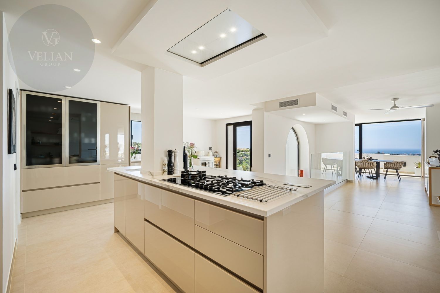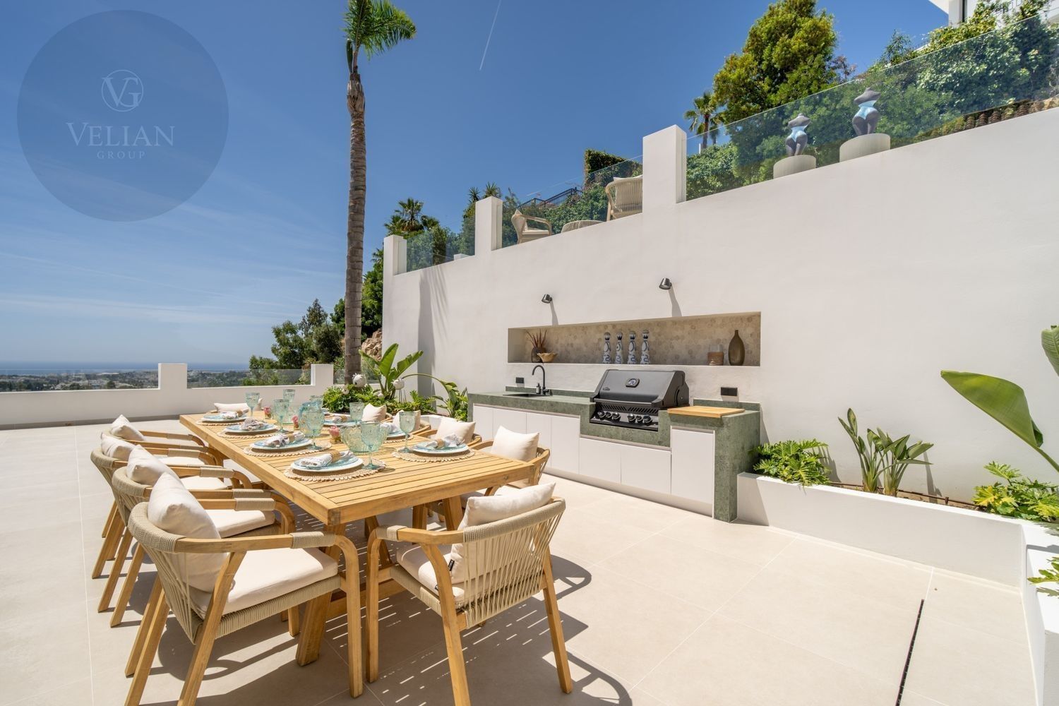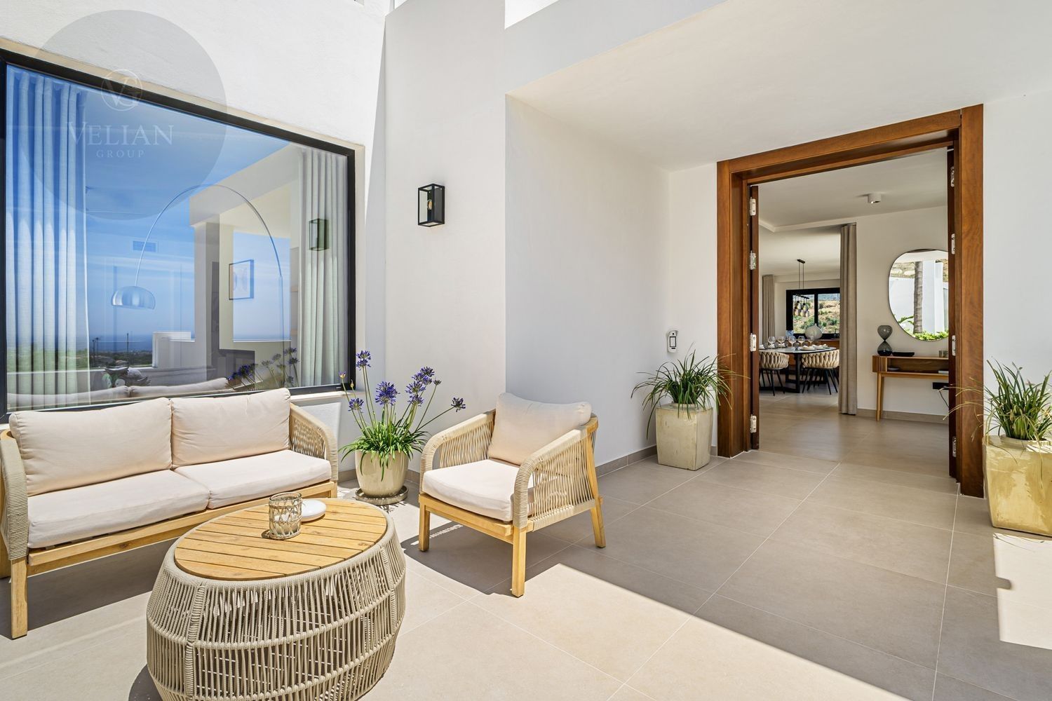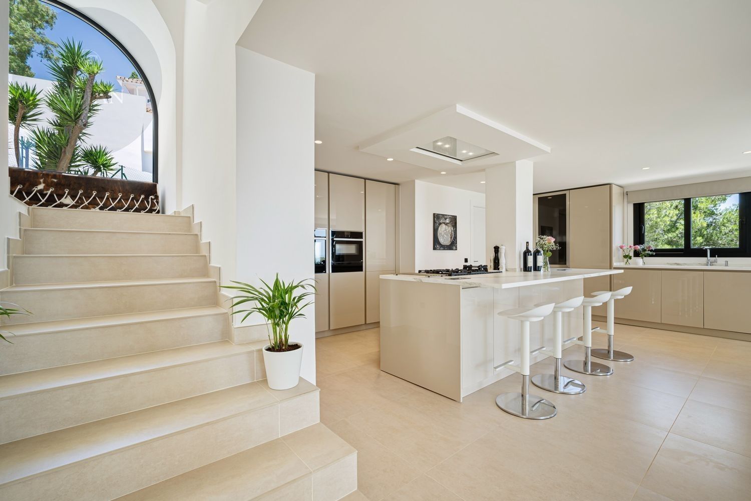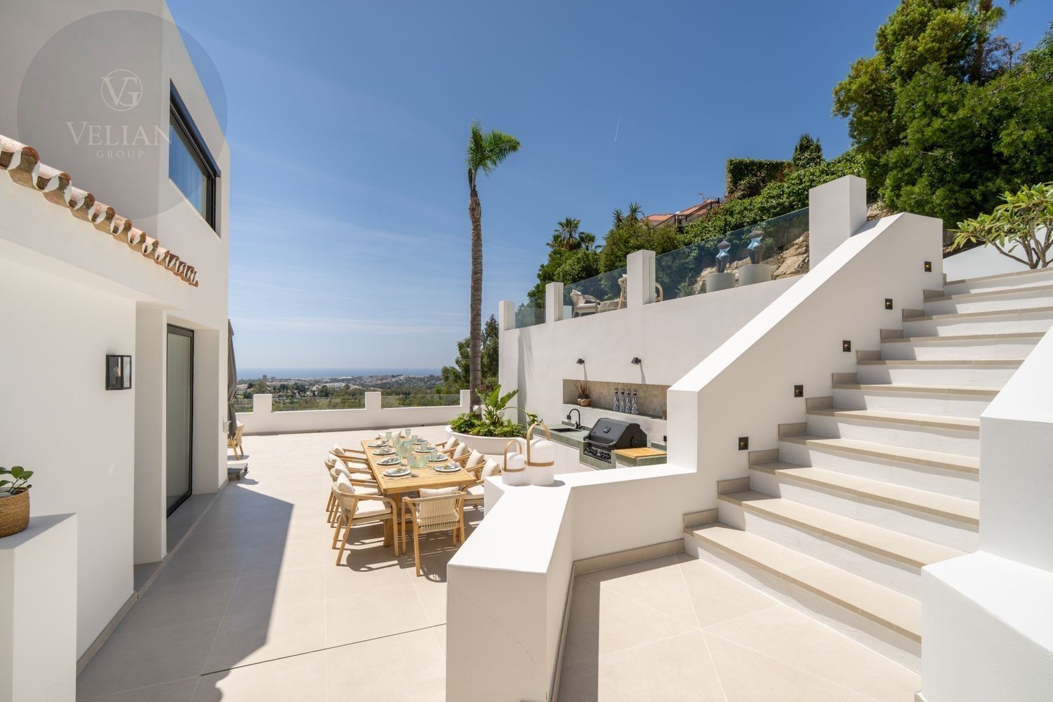 Bienvenido a Villa Luma, una residencia mediterránea bellamente reinventada, situada en el prestigioso enclave de Las Lomas de Nueva Andalucía. Orientada al sur y bañada por la luz natural, esta casa ofrece algunas de las vistas al mar más impresionantes de toda la zona de Nueva Andalucía. Distribuida en tres niveles, la vivienda cuenta con cinco dormitorios, uno de ellos actualmente utilizado como oficina, y está diseñada para combinar una elegante vida interior con un disfrute exterior amplio y cómodo.El interior de la villa se define por tonos neutros suaves, materiales de alta calidad y espacios generosos. El corazón del hogar es una zona de estar de concepto abierto, conectada perfectamente con una cocina moderna y estilizada, y un comedor formal, todo ello con acceso a amplias terrazas ideales para recibir invitados o simplemente disfrutar de las vistas. La suite principal ocupa la planta superior, ofreciendo una privacidad total junto con un vestidor espacioso y vistas serenas al mar Mediterráneo. La planta baja incluye una acogedora sala de estar ideal como zona de entretenimiento o sala de televisión.En el exterior, Villa Luma destaca por su jardinería meticulosamente cuidada, múltiples zonas de descanso y una espectacular piscina infinita que se fusiona visualmente con el horizonte. Aunque no dispone de garaje ni ascensor, la propiedad ofrece espacio para aparcar cómodamente hasta cuatro coches dentro del área cerrada, además de espacio adicional para tres vehículos más justo fuera de la entrada superior. Con su orientación inmejorable, estilo refinado y raras vistas costeras, Villa Luma representa una oportunidad única de adquirir una vivienda lista para entrar a vivir en una de las direcciones más codiciadas de Marbella.
