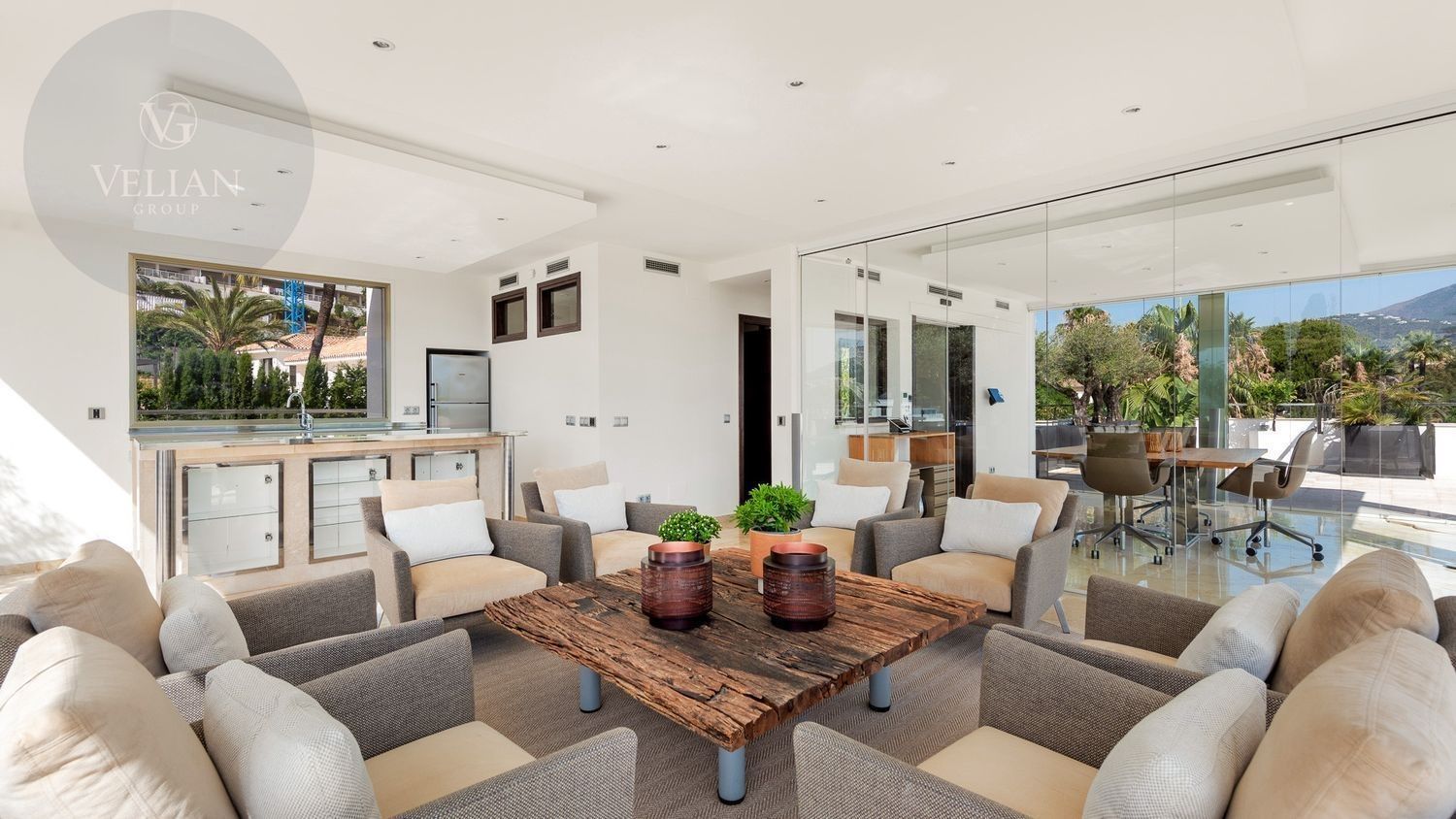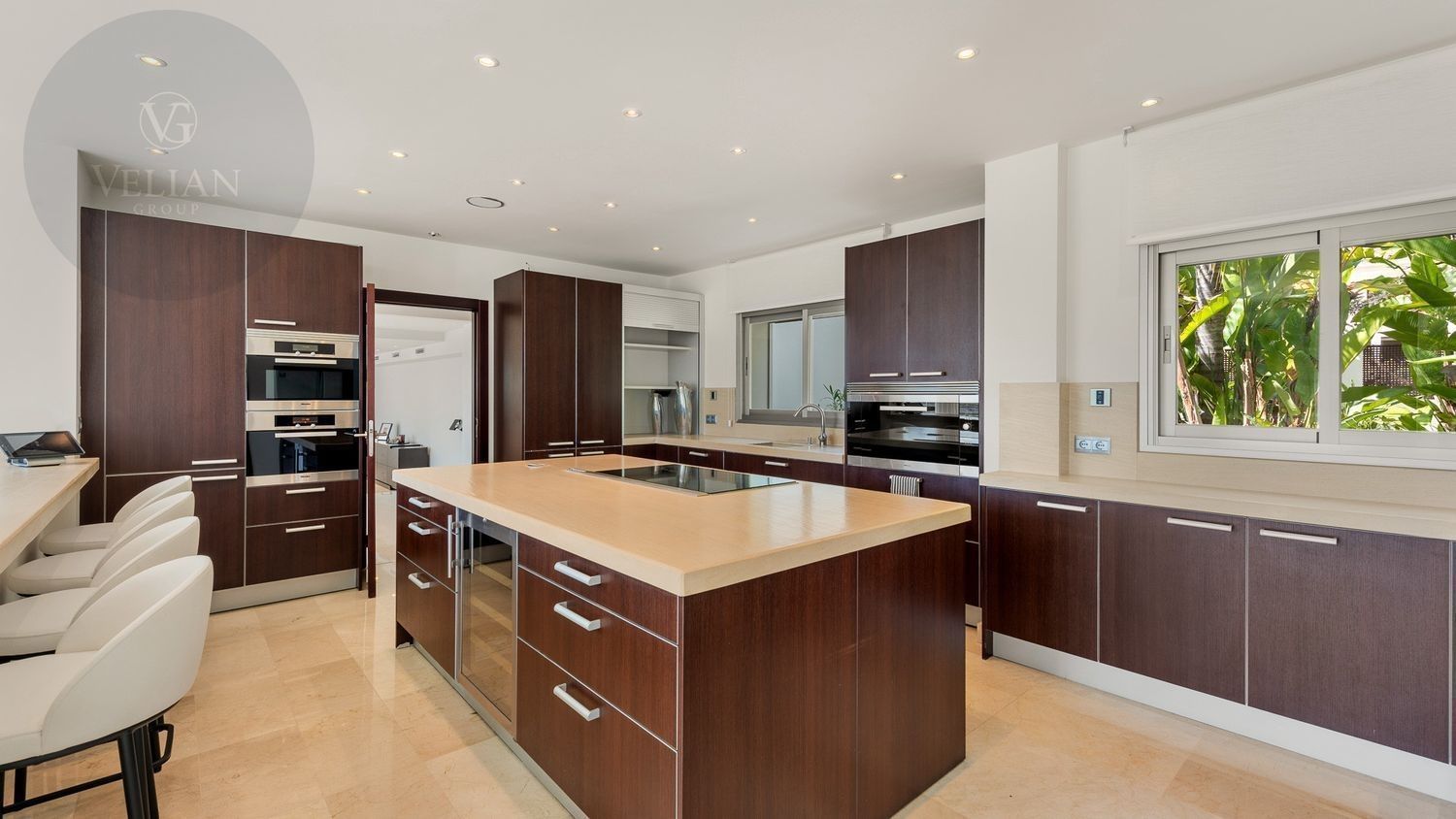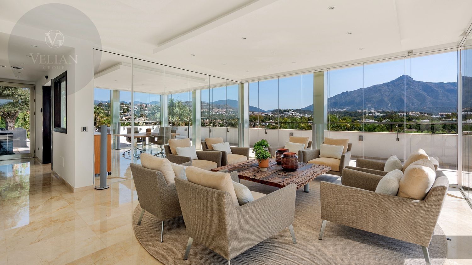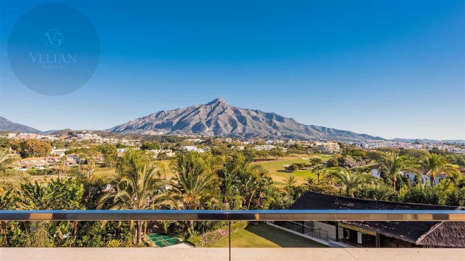Fantástica villa en venta con vistas a Las Brisas y a la emblemática montaña de La Concha. Esta es una de las propiedades más grandes construidas en Nueva Andalucía y consta de:Planta baja: Amplio hall de entrada que conduce a una gran cocina totalmente equipada y comedor con acceso a una terraza para cenar y vistas al campo de golf Las Brisas. Cuarto de servicio contiguo con escaleras al apartamento del personal en el sótano. Amplio salón con chimenea y acceso a una amplia terraza con vistas al jardín, la piscina y el campo de golf Las Brisas. Dormitorio principal con vestidor independiente y baño. Un ascensor de cristal desde la planta baja conecta con los pisos superiores e inferiores.Planta superior: Accesible mediante el ascensor de cristal, la planta superior cuenta con una gran sala de estar y comedor adicional con un bar incorporado y una enorme terraza lounge. Perfecto para el entretenimiento o para su uso como oficina.Planta baja: Accesible por escaleras o por el ascensor, la planta baja consta de una sala de cine y 4 suites de dormitorios muy generosas, todas con acceso al jardín y una con su propia sala de estar. También en esta planta se encuentra un gimnasio separado.Nivel del sótano: Con una bodega de última generación con área de comedor, dos apartamentos para el personal, cuarto de servicio, trastero y garaje para al menos 6 coches.Nivel del jardín: El jardín cuenta con una gran área plana de césped, una gran piscina y un chiringuito con cocina y comedor.