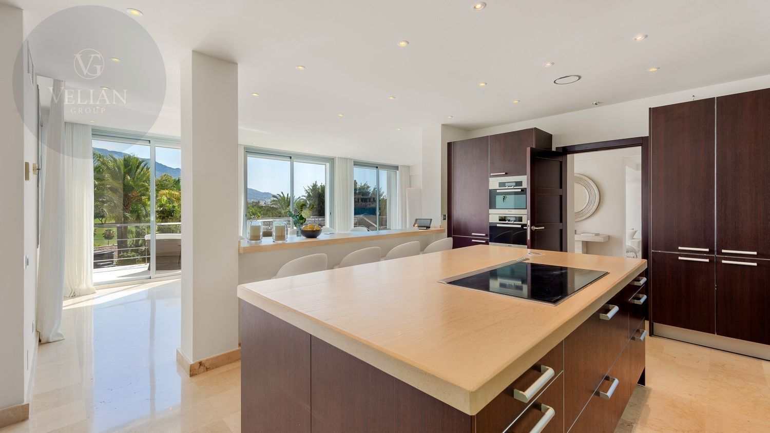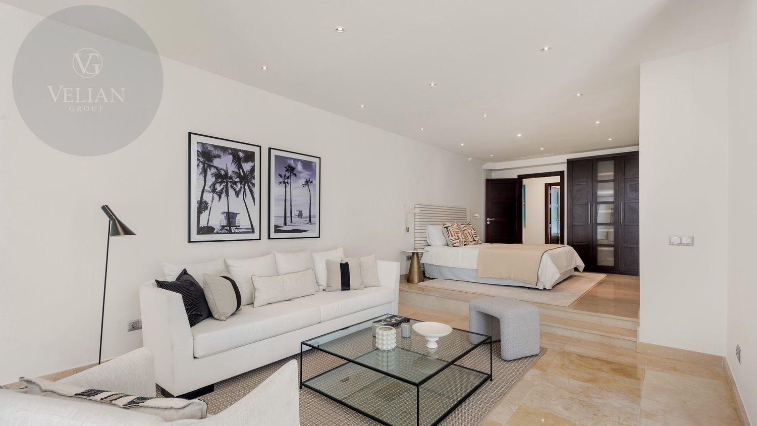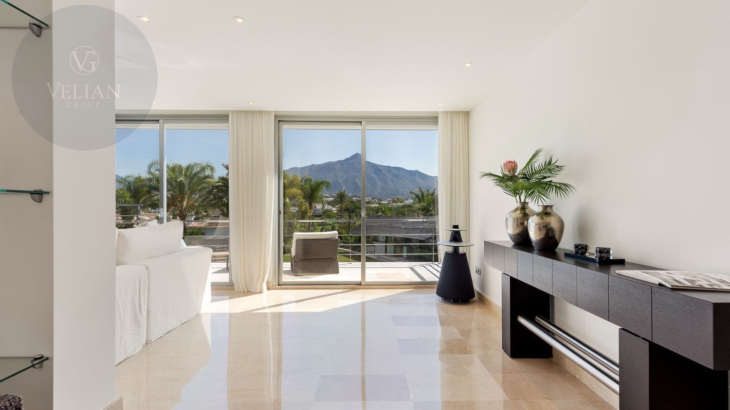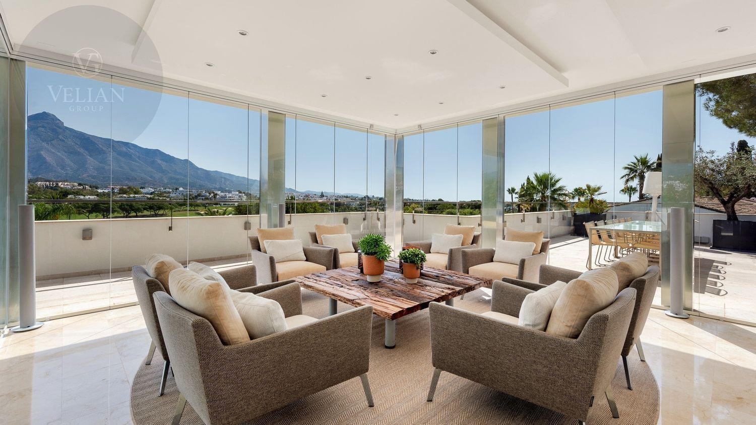 Fantástica villa en venta con vistas a Las Brisas y a la emblemática montaña de La Concha. Esta es una de las propiedades más grandes construidas en Nueva Andalucía y consta de:Planta baja: Amplio hall de entrada que conduce a una gran cocina totalmente equipada y comedor con acceso a una terraza para cenar y vistas al campo de golf Las Brisas. Cuarto de servicio contiguo con escaleras al apartamento del personal en el sótano. Amplio salón con chimenea y acceso a una amplia terraza con vistas al jardín, la piscina y el campo de golf Las Brisas. Dormitorio principal con vestidor independiente y baño. Un ascensor de cristal desde la planta baja conecta con los pisos superiores e inferiores.Planta superior: Accesible mediante el ascensor de cristal, la planta superior cuenta con una gran sala de estar y comedor adicional con un bar incorporado y una enorme terraza lounge. Perfecto para el entretenimiento o para su uso como oficina.Planta baja: Accesible por escaleras o por el ascensor, la planta baja consta de una sala de cine y 4 suites de dormitorios muy generosas, todas con acceso al jardín y una con su propia sala de estar. También en esta planta se encuentra un gimnasio separado.Nivel del sótano: Con una bodega de última generación con área de comedor, dos apartamentos para el personal, cuarto de servicio, trastero y garaje para al menos 6 coches.Nivel del jardín: El jardín cuenta con una gran área plana de césped, una gran piscina y un chiringuito con cocina y comedor.