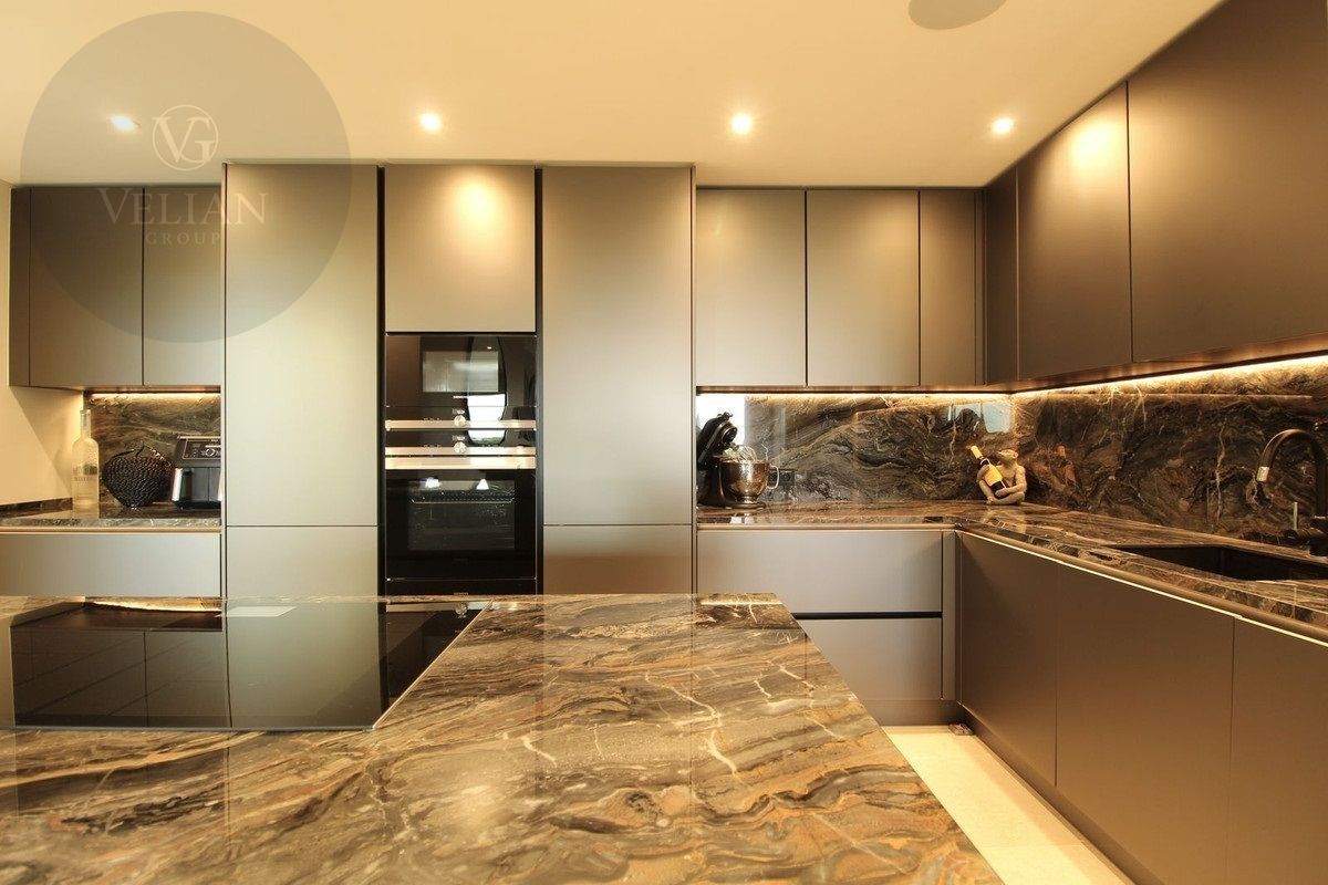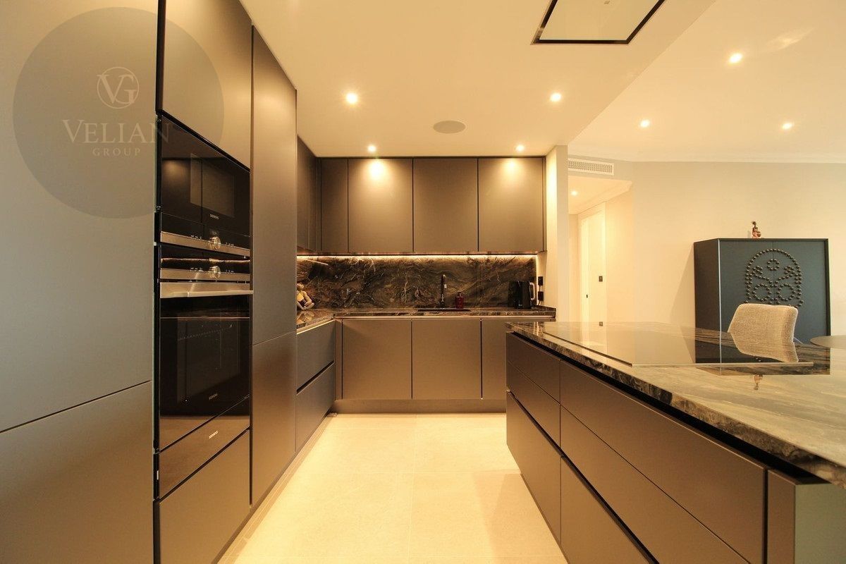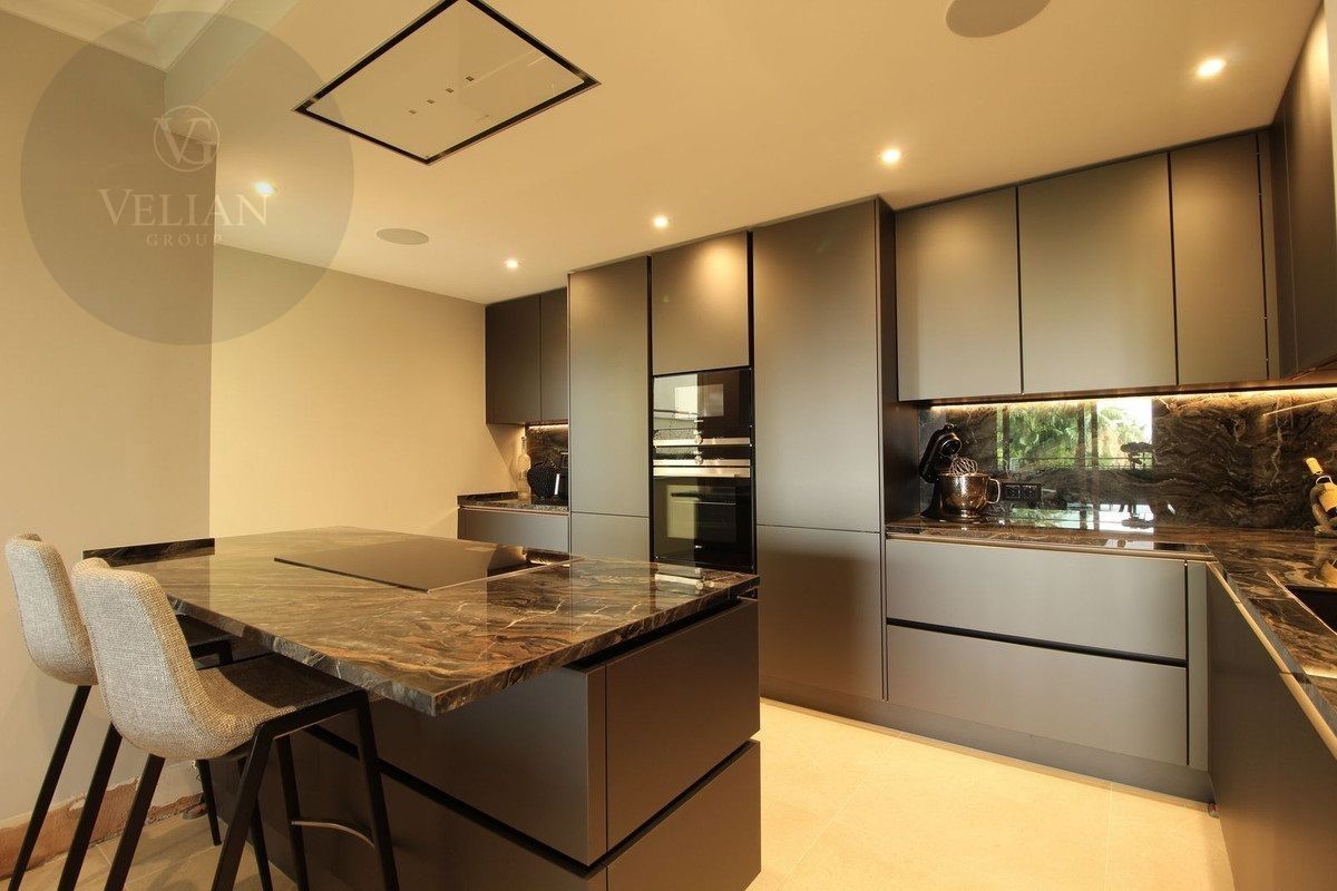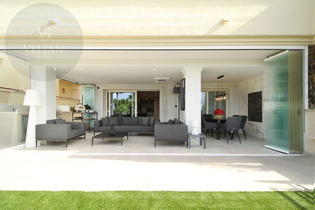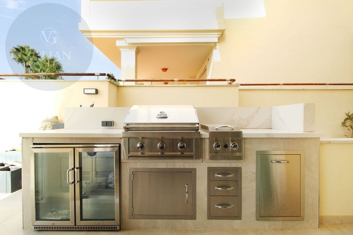 La cocina de estilo abierto está equipada con electrodomésticos Siemens y tiene acceso directo a la terraza, donde se encuentra una cocina exterior completamente equipada con barbacoa. La amplia zona de salón-comedor da paso a una fabulosa terraza cubierta con espacios de salón y comedor. Se han instalado cortinas de cristal para permitir su uso durante todo el año, y cuenta además con su propio sistema de aire acondicionado.
