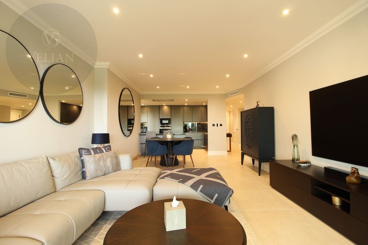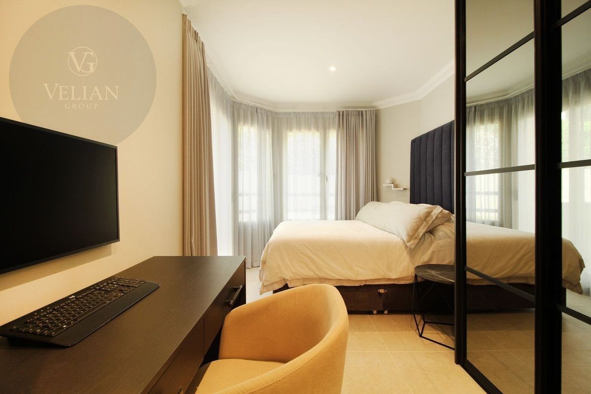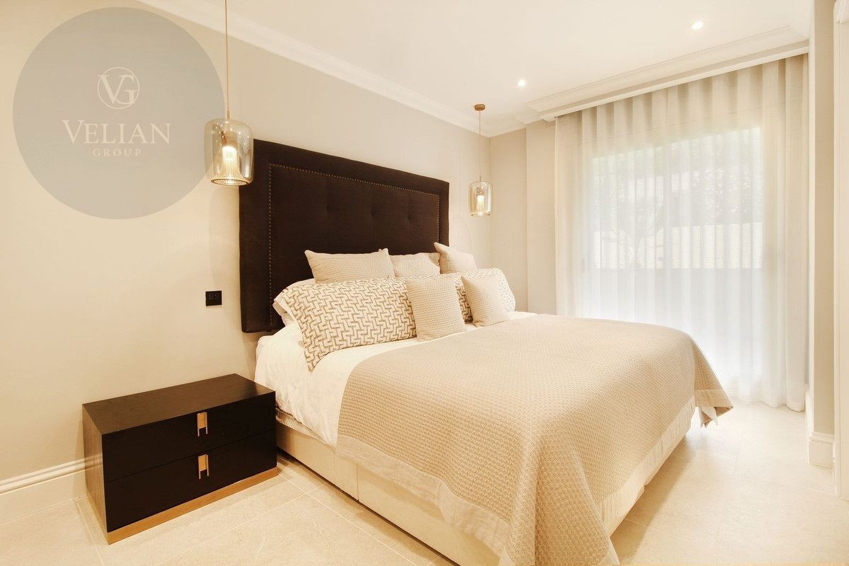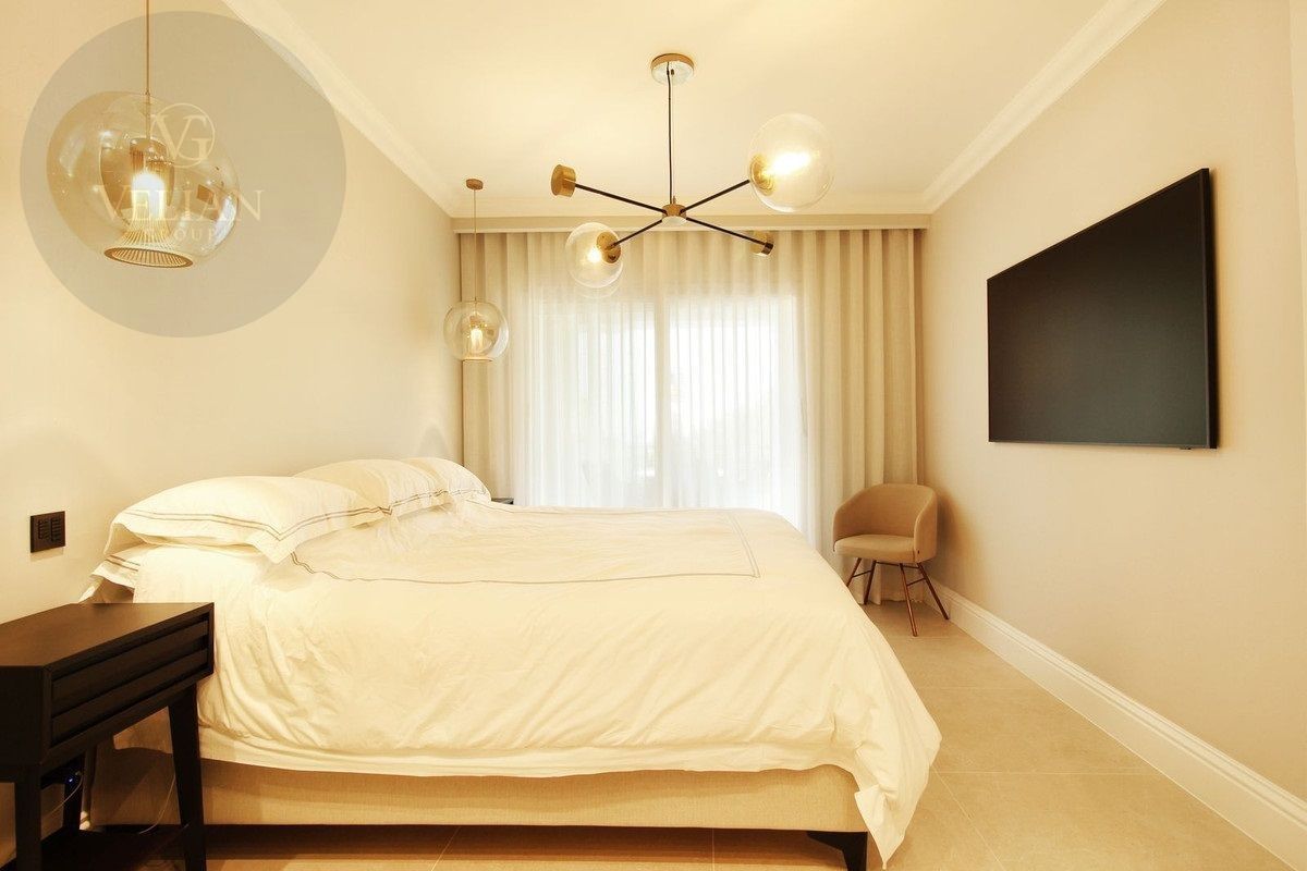 El apartamento ha sido completamente reformado y redistribuido con los más altos estándares de calidad. Ahora cuenta con tres amplios dormitorios dobles, todos con baño en suite, además de un aseo de invitados. Todos los dormitorios tienen acceso directo a una terraza, y el dormitorio principal se abre al jardín orientado al sur con esas impresionantes vistas.