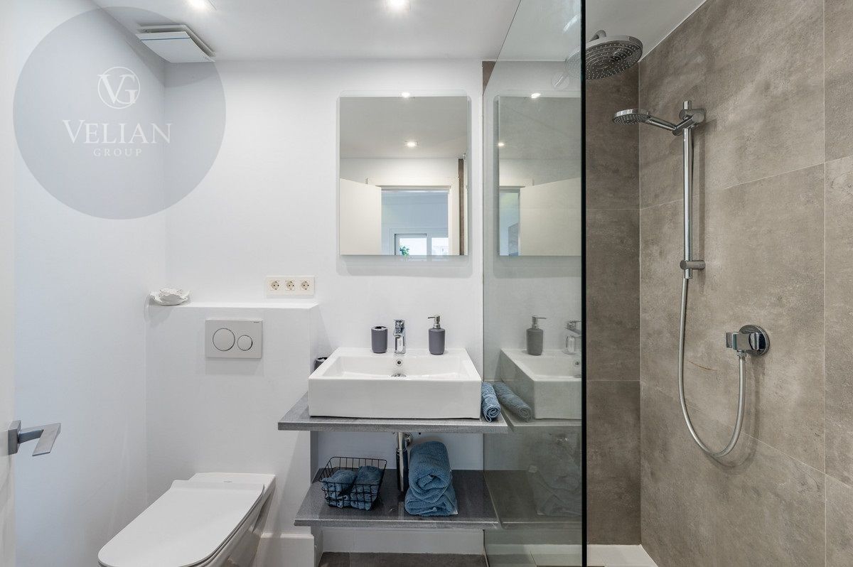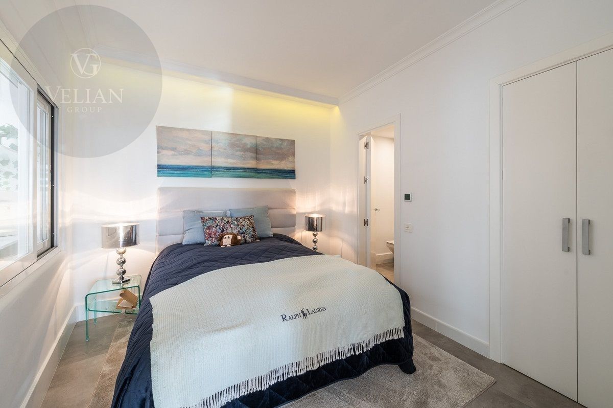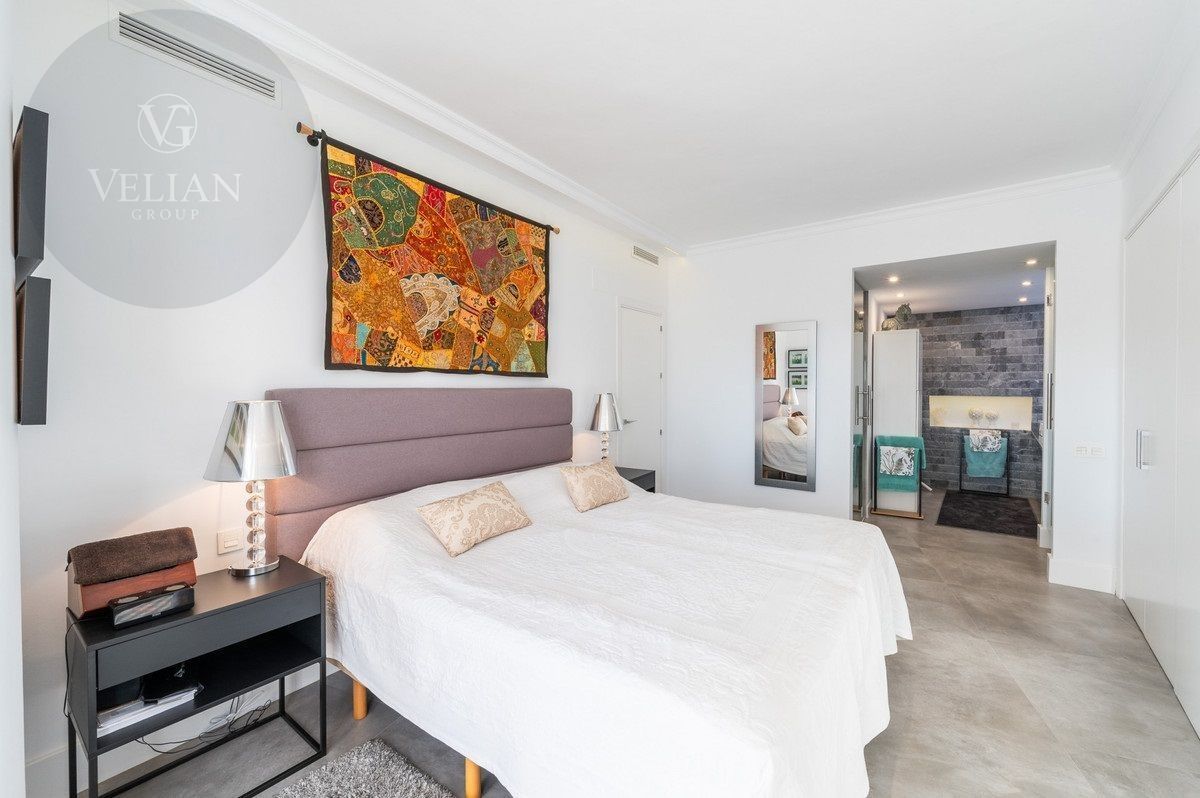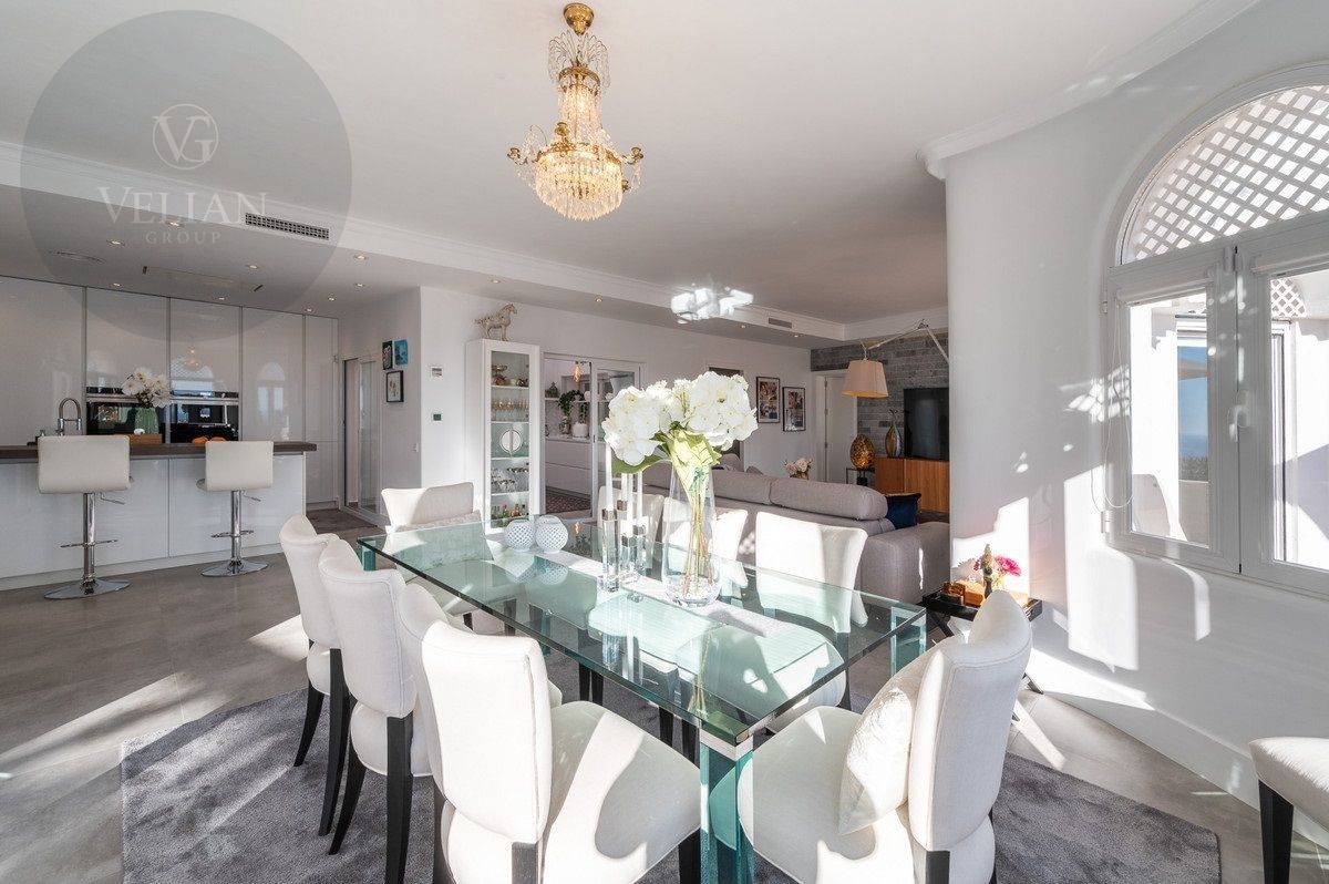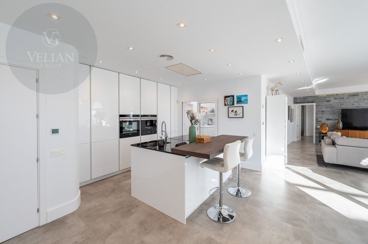 El apartamento tiene una superficie de 212 m², con 180 m² de espacio habitable y una terraza de 44 m². Ambos dormitorios cuentan con baños en suite ubicados en la planta superior, lo que garantiza privacidad. Una habitación de invitados y tres aseos (incluido un aseo de cortesía) añaden comodidad. El salón-comedor de planta abierta se conecta con la terraza a través de puertas de cristal, integrando los espacios interiores y exteriores. La cocina, totalmente equipada, incluye electrodomésticos modernos, perfecta para el uso diario o para recibir invitados, y está complementada por elegantes armarios blancos y una isla central con asientos para dos personas. Entre las características principales destacan la calefacción por suelo radiante, aire acondicionado, persianas eléctricas, armarios empotrados, Wi-Fi de alta velocidad y alarma de seguridad. La comunidad cerrada ofrece piscina privada, garaje y trastero. El mobiliario es opcional para facilitar la mudanza.