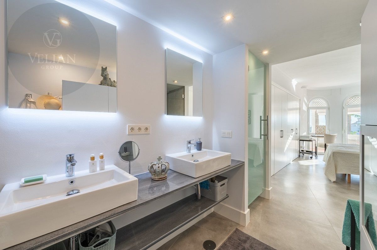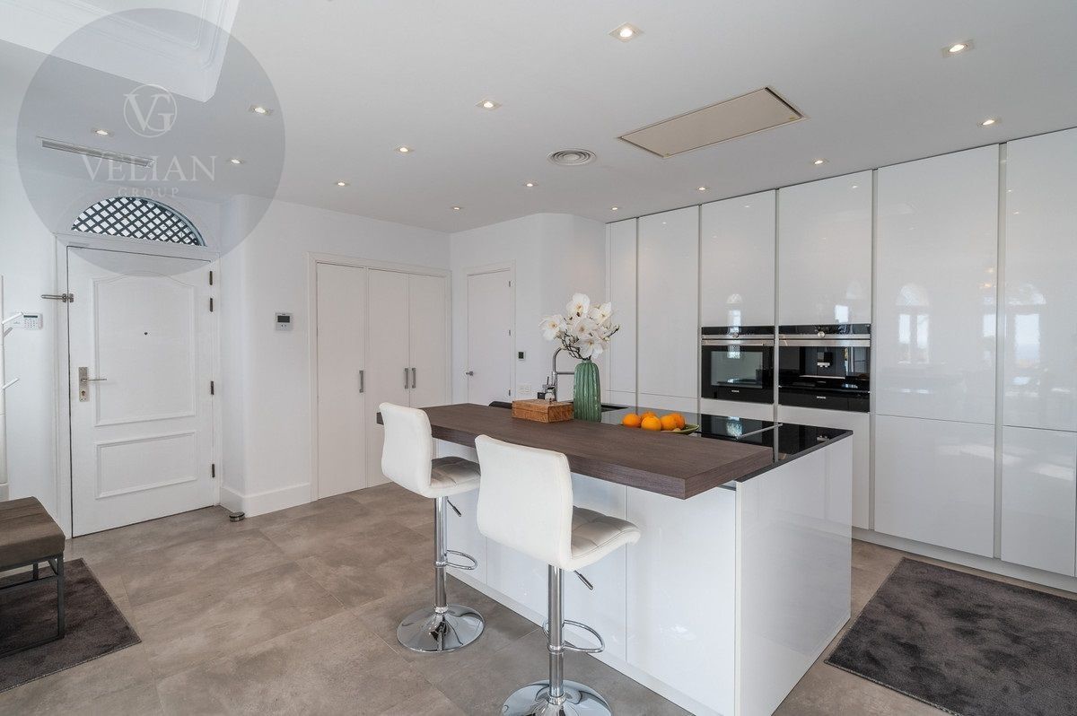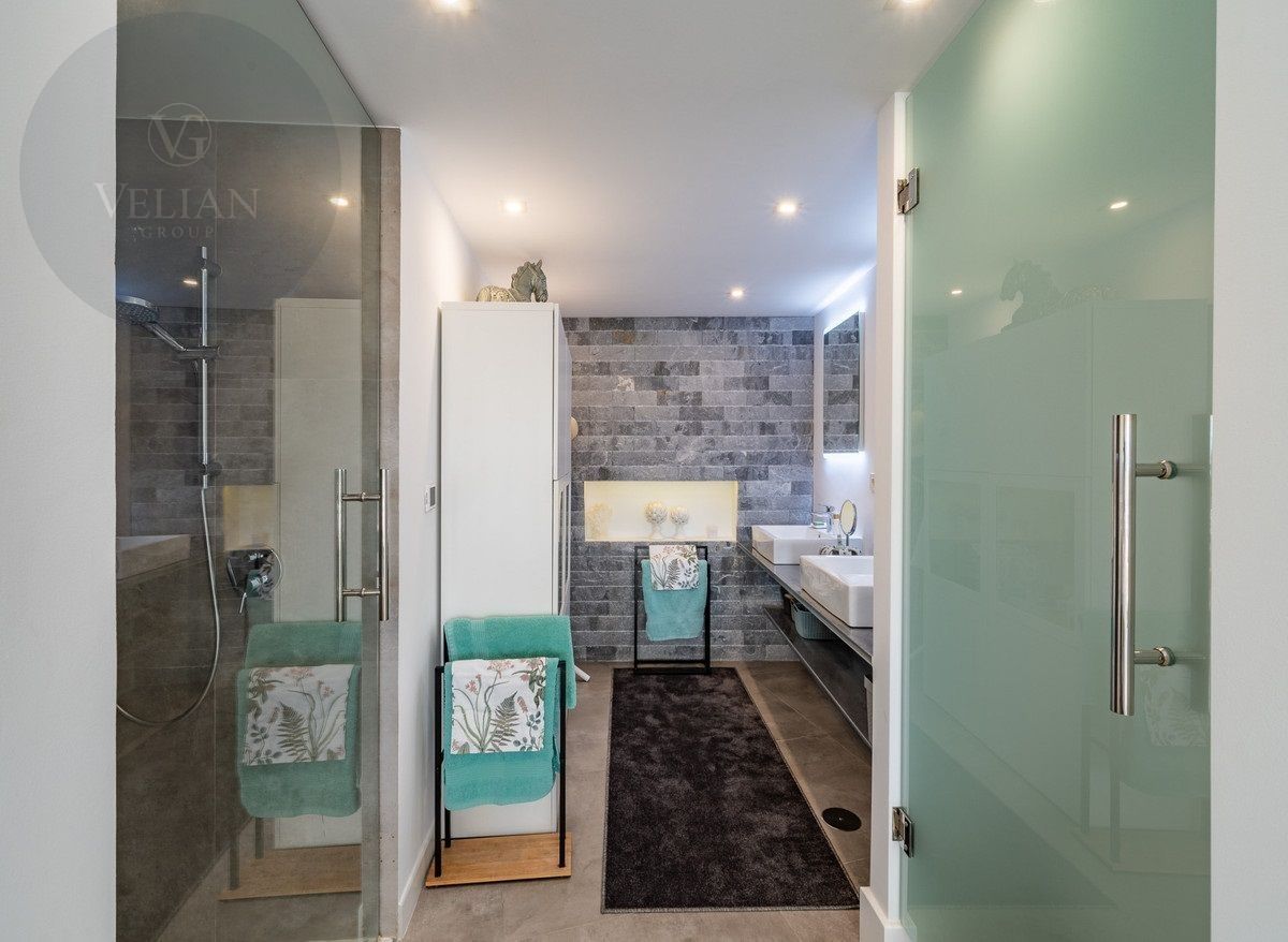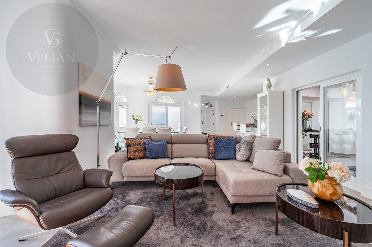El apartamento tiene una superficie de 212 m², con 180 m² de espacio habitable y una terraza de 44 m². Ambos dormitorios cuentan con baños en suite ubicados en la planta superior, lo que garantiza privacidad. Una habitación de invitados y tres aseos (incluido un aseo de cortesía) añaden comodidad. El salón-comedor de planta abierta se conecta con la terraza a través de puertas de cristal, integrando los espacios interiores y exteriores. La cocina, totalmente equipada, incluye electrodomésticos modernos, perfecta para el uso diario o para recibir invitados, y está complementada por elegantes armarios blancos y una isla central con asientos para dos personas. Entre las características principales destacan la calefacción por suelo radiante, aire acondicionado, persianas eléctricas, armarios empotrados, Wi-Fi de alta velocidad y alarma de seguridad. La comunidad cerrada ofrece piscina privada, garaje y trastero. El mobiliario es opcional para facilitar la mudanza.