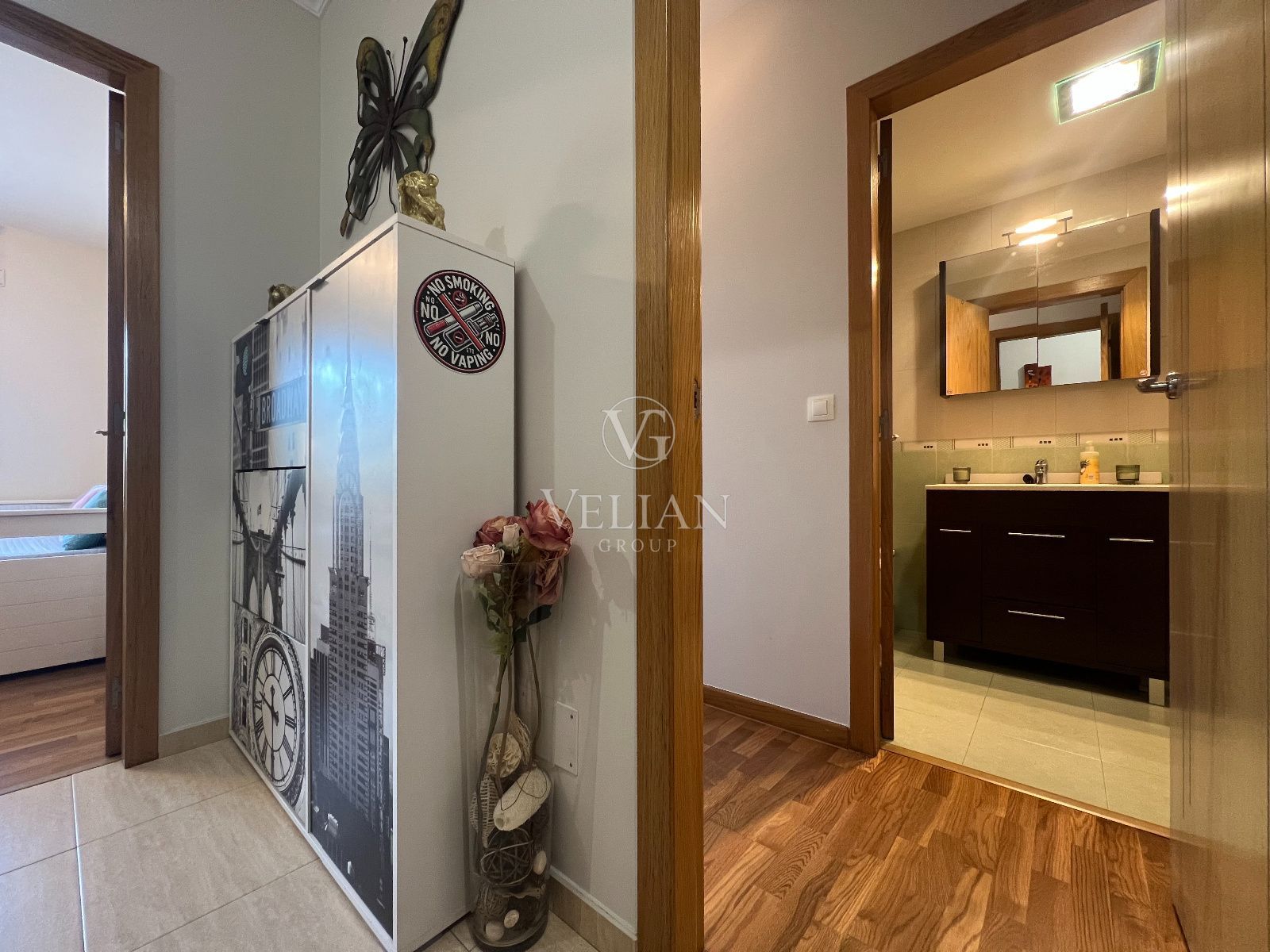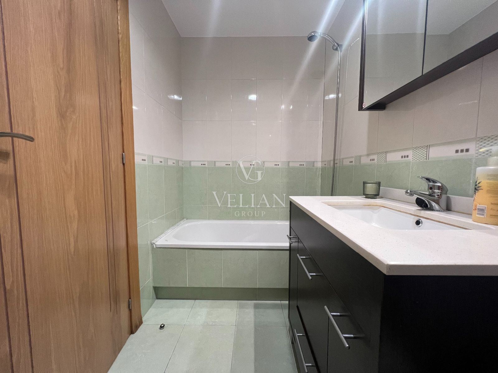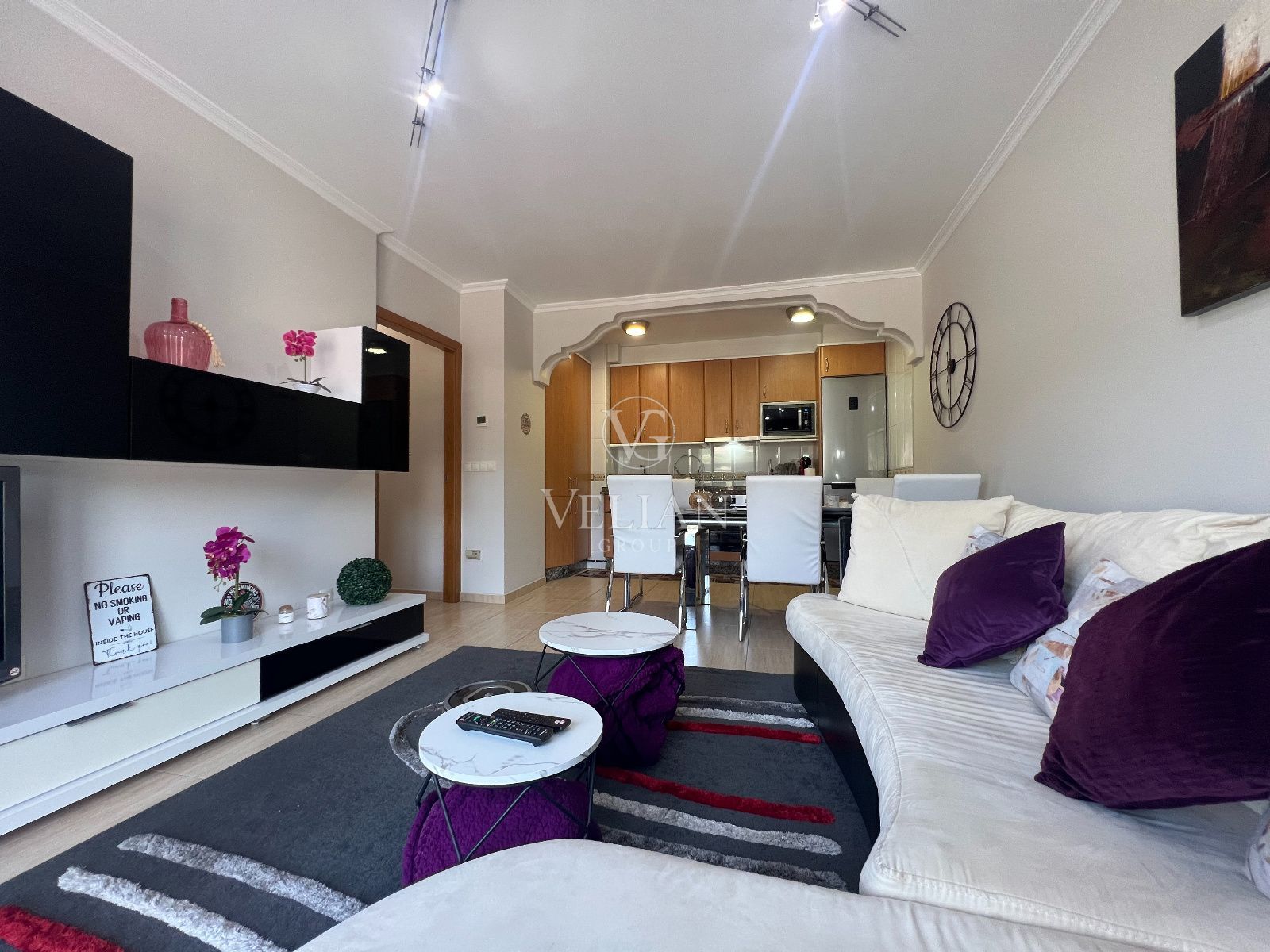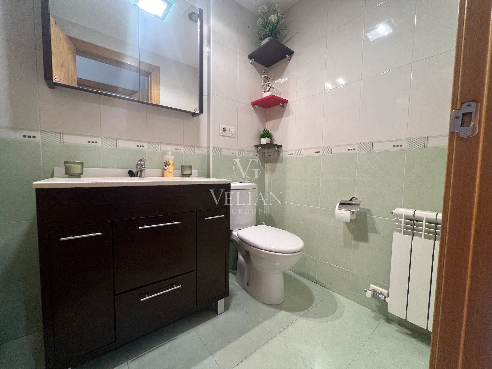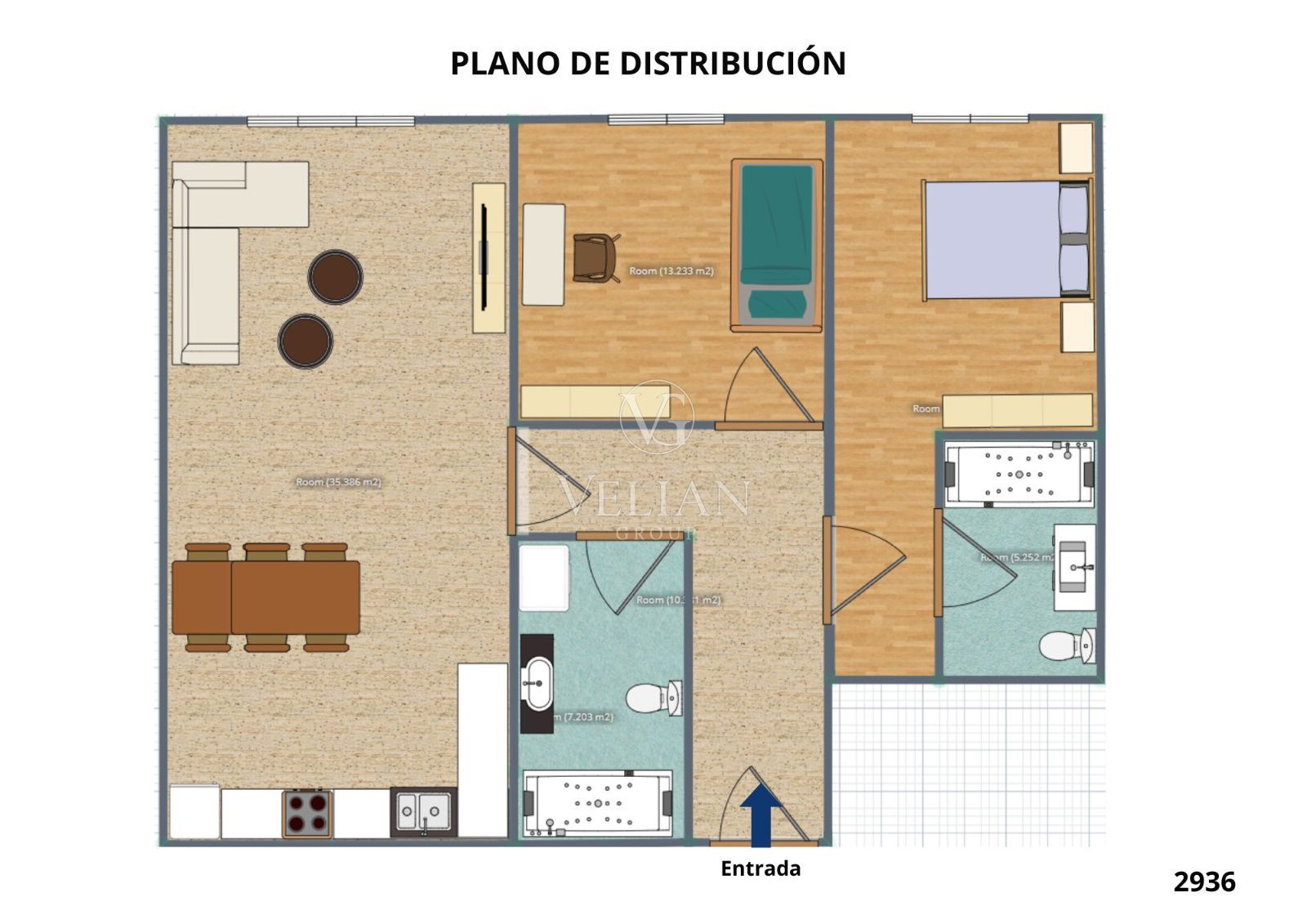 El piso cuenta con 109 m² construidos (66 m² útiles) y se distribuye en 2 habitaciones con armarios empotrados, una de ellas en suite, 2 baños completos con bañera y un salón-comedor muy luminoso con cocina americana, creando un espacio cómodo y funcional.