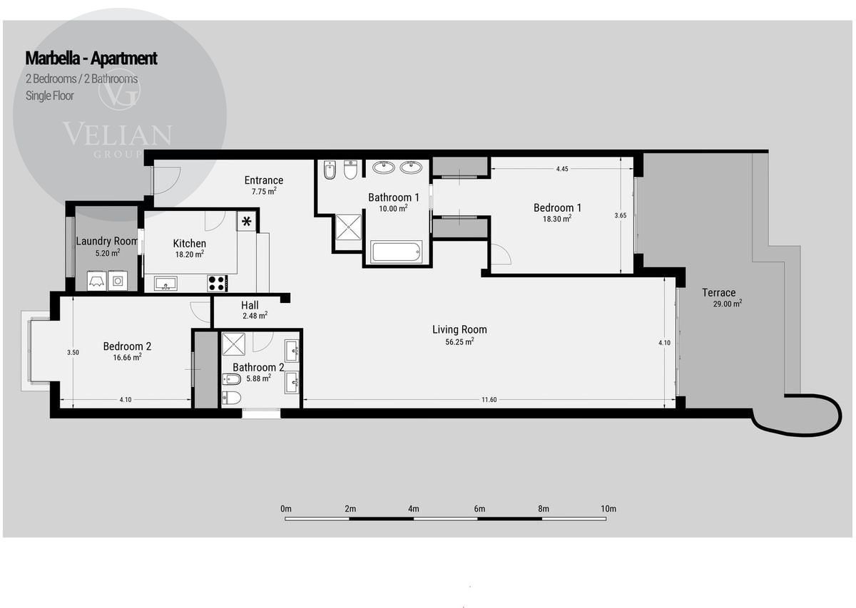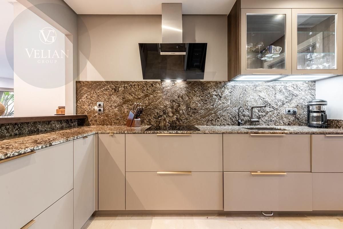 Este espacioso y bellamente renovado apartamento cuenta con una cocina completamente nueva, armarios a medida y un sistema de aire acondicionado de alta gama. La distribución incluye un recibidor acogedor, una amplia sala de estar y comedor de concepto abierto, una cocina completamente equipada, un dormitorio principal con baño en suite y un dormitorio de invitados con terraza privada y su propio baño espacioso. El punto culminante de la vivienda es su amplia terraza orientada al sur de 41 m², cerrada con vidrio para disfrutarla durante todo el año. Entre las características de lujo adicionales se incluye calefacción por suelo radiante en todo el apartamento.