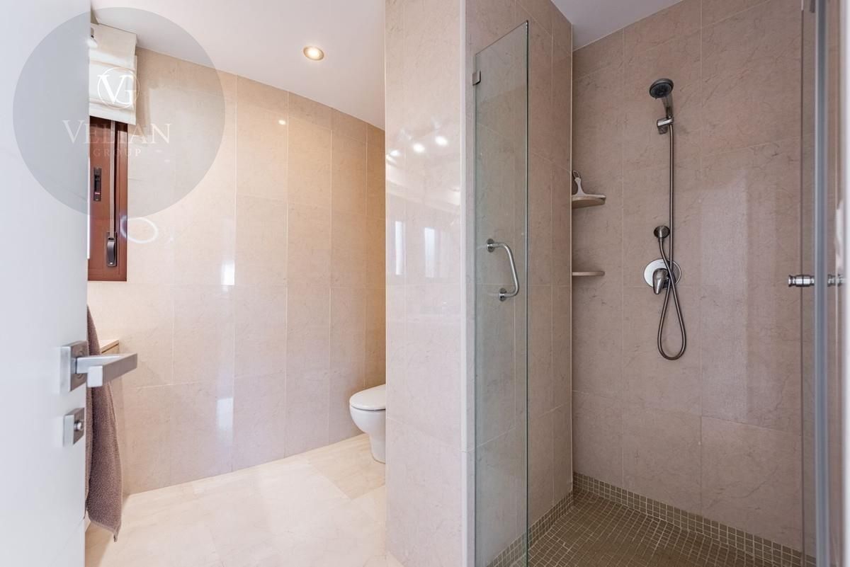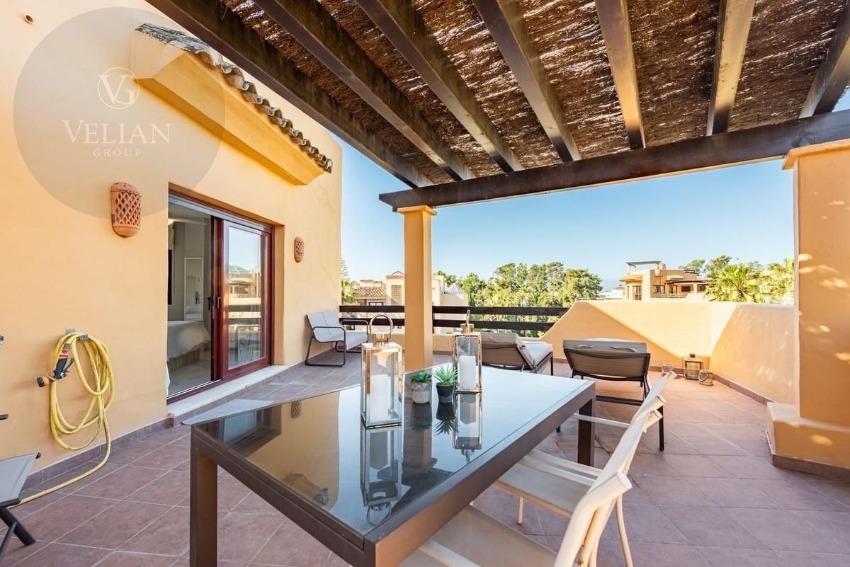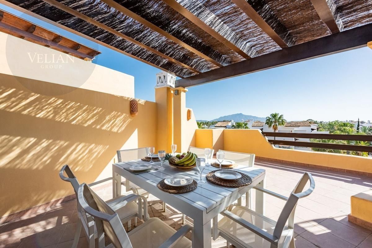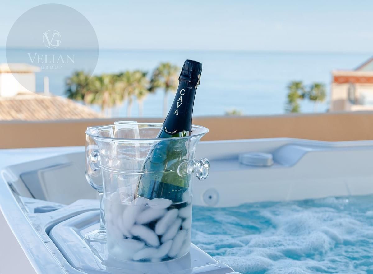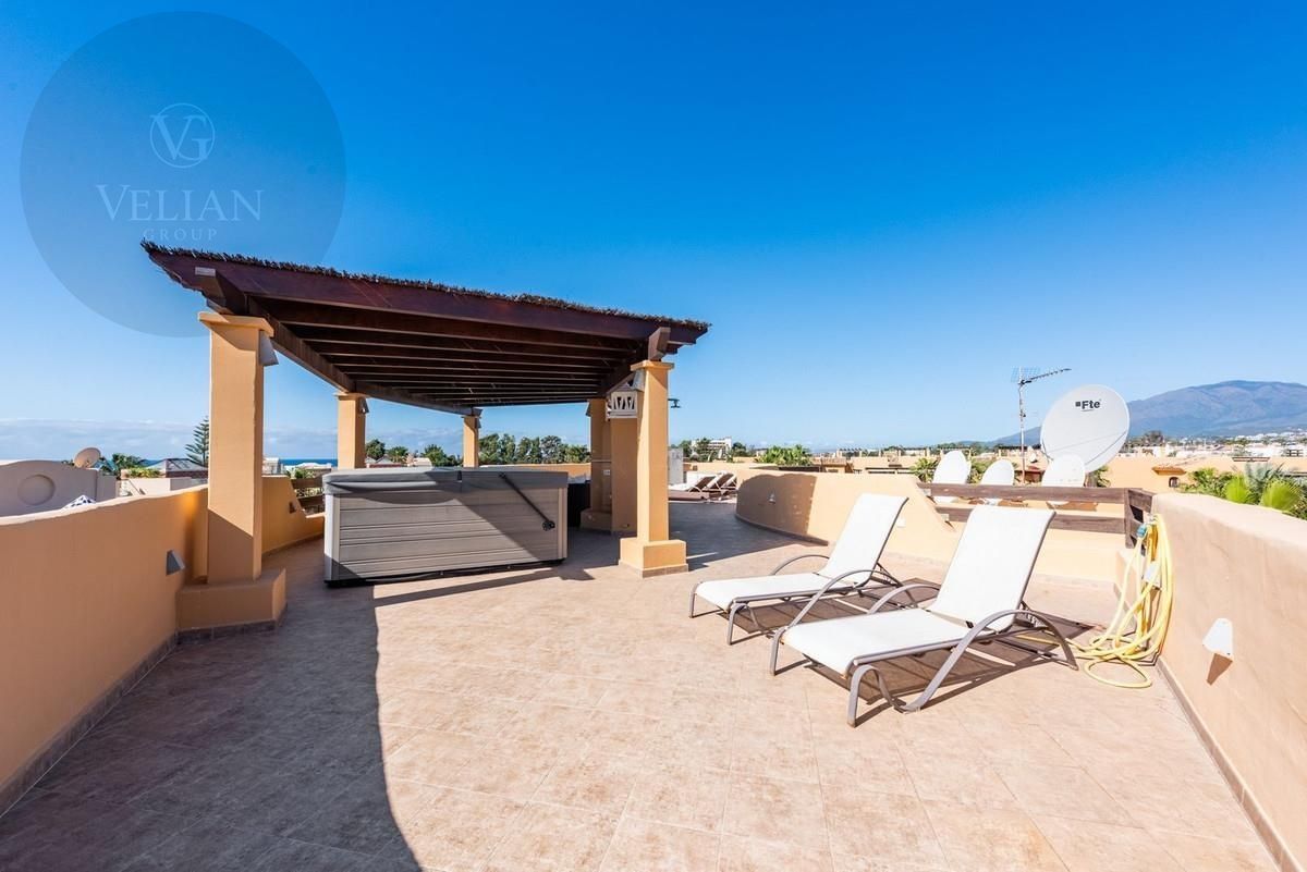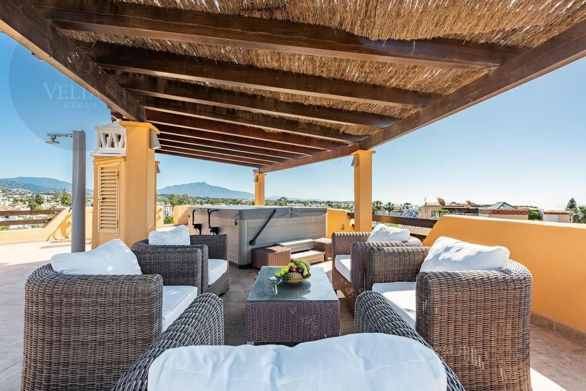 Junto al salón se encuentra una gran terraza semi cubierta con barbacoa, perfecta para disfrutar de cenas al aire libre con vistas al mar. Una escalera de caracol conduce al solárium en la azotea, que ofrece vistas panorámicas de 360 grados desde las montañas de Marbella y Estepona hasta Gibraltar y la costa africana. Esta terraza superior cuenta con un amplio jacuzzi, una zona de estar cubierta y espacio adicional para tumbonas: el entorno ideal para relajarse o recibir invitados.
