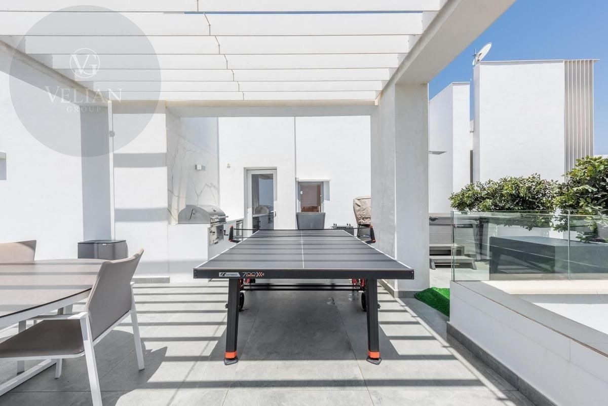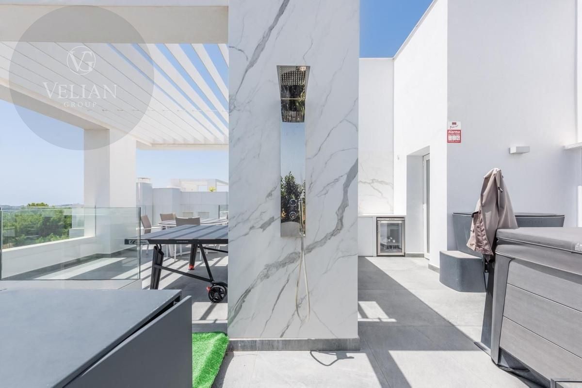 Ático - dúpex construído en 2018, destaca por su elegante estilo contemporáneo, dispone de un total de tres dormitroios, (dos de ellos en la planta baja), dos cuartos de baño, salón con cocina abierta y terraza en la planta principal y gran terraza en la planta superior con jacuzzi, sauna...etc desde la terraza se puede disfurtar de unas maravillosas vistas al mar, campo de golf, lago y montaña.