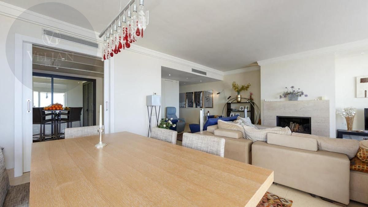 La propiedad cuenta con una amplia y exquisita sala de estar y comedor de planta abierta con puertas y muebles elegantes. Una espectacular área social con impresionantes pisos de mármol, adornada con una elegante chimenea, puertas de doble acristalamiento de pared a pared que conducen a una fabulosa terraza panorámica con una de las vistas al mar más impresionantes de Marbella.