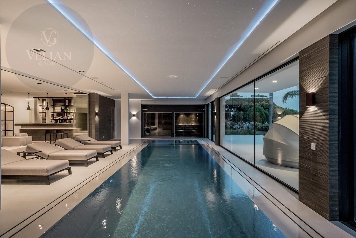 La zona de piscina cubierta de la villa es un santuario de tranquilidad, exudiendo elegancia y encanto. Cuando cae la noche, el techo cobra vida con estrellas gemelas, creando un ambiente celestial. Esta zona también incluye un spa, sauna, sala de vapor y una sala de masajes, proporcionando el retiro perfecto para la relajación y rejuvenecimiento.