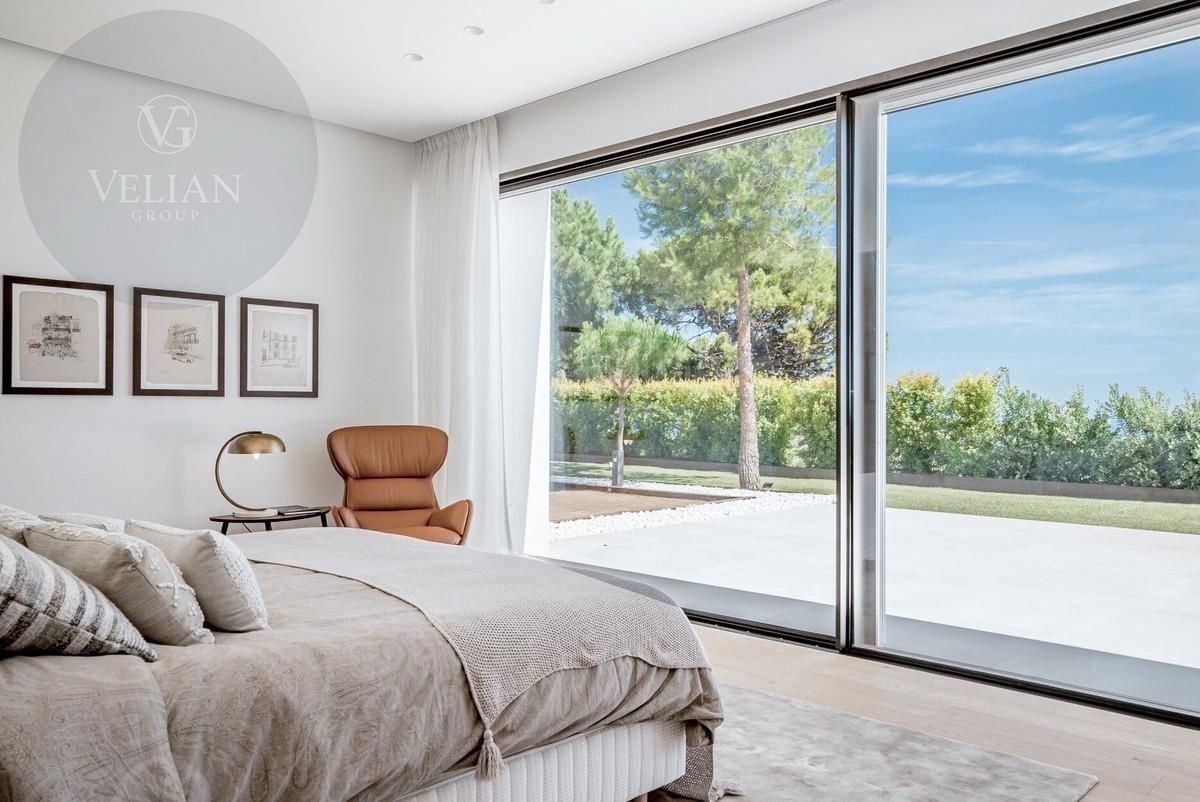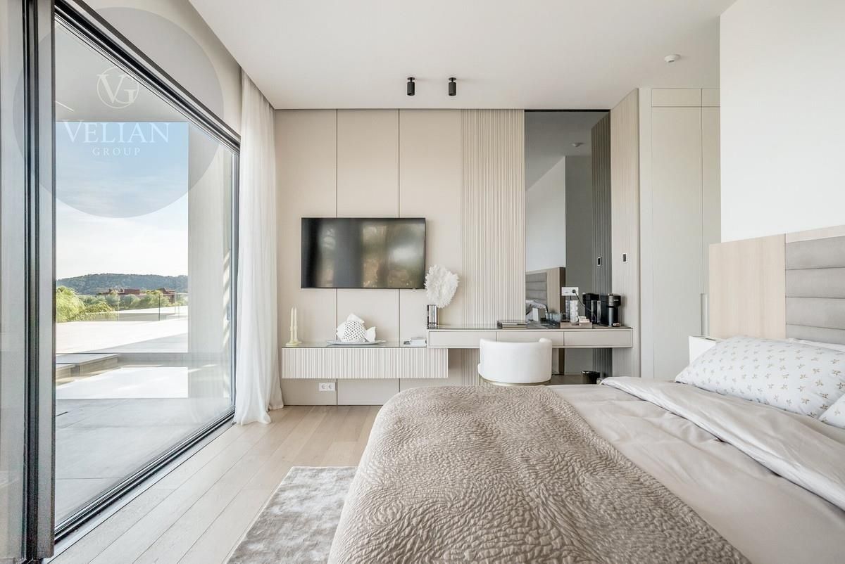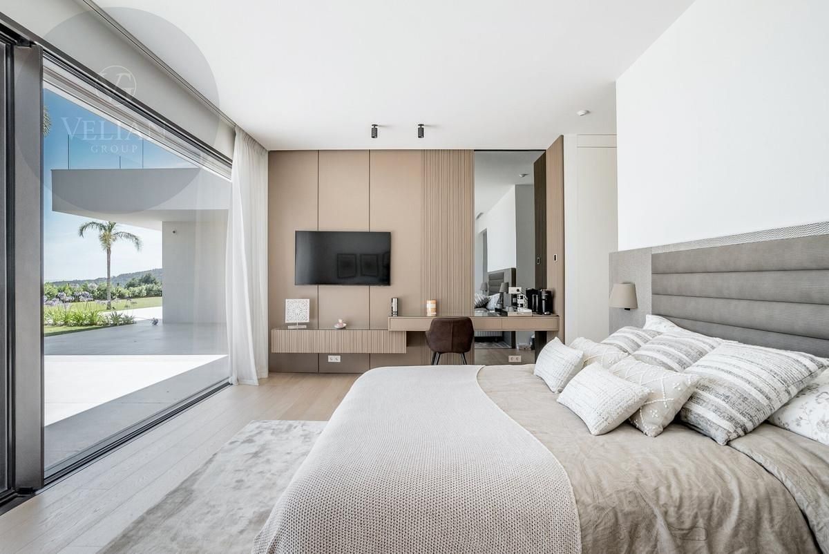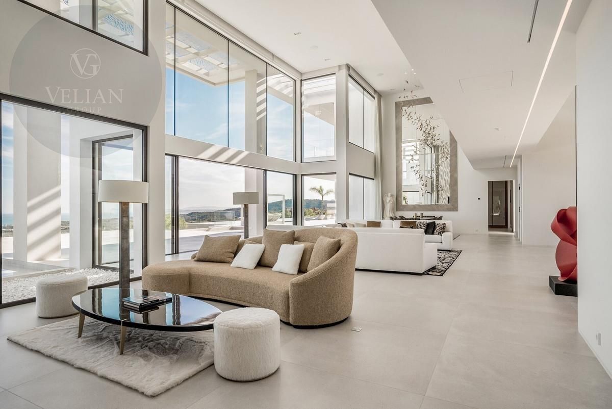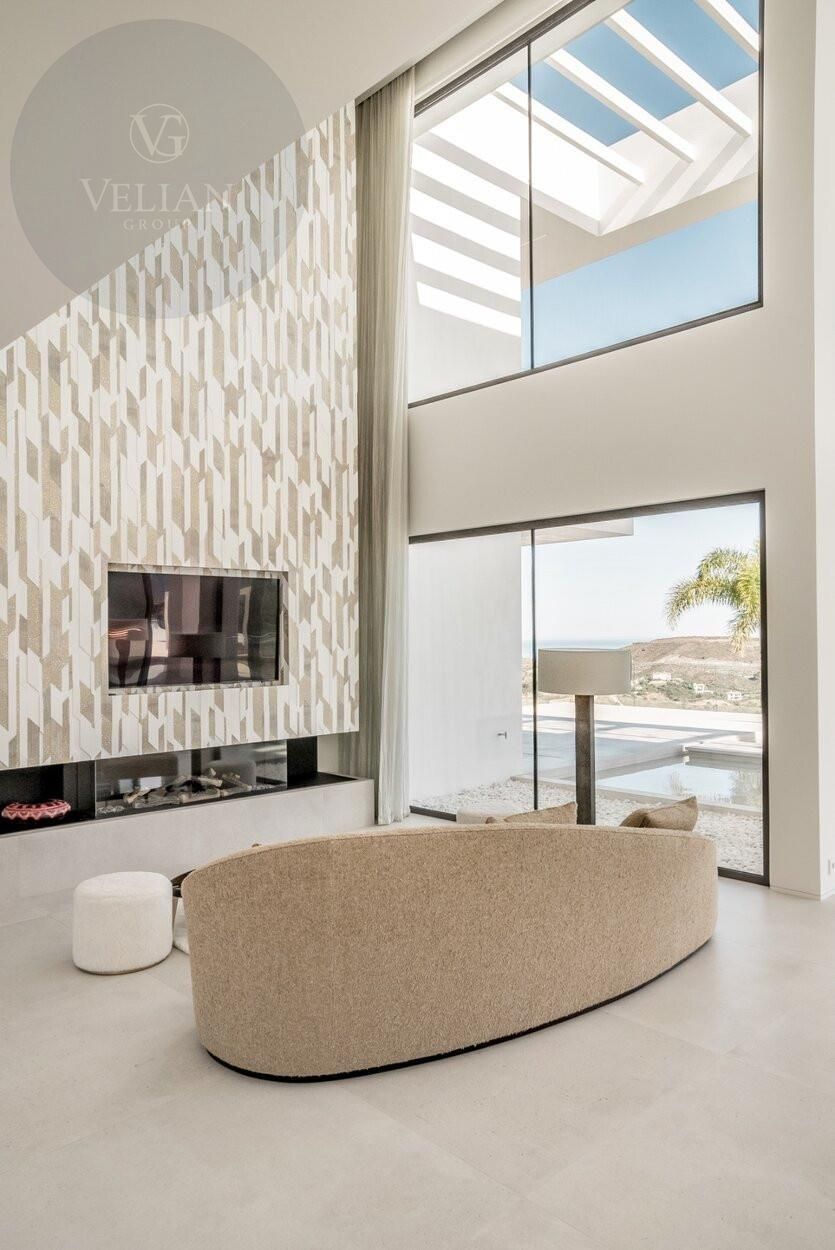 Al entrar en el salón, usted es inmediatamente golpeado por la grandeza del espacio. Los techos amarrados, alcanzando una altura impresionante de 8-10 metros, crean una sensación de apertura y hermética. La luz natural inunda la habitación desde las enormes ventanas que se extienden desde el suelo hasta el techo, mostrando impresionantes vistas panorámicas del mar y el paisaje circundante. El salón se integra perfectamente con el espacio de terraza, desdibujando los límites entre el interior y el exterior.