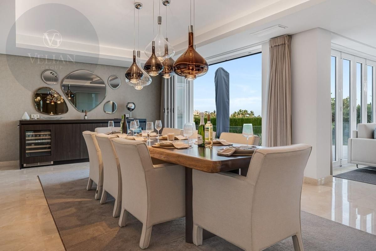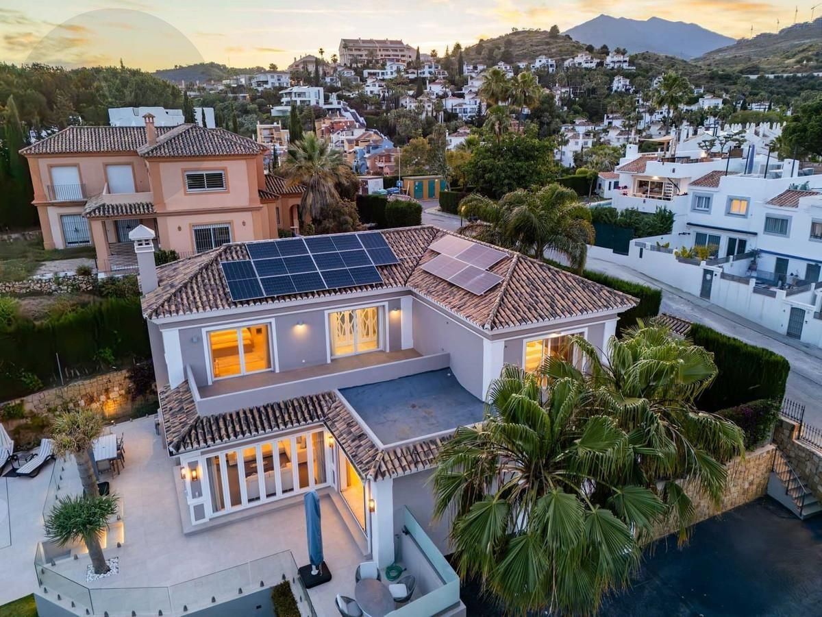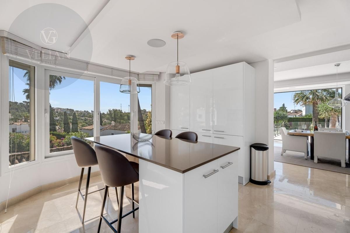 La villa cuenta con seis amplios dormitorios y cinco baños completos, cuatro de ellos en suite, además de un aseo para invitados, proporcionando máxima comodidad e independencia. El salón principal, con chimenea y suelos de mármol, se conecta a una terraza privada con vistas panorámicas al mar y la montaña. La cocina, totalmente equipada y con zona de office, se complementa con una cocina auxiliar y un práctico lavadero. El comedor, independiente y luminoso, resulta ideal para reuniones familiares y eventos sociales.