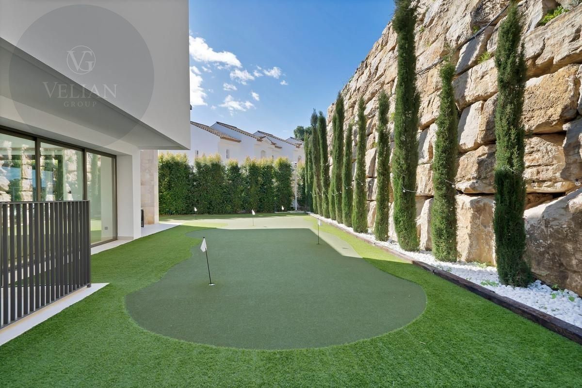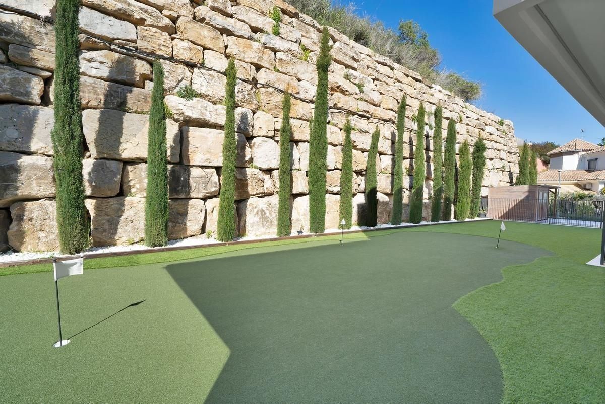 Diseñada pensando en los amantes del golf, la villa cuenta con hoyos para patear en el jardín y un simulador de golf profesional, ofreciendo una experiencia única sin salir de casa.
