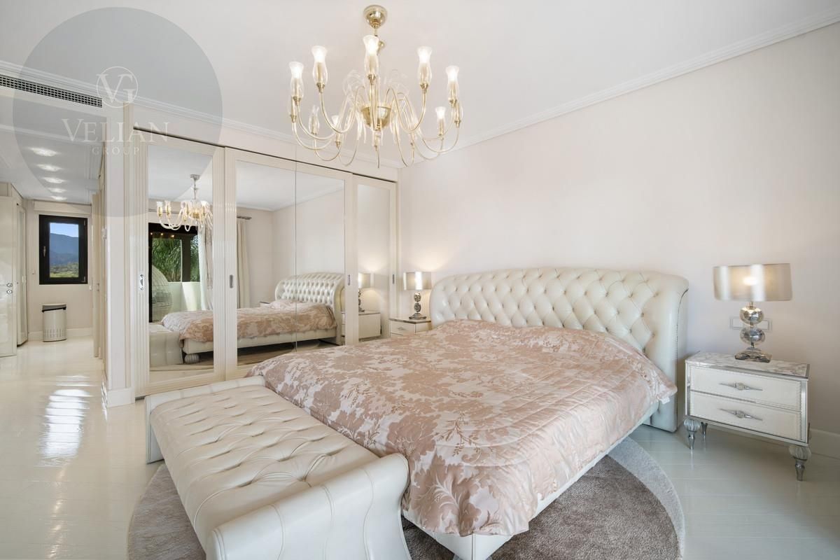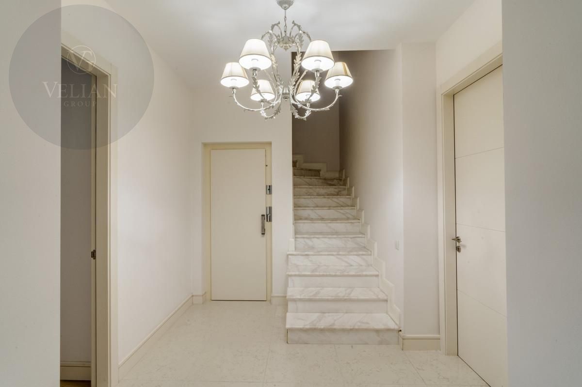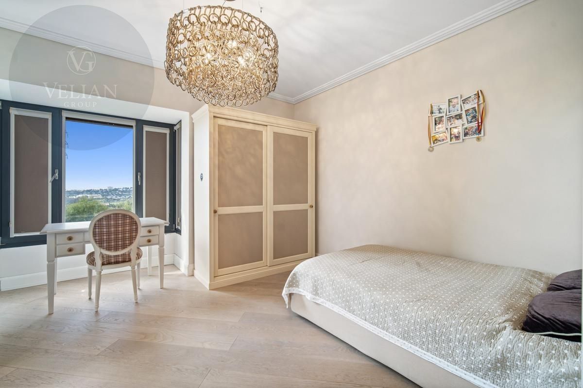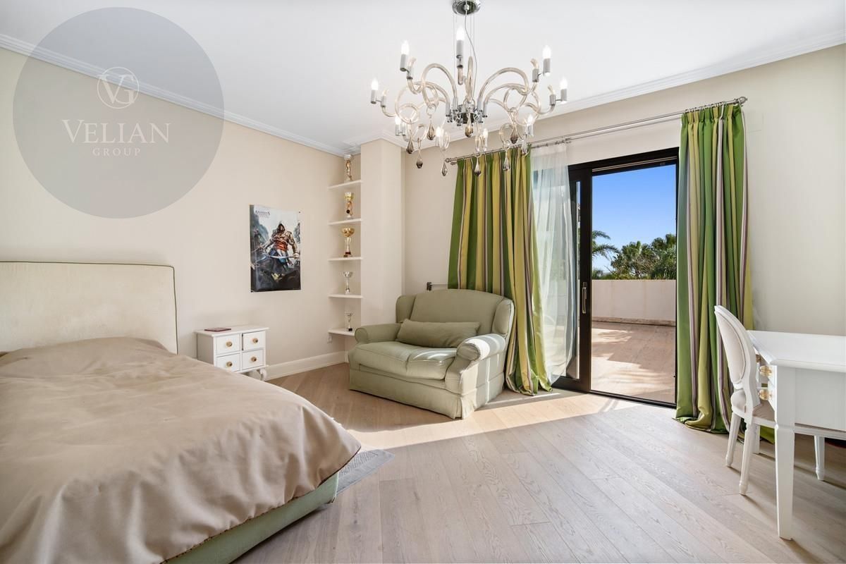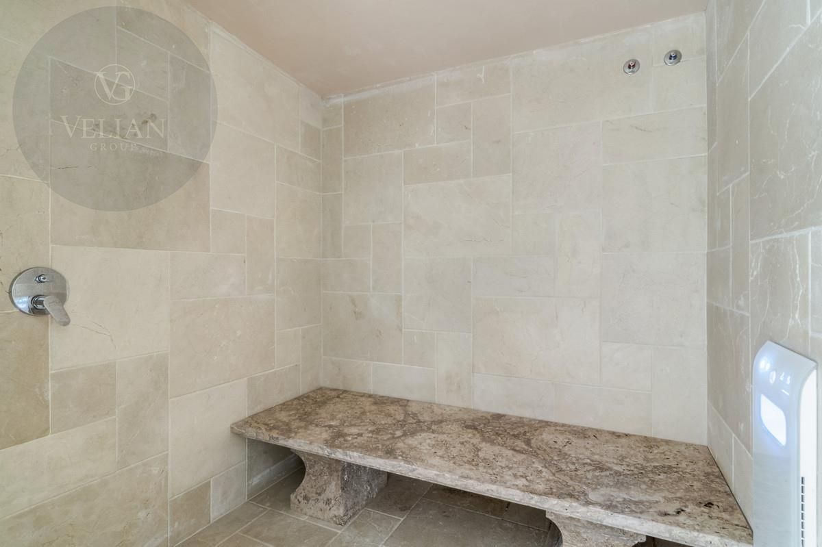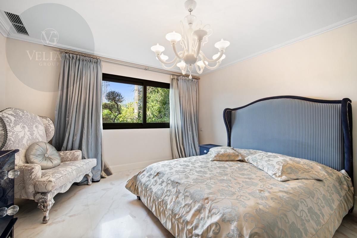 La planta superior tiene tres dormitorios, cada uno con baño en suite, y una terraza soleada con vistas parciales al mar. El sótano consta de dos dormitorios adicionales con baños, una sala de juegos, un lavadero, una sauna, un hammam y un garaje con suficiente espacio para cuatro coches. La casa también tiene su propio ascensor.