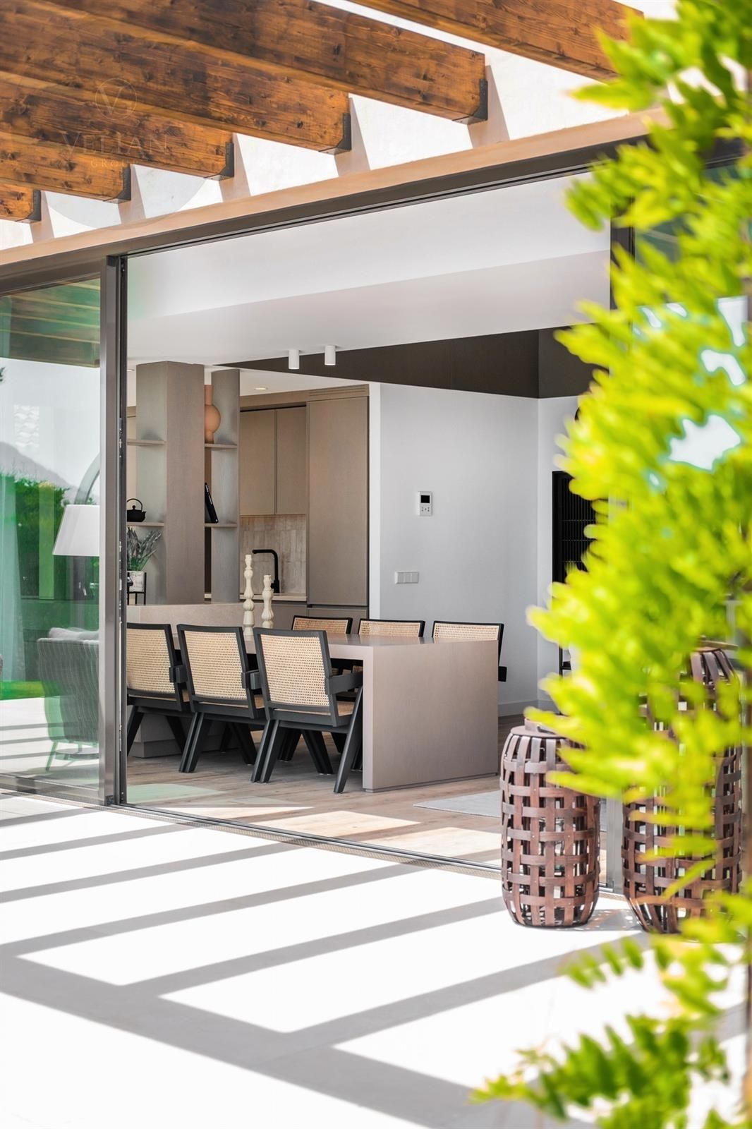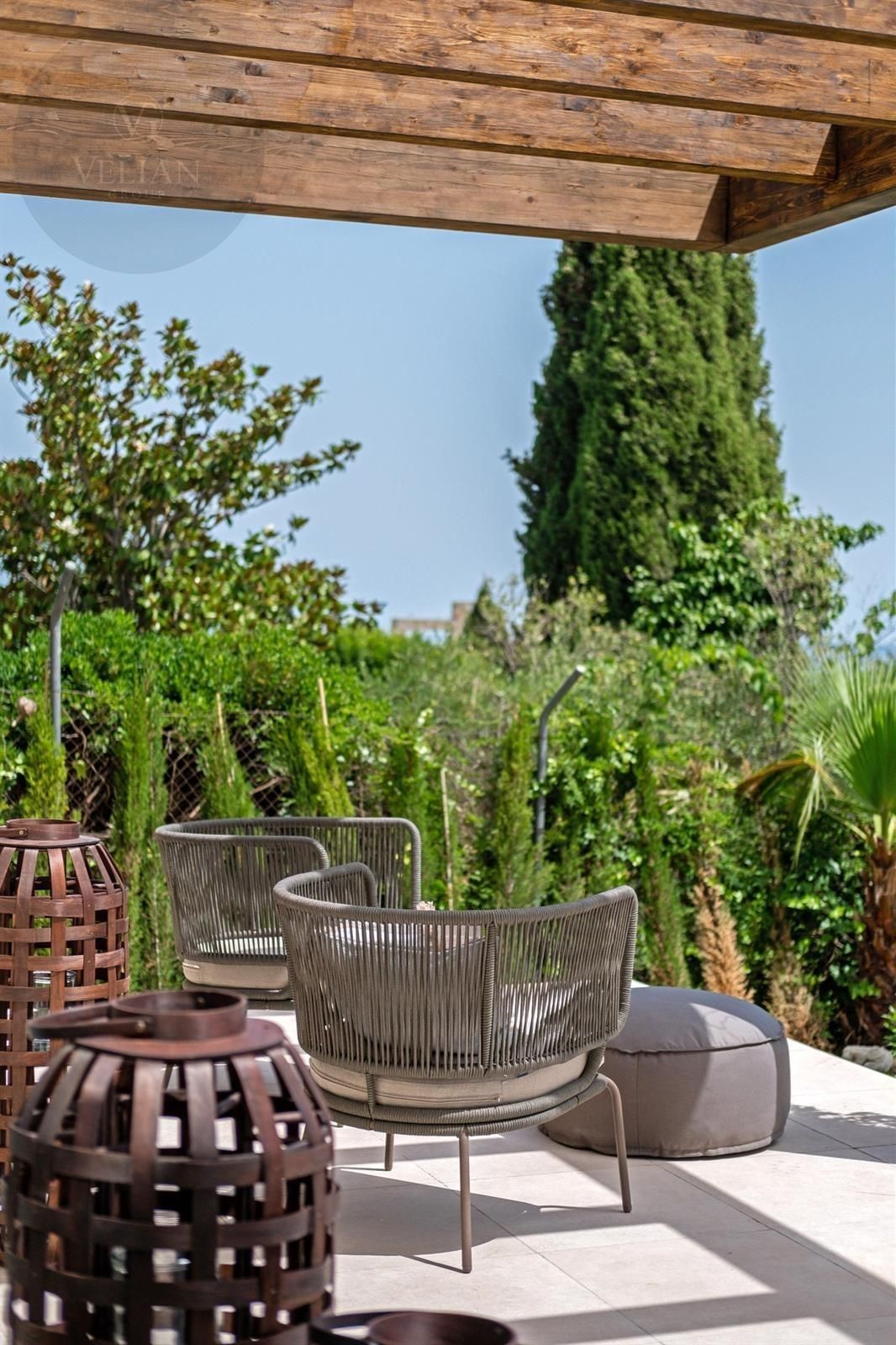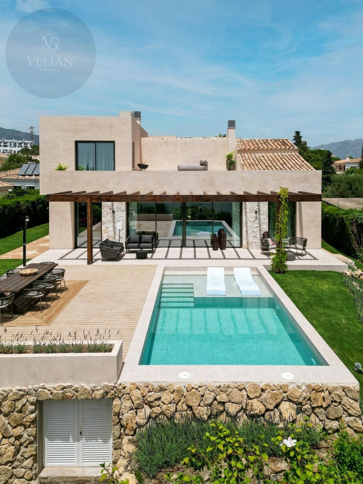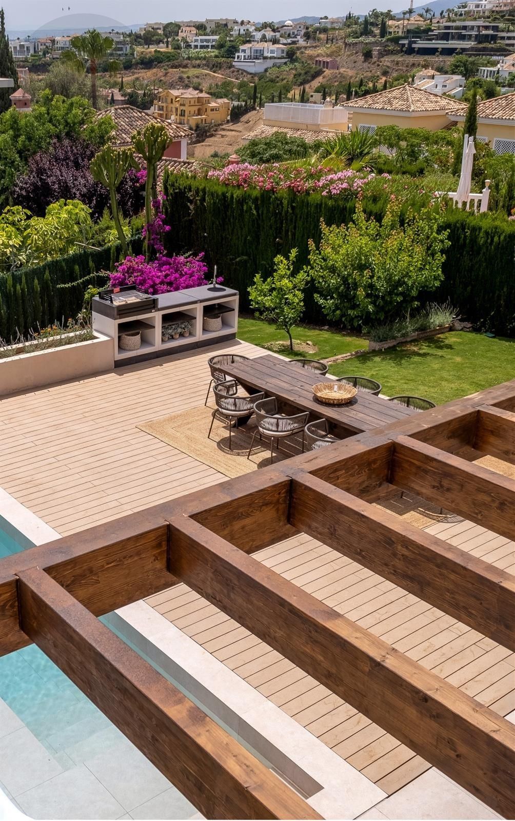 Los espacios exteriores de esta propiedad son tan atractivos como su interior. La terraza cubierta da acceso a un jardín paisajístico y cuenta con una piscina infinita que realza las vistas panorámicas al mar. Camas de sol integradas brindan el lugar ideal para disfrutar del sol mediterráneo, mientras que una terraza, pérgola, área de barbacoa y espacios chill-out crean el ambiente perfecto para reuniones sociales o para una relajación pacífica. Al caer el día, la terraza al atardecer ofrece un escenario ideal para noches de cine bajo las estrellas con su exclusivo cine nocturno a la luz de la luna.