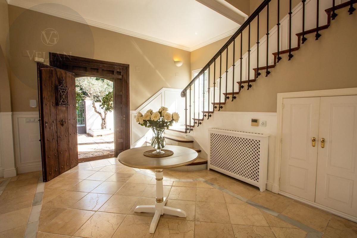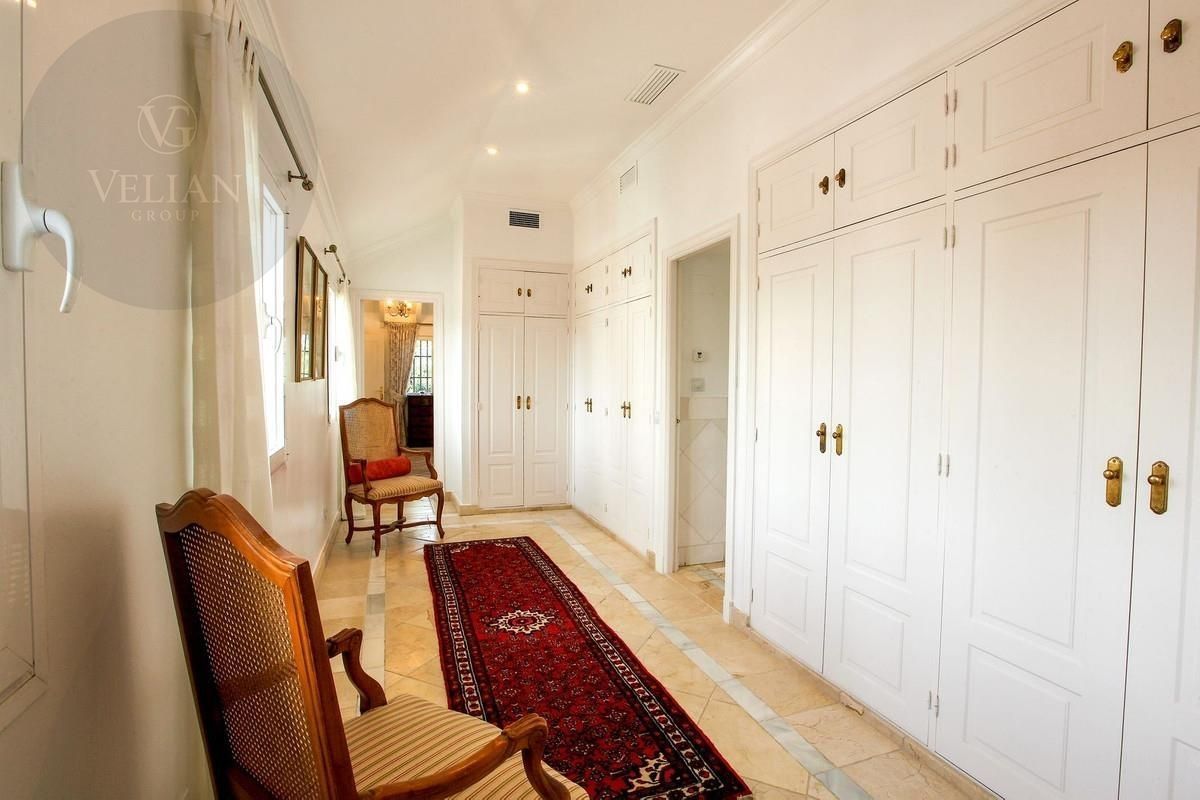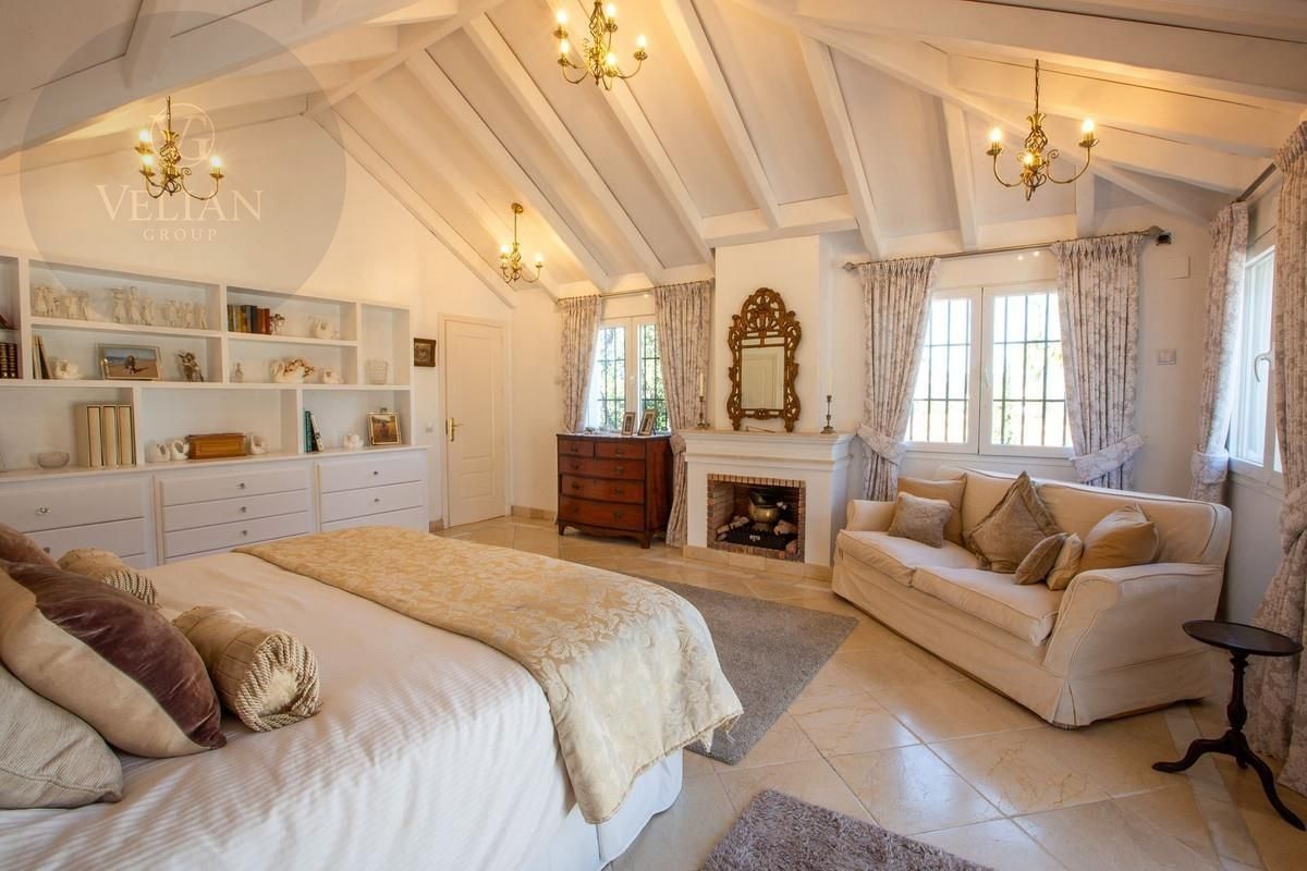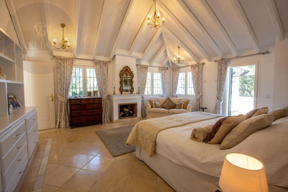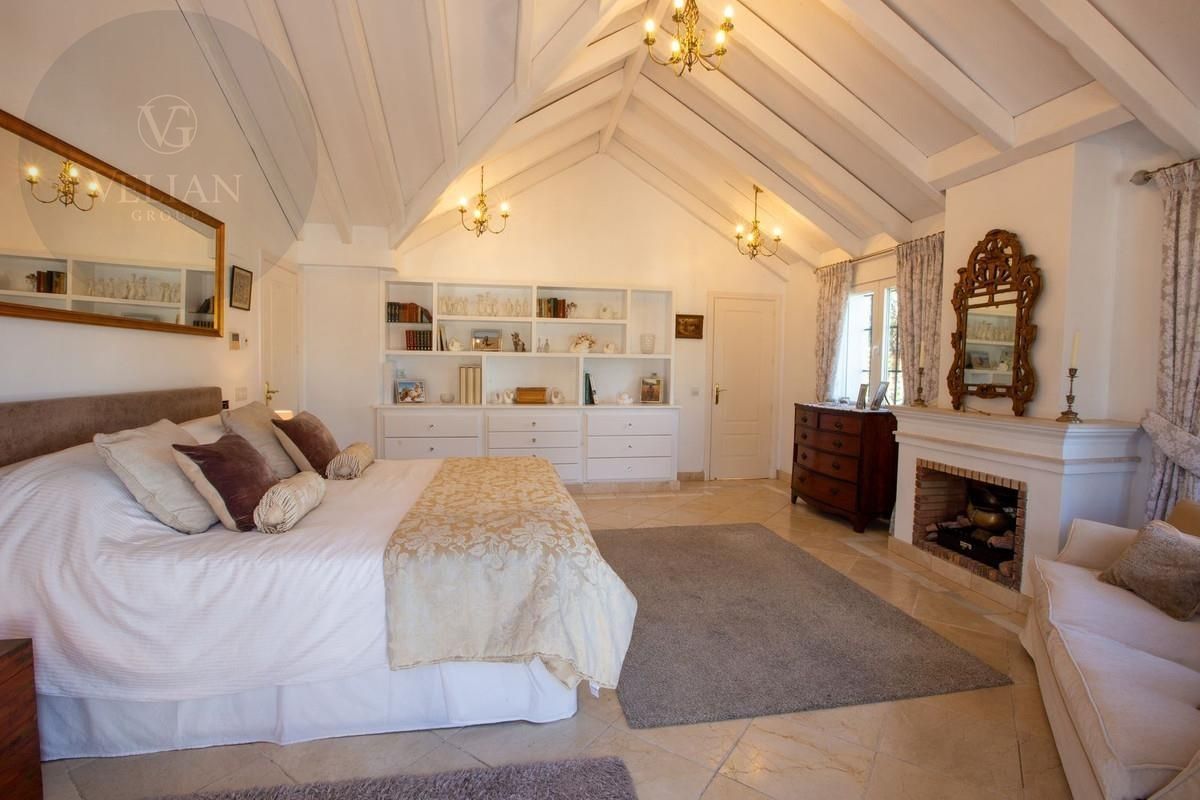 La villa cuenta con una entrada de doble altura que conduce a un espacioso salón con una gran y acogedora chimenea. Con cinco dormitorios en suite y un cuarto adicional para el personal de servicio, cada dormitorio está equipado con armarios de madera de alta calidad, y la suite principal incluye su propia chimenea para mayor confort.