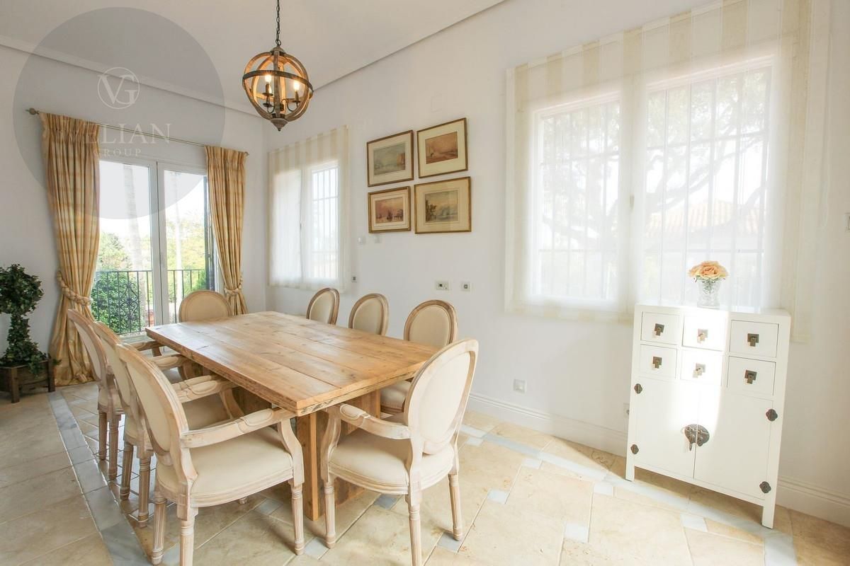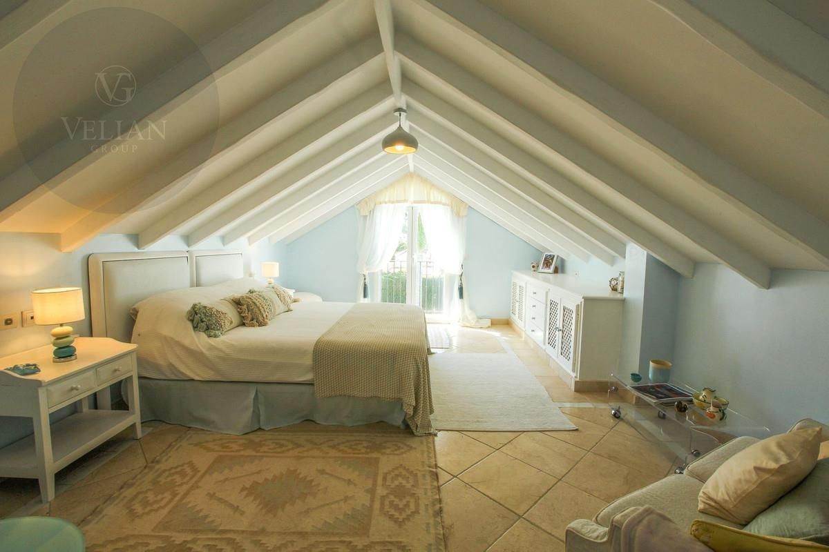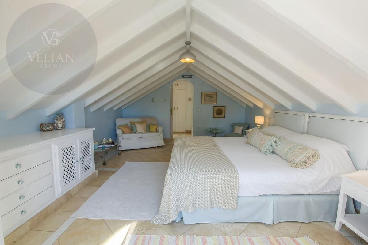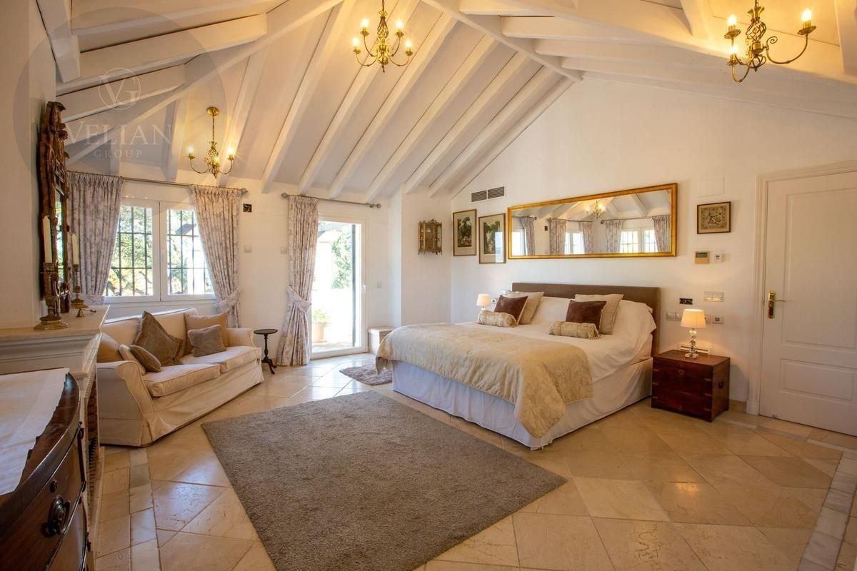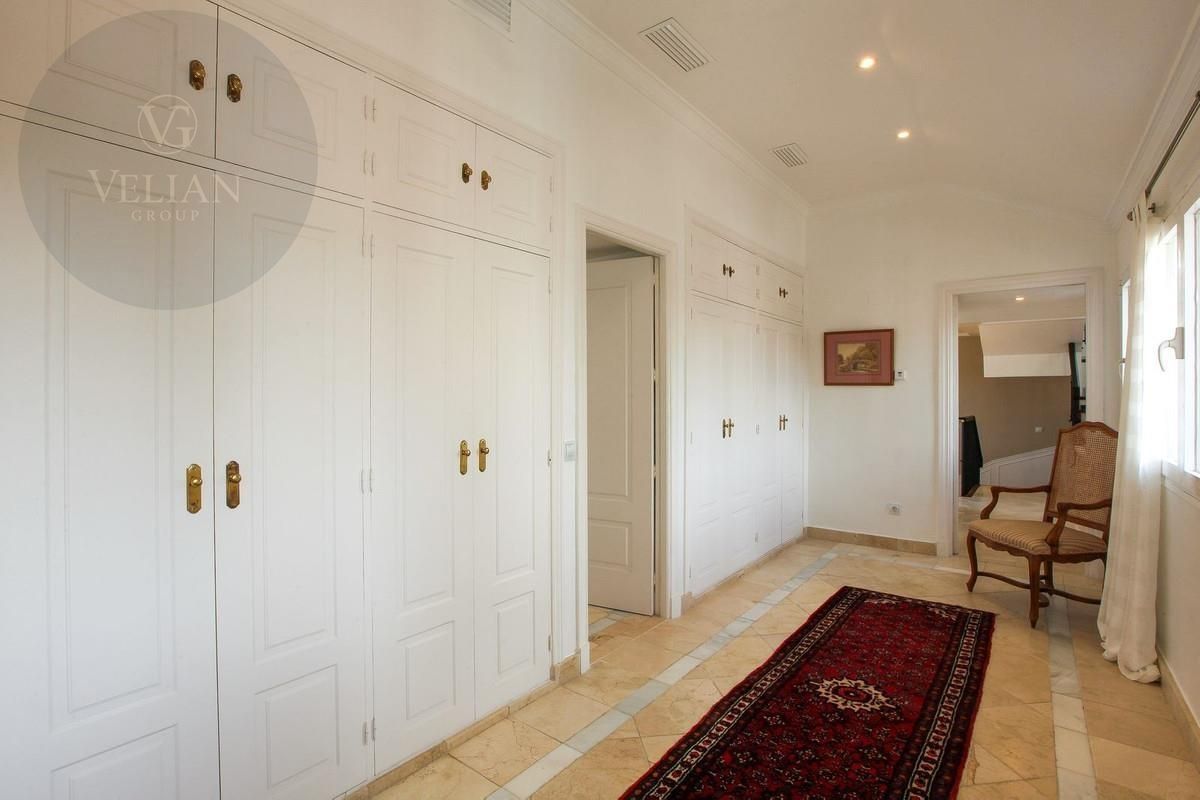 La villa cuenta con una entrada de doble altura que conduce a un espacioso salón con una gran y acogedora chimenea. Con cinco dormitorios en suite y un cuarto adicional para el personal de servicio, cada dormitorio está equipado con armarios de madera de alta calidad, y la suite principal incluye su propia chimenea para mayor confort.