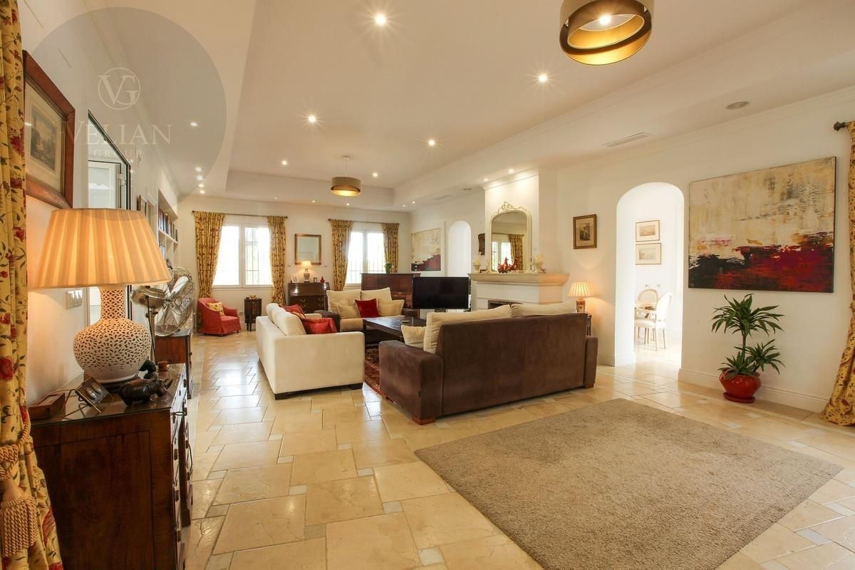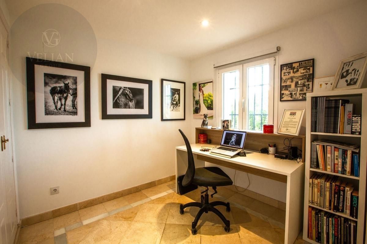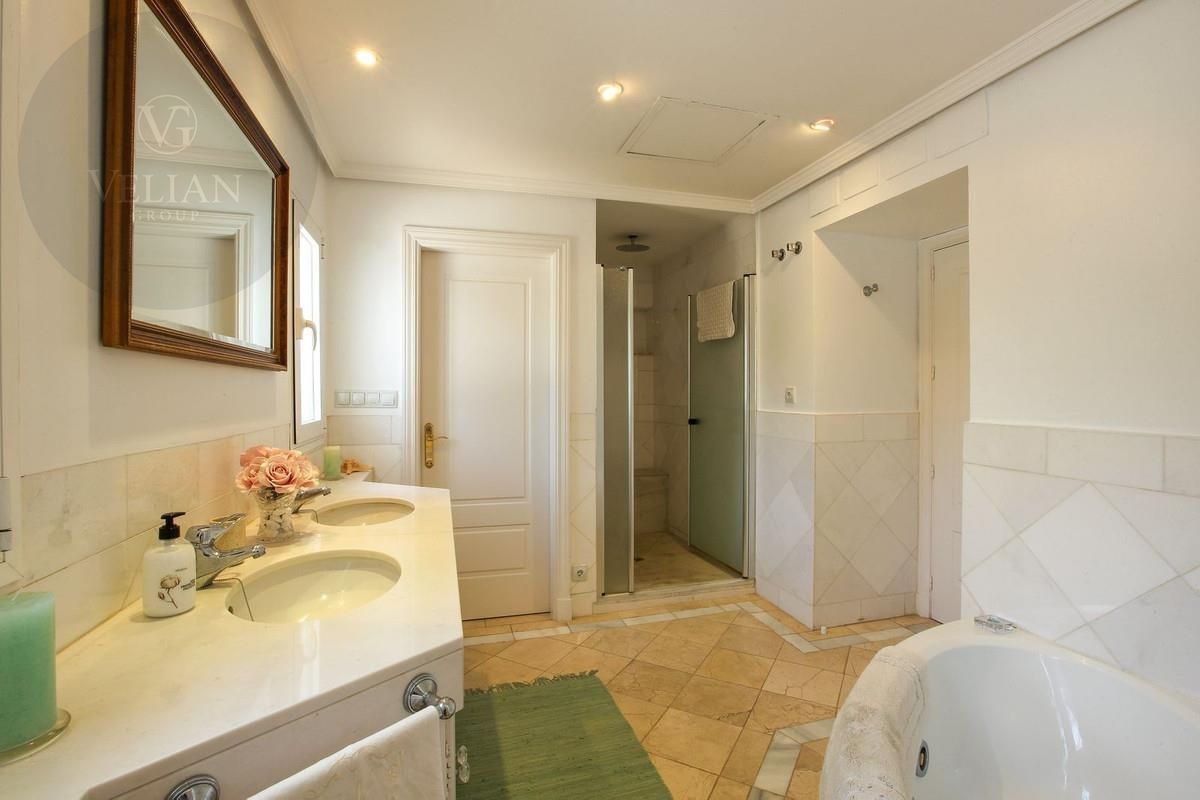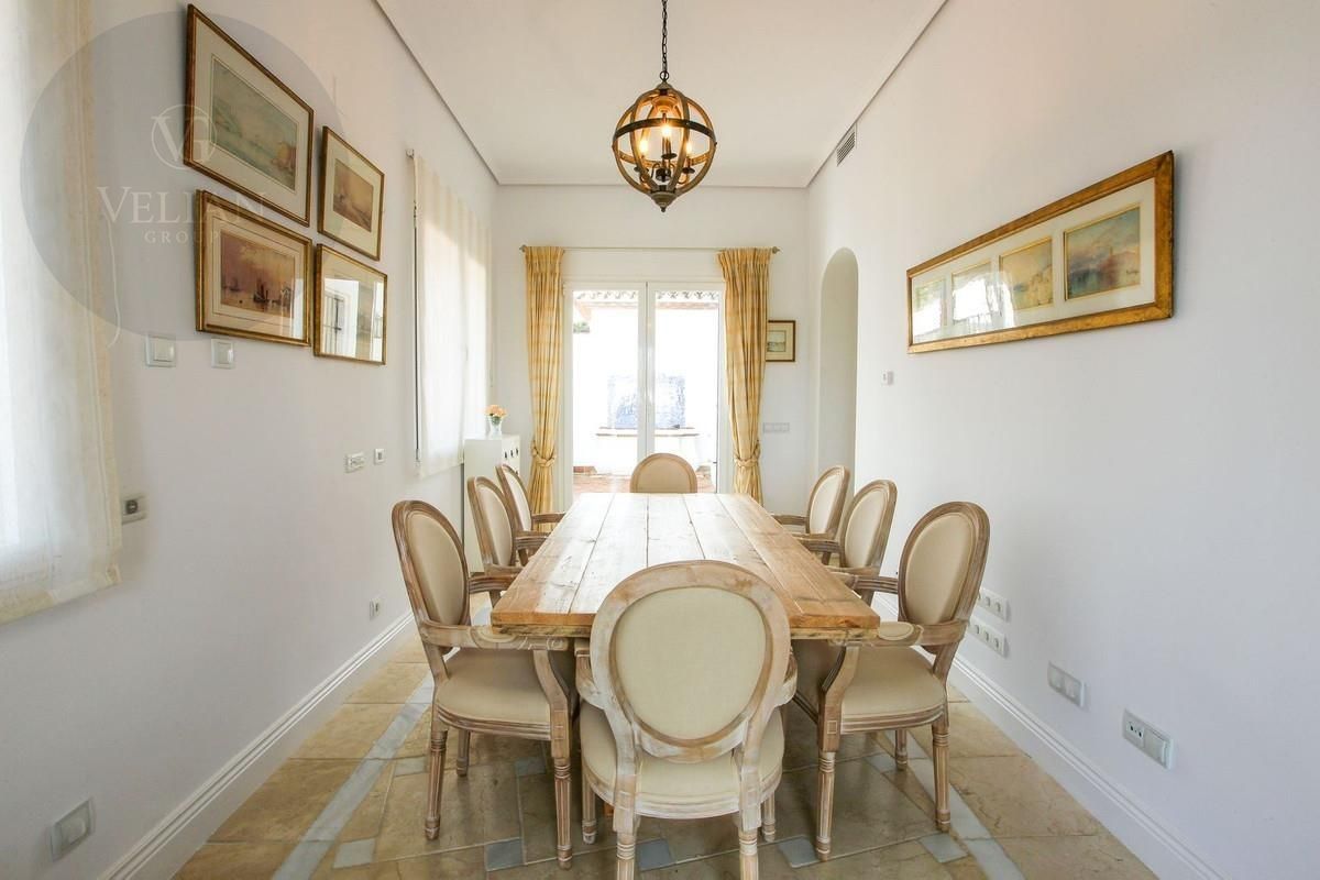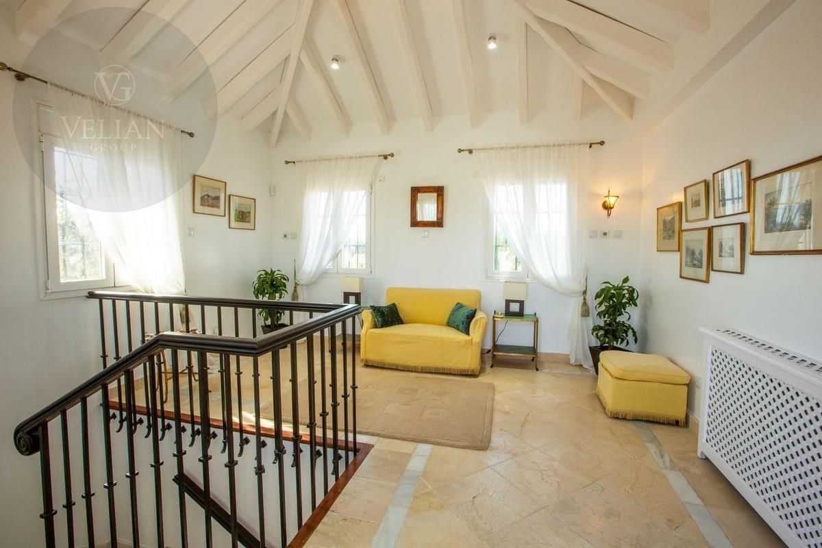 La villa cuenta con una entrada de doble altura que conduce a un espacioso salón con una gran y acogedora chimenea. Con cinco dormitorios en suite y un cuarto adicional para el personal de servicio, cada dormitorio está equipado con armarios de madera de alta calidad, y la suite principal incluye su propia chimenea para mayor confort.