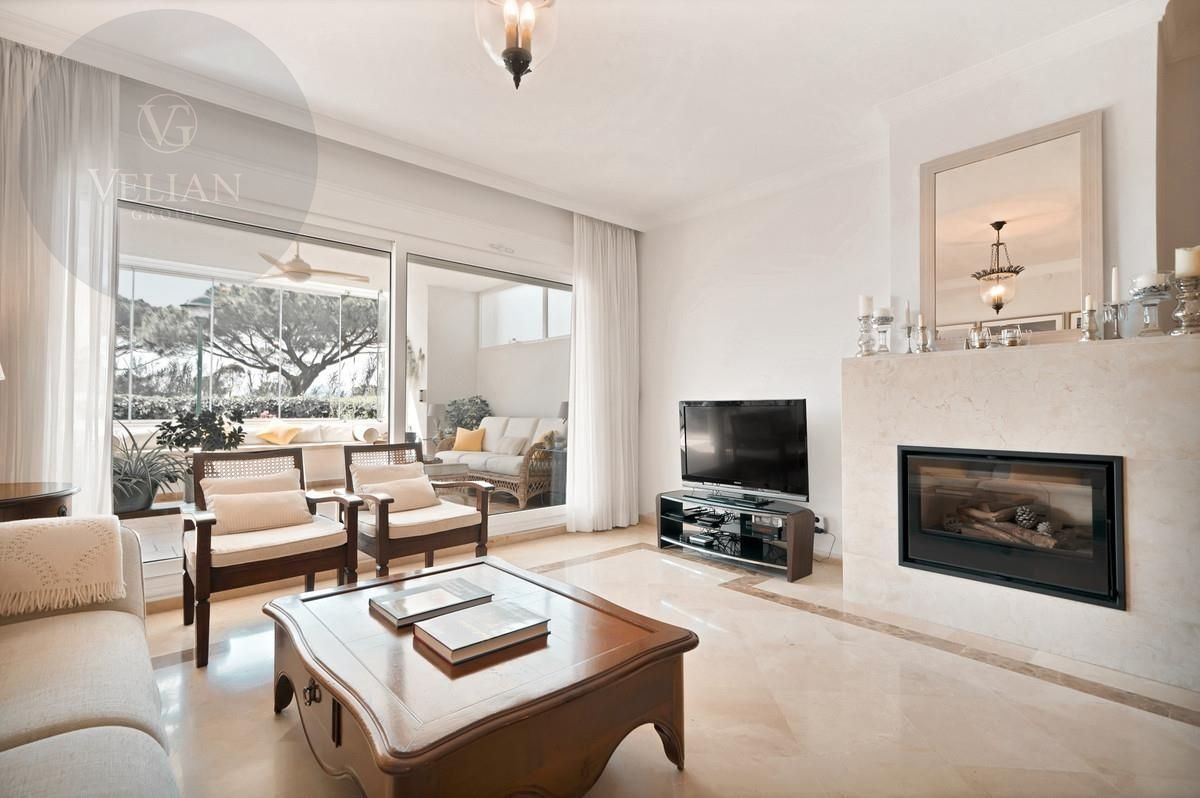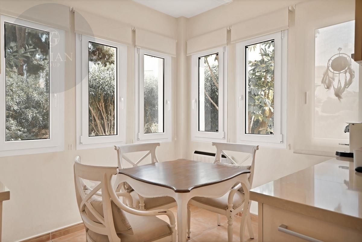 Espacios Amplios y Luminosos: Dispone de un amplio salón-comedor con chimenea, ideal para disfrutar en familia o con invitados. Los grandes ventanales y el acceso directo al jardín privado aportan una atmósfera luminosa y abierta, con vistas despejadas al mar y al campo de golf.