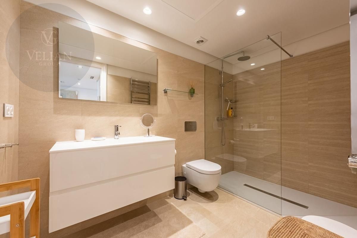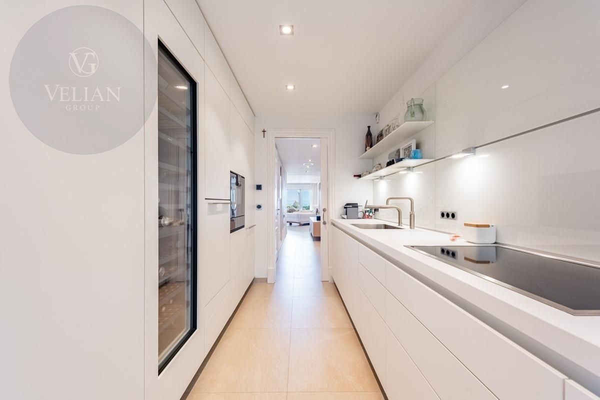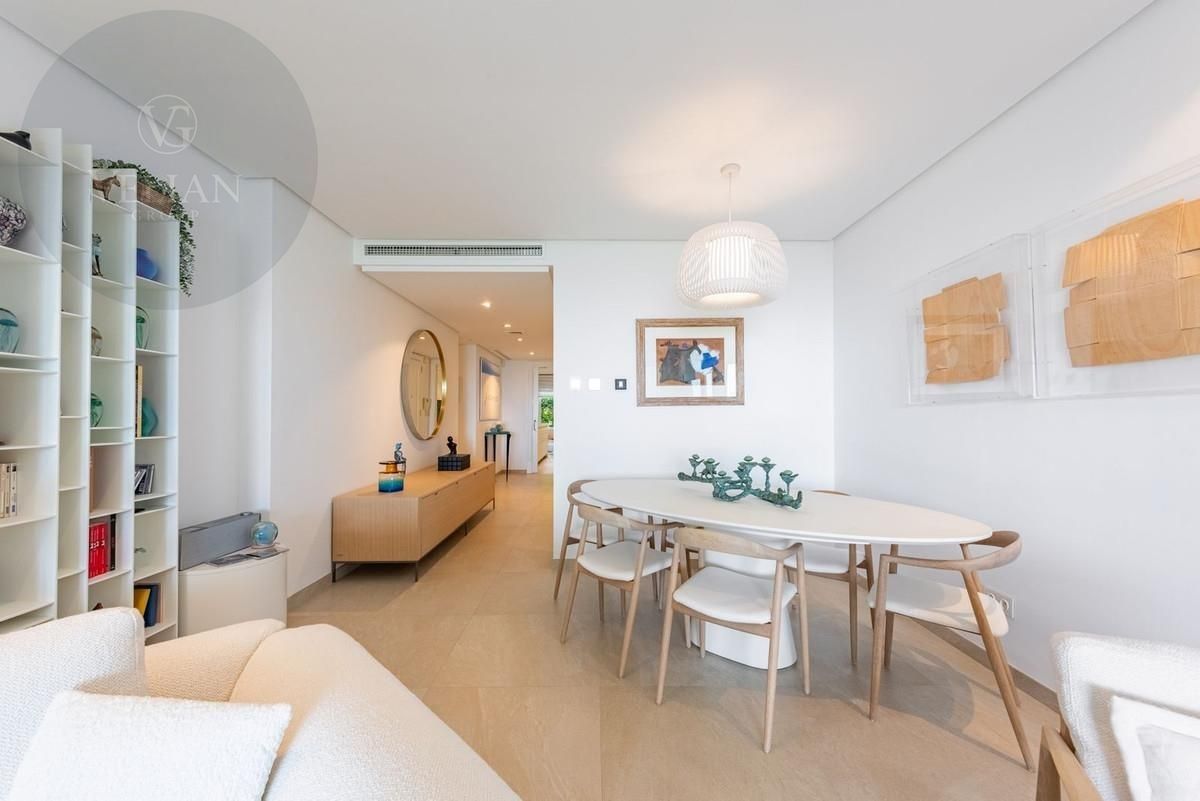 En el interior, un acogedor vestíbulo conduce a una luminosa y espaciosa sala de estar de concepto abierto, conectándose sin interrupciones a una gran terraza acristalada, ideal para disfrutar durante todo el año. La cocina moderna totalmente equipada cuenta con un cuarto de servicio adyacente para mayor comodidad. La suite principal incluye un lujoso baño en suite, mientras que el dormitorio de invitados disfruta de su propia terraza privada y un baño separado.