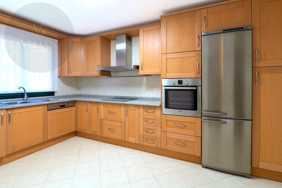 Desde aquí, el salón comedor de planta abierta conduce a la terraza exterior. El comedor tiene una mesa con 6 sillas y un bonito aparador. Todos los muebles son adecuados para este espacioso apartamento. Una chimenea abierta en pleno funcionamiento brinda comodidad y elegancia adicionales, además de brindar excelentes opciones para las acogedoras noches de invierno.