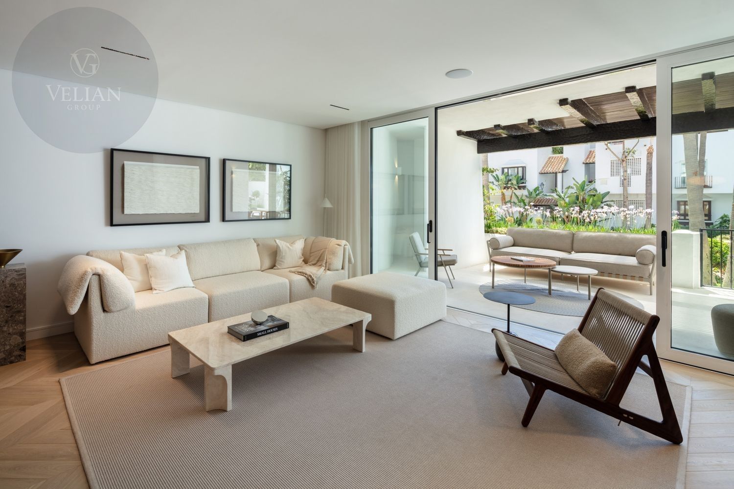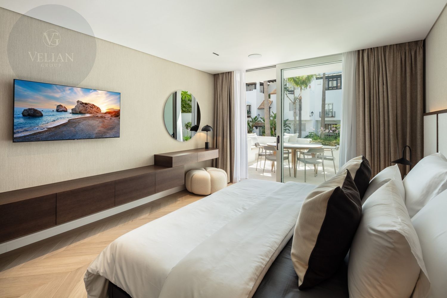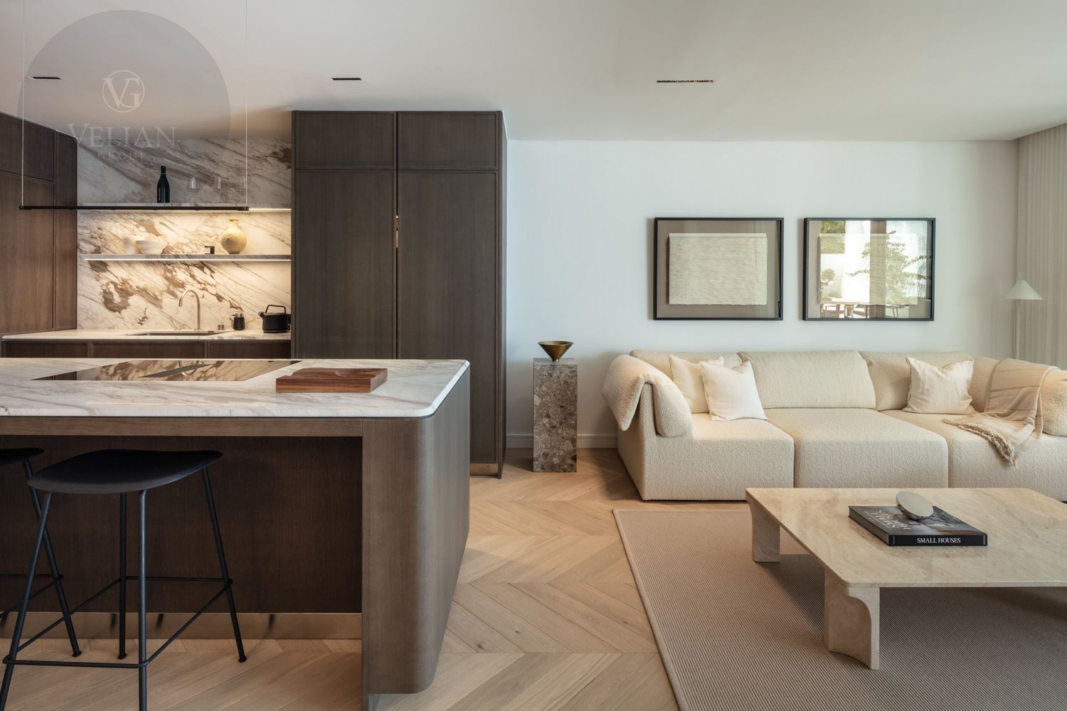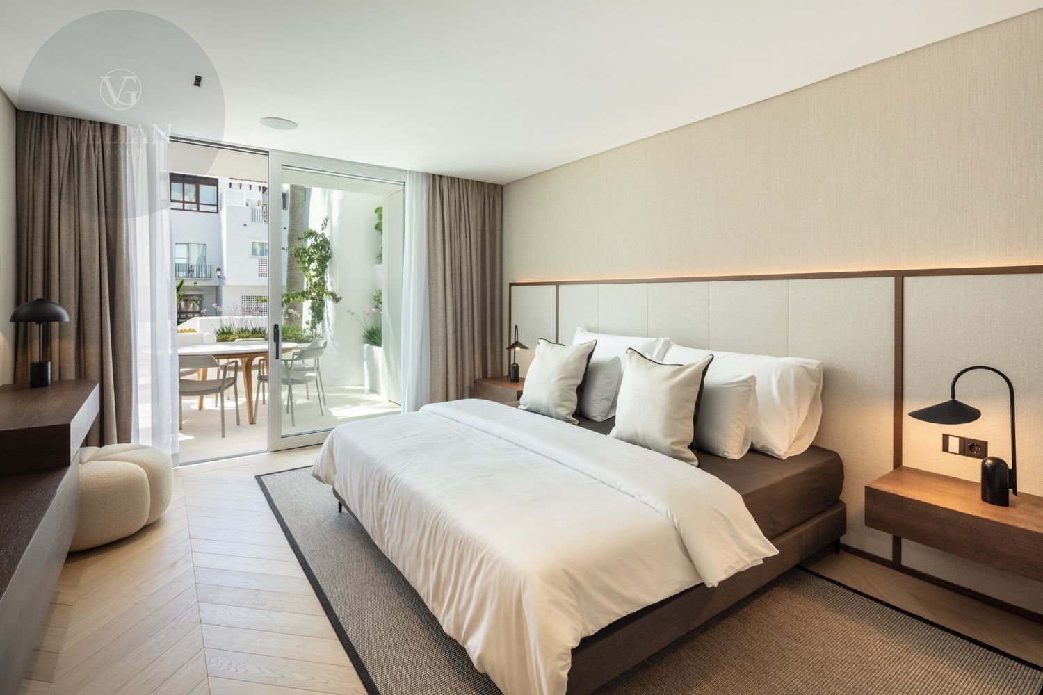 Iberis 12 es un impresionante y moderno apartamento con vistas al mar situado en el exclusivo enclave de Puente Romano Resort, en la Milla de Oro de Marbella. Iberis 12 emana sofisticación junto al mar, abrazando su entorno complejo para representar el estilo de vida mediterráneo de lujo. El apartamento cuenta con una impresionante terraza cubierta y amplia, que ofrece cenas al aire libre y una zona chill-out. Desde la terraza, los residentes pueden disfrutar del hermoso jardín comunitario y de las vistas al mar, creando un ambiente relajante. La terraza tiene acceso directo al salón y al dormitorio principal gracias a las puertas correderas de cristal que van del suelo al techo. El moderno y sofisticado diseño interior se aprecia a través de la cocina abierta, el comedor y el salón. Las tres zonas se combinan a la perfección para crear un espacio cómodo y estético. Los colores neutros y los toques de madera natural del suelo y los armarios de la cocina complementan el espacio. El mobiliario y los acabados modernos decoran el espacio con elegancia, maximizando la comodidad y la practicidad, al tiempo que resultan agradables a la vista. La cocina, totalmente equipada, luce una impresionante isla de cocina con acabados de mármol en la encimera, que también está presente en toda la cocina. Los electrodomésticos de la cocina se pueden sacar de su sitio gracias a su posición dentro de un armario, lo que permite despejar el espacio. Todas las habitaciones están bien equipadas y decoradas con los mejores materiales y muebles, respetando la paleta de colores del diseño interior. Los dormitorios también tienen su propio cuarto de baño. El dormitorio principal es un espacio elegante y acogedor, el lugar ideal para relajarse y descansar. Una ventana de cristal separa el dormitorio del cuarto de baño, donde se puede apreciar la impresionante piedra gris utilizada para el tocador doble, la ducha y la bañera. Con su conveniente ubicación dentro de Puente Romano, los residentes están a pocos minutos de la playa y cerca de todas las comodidades exclusivas que ofrece el Resort y la Milla de Oro de Marbella.