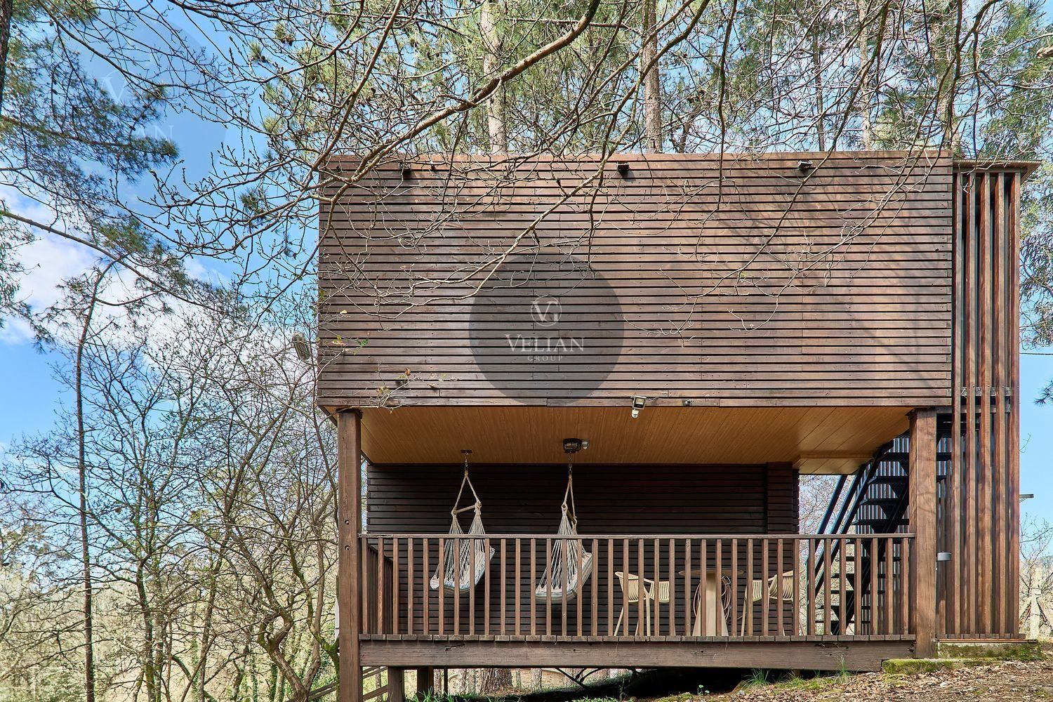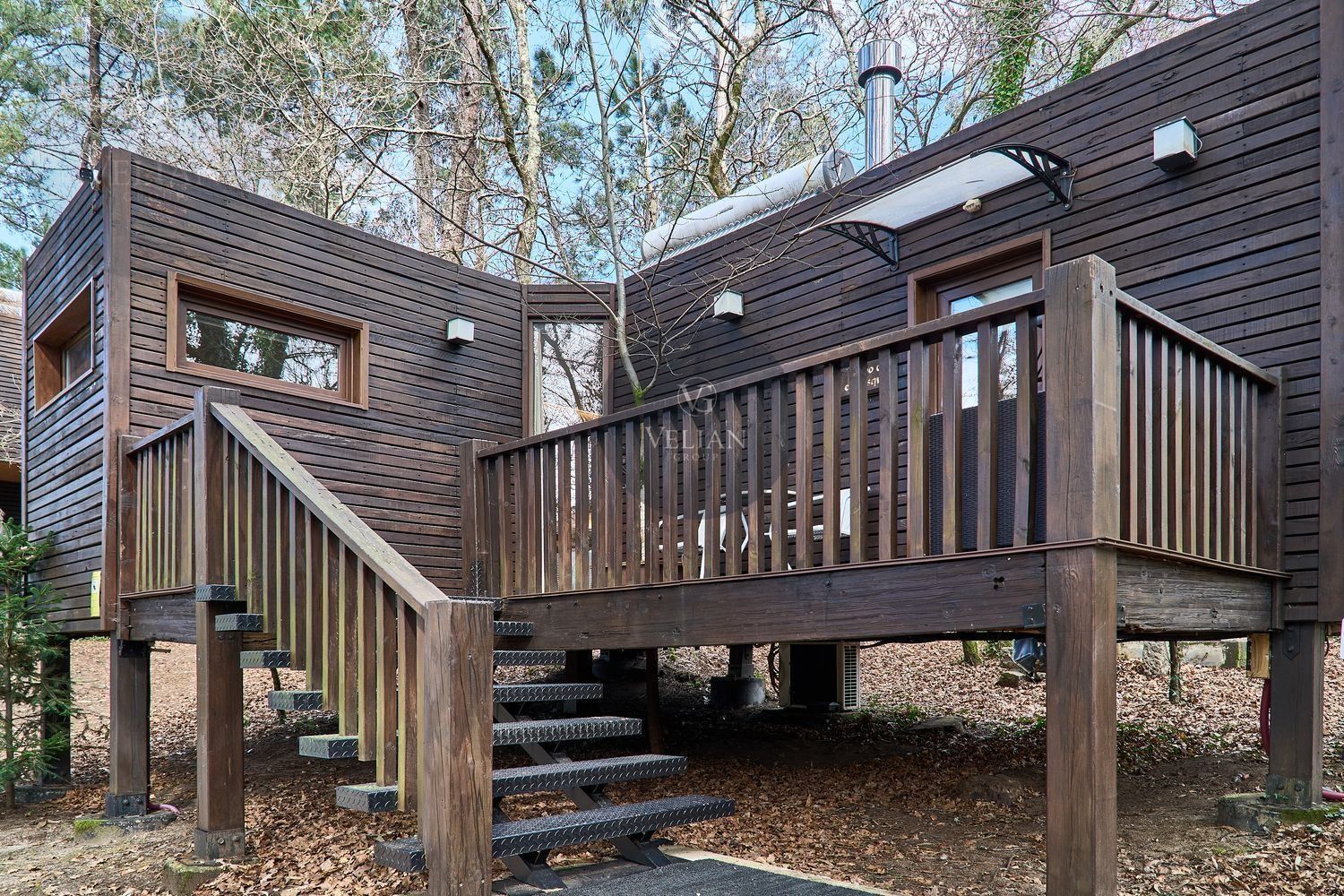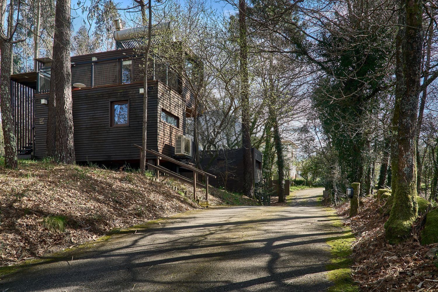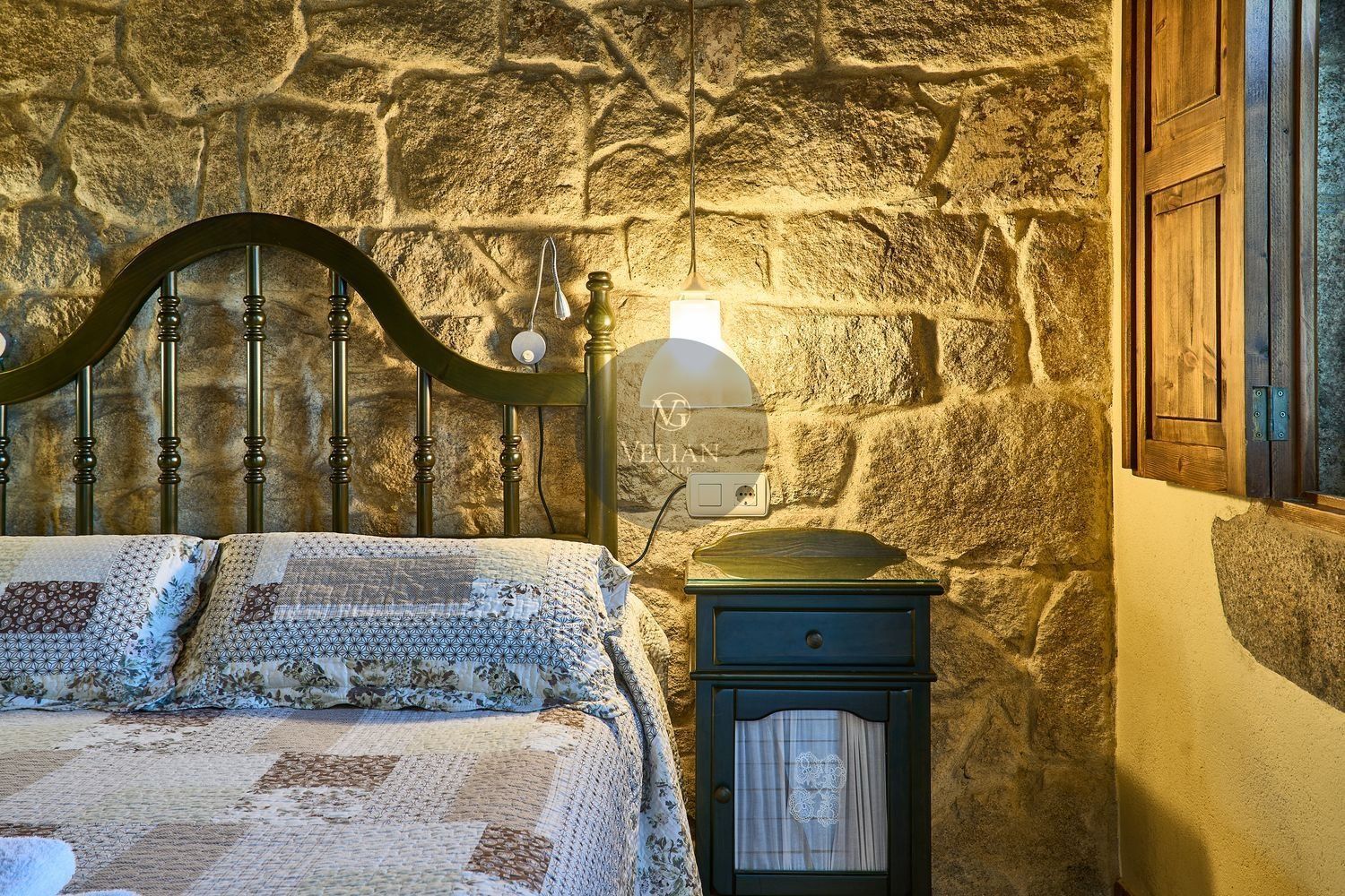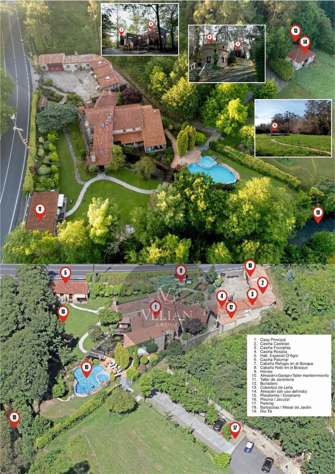 El complejo está compuesto por una casa principal de piedra con seis habitaciones dobles con baño en suite, amplias, luminosas, con calefacción central por gasoil, por suelo radiante y aire acondicionado, ofreciendo una estancia de máximo confort. Además, cuenta con tres cabañas bioclimáticas situadas en el bosque, construidas con contenedores marítimos reciclados y revestidas en madera para una integración perfecta con el entorno. Estas cabañas han sido diseñadas con un enfoque sostenible y funcional, incluyendo chimenea, cocina equipada, televisión, bañera de hidromasaje, terraza privada con barbacoa y acceso a una piscina-jacuzzi compartida. Una de ellas, un antiguo palomar reformado, ha sido convertida en una espectacular suite con un diseño exclusivo.