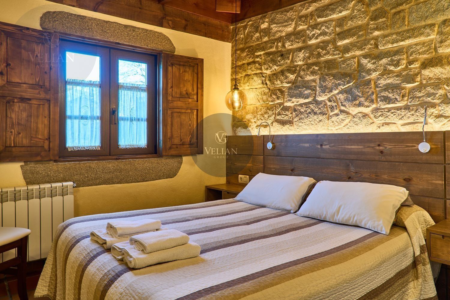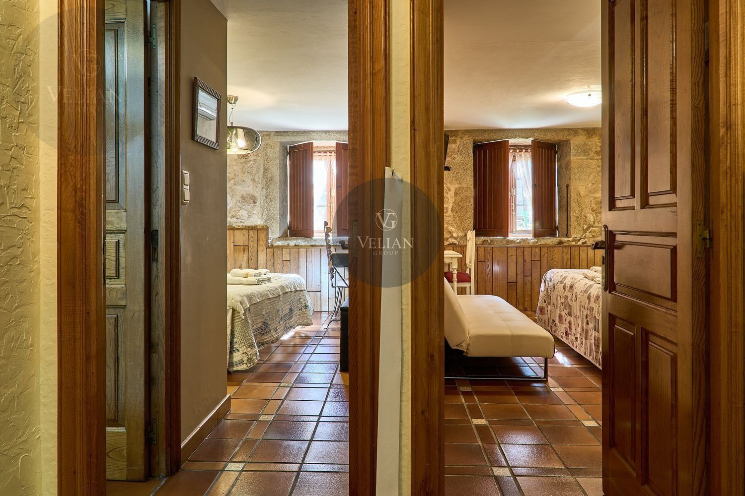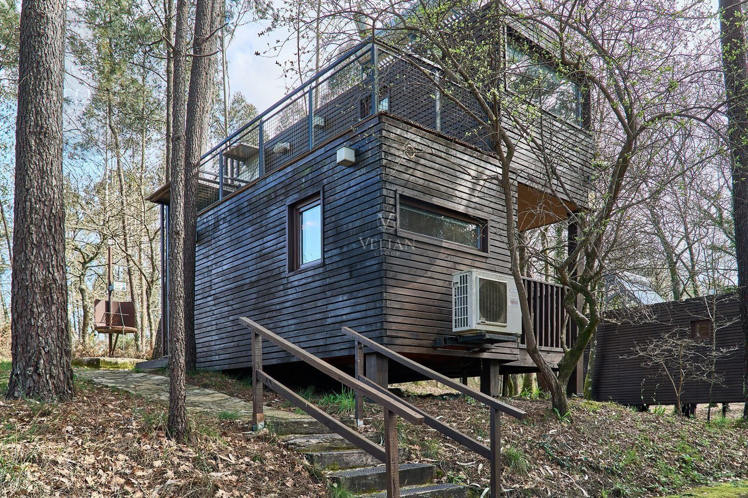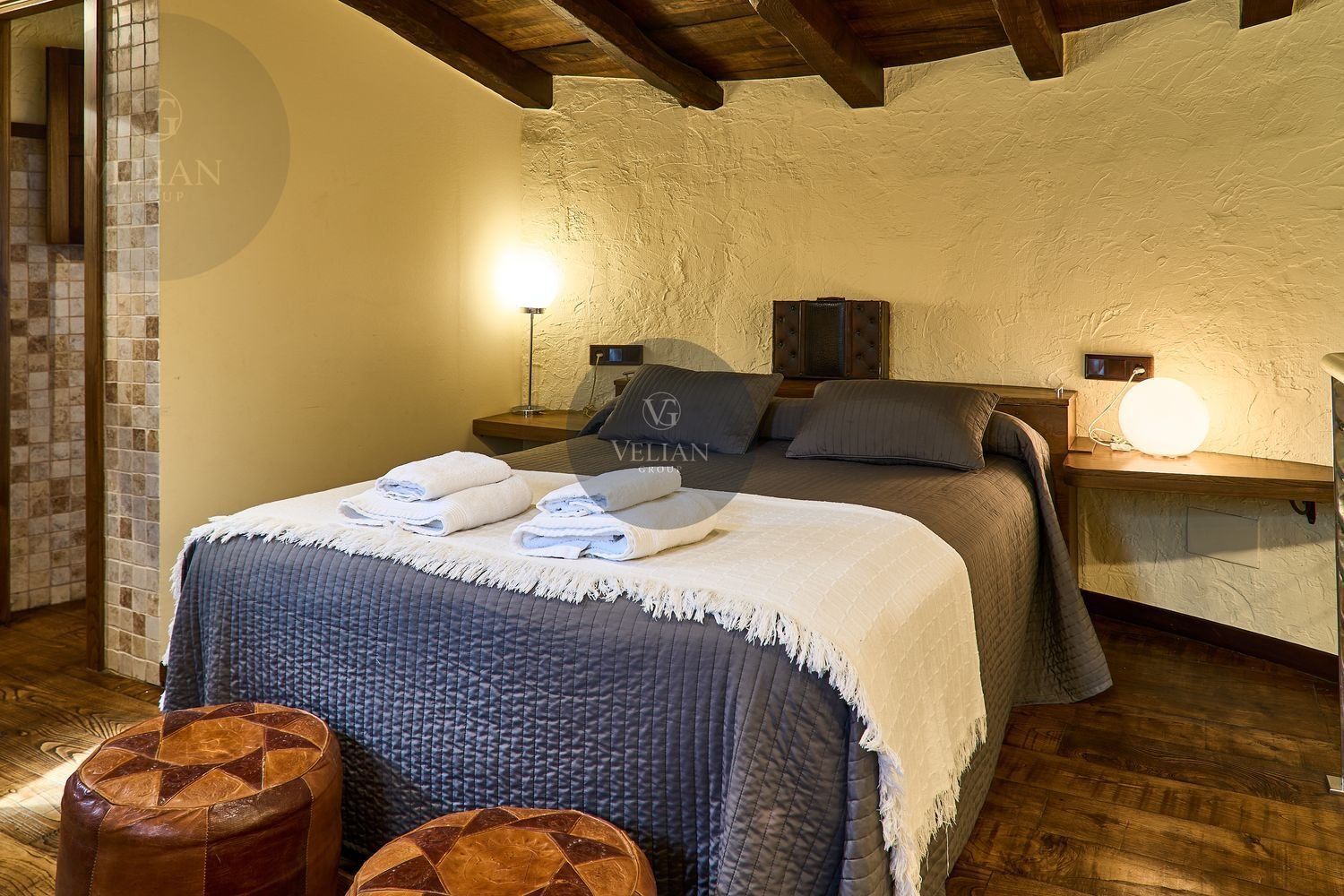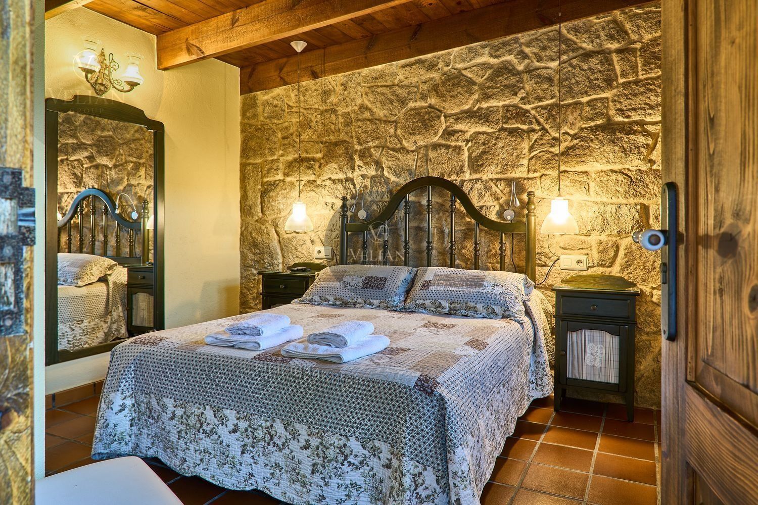 El complejo está compuesto por una casa principal de piedra con seis habitaciones dobles con baño en suite, amplias, luminosas, con calefacción central por gasoil, por suelo radiante y aire acondicionado, ofreciendo una estancia de máximo confort. Además, cuenta con tres cabañas bioclimáticas situadas en el bosque, construidas con contenedores marítimos reciclados y revestidas en madera para una integración perfecta con el entorno. Estas cabañas han sido diseñadas con un enfoque sostenible y funcional, incluyendo chimenea, cocina equipada, televisión, bañera de hidromasaje, terraza privada con barbacoa y acceso a una piscina-jacuzzi compartida. Una de ellas, un antiguo palomar reformado, ha sido convertida en una espectacular suite con un diseño exclusivo.