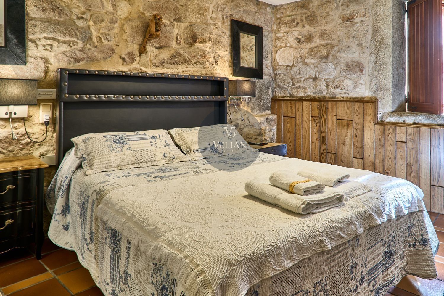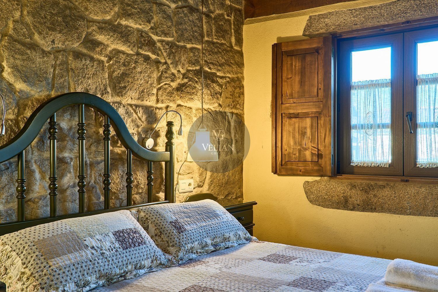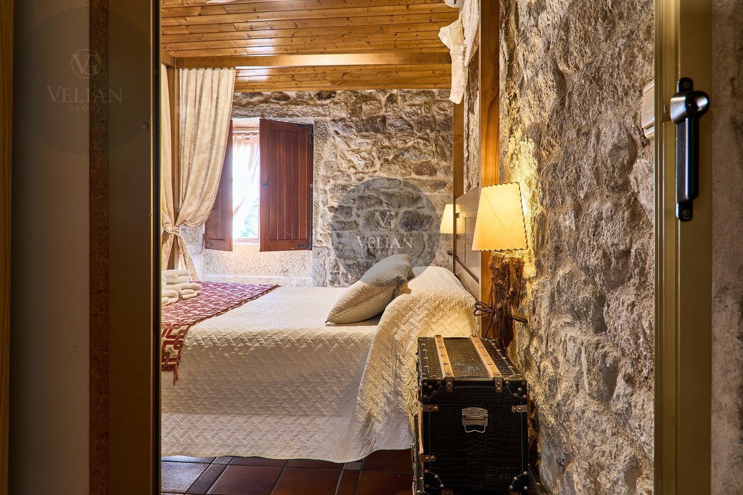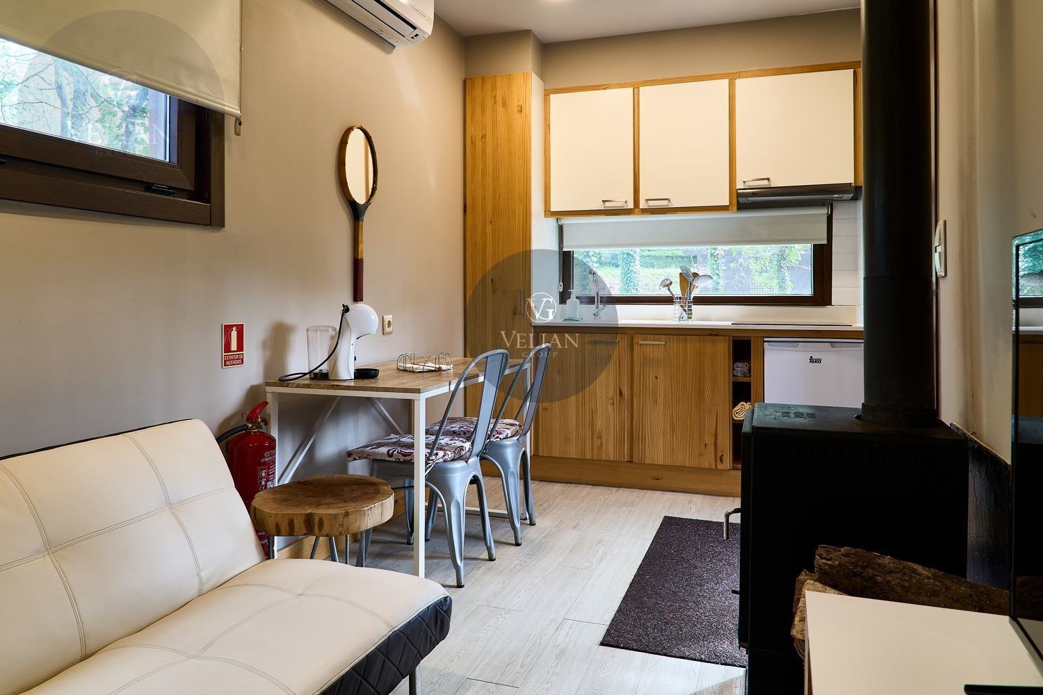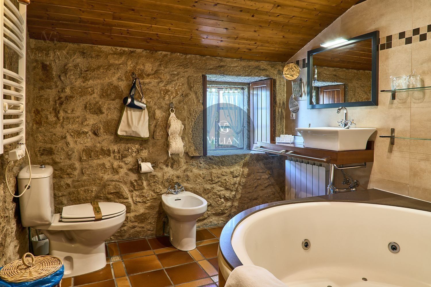 El complejo está compuesto por una casa principal de piedra con seis habitaciones dobles con baño en suite, amplias, luminosas, con calefacción central por gasoil, por suelo radiante y aire acondicionado, ofreciendo una estancia de máximo confort. Además, cuenta con tres cabañas bioclimáticas situadas en el bosque, construidas con contenedores marítimos reciclados y revestidas en madera para una integración perfecta con el entorno. Estas cabañas han sido diseñadas con un enfoque sostenible y funcional, incluyendo chimenea, cocina equipada, televisión, bañera de hidromasaje, terraza privada con barbacoa y acceso a una piscina-jacuzzi compartida. Una de ellas, un antiguo palomar reformado, ha sido convertida en una espectacular suite con un diseño exclusivo.