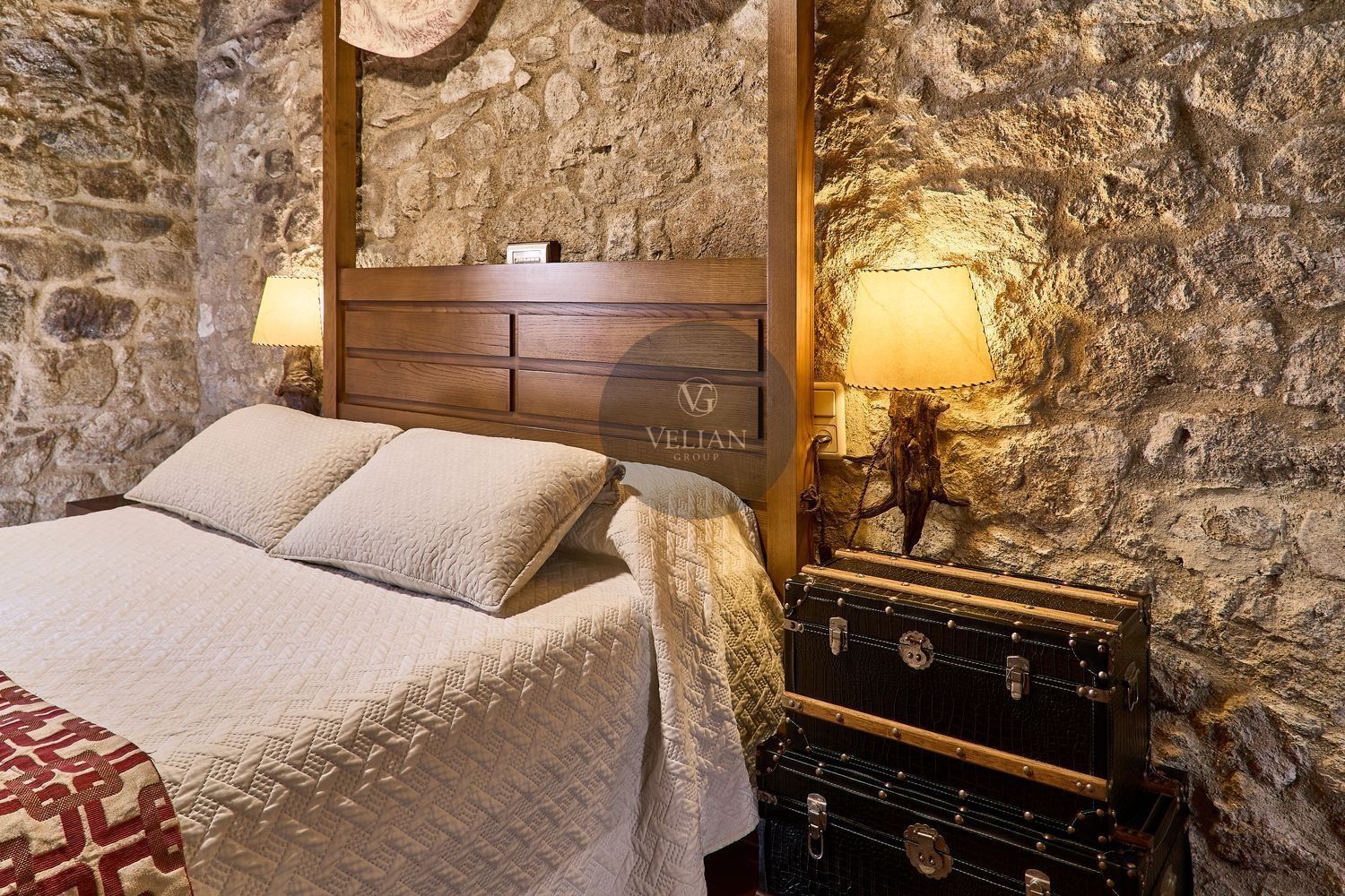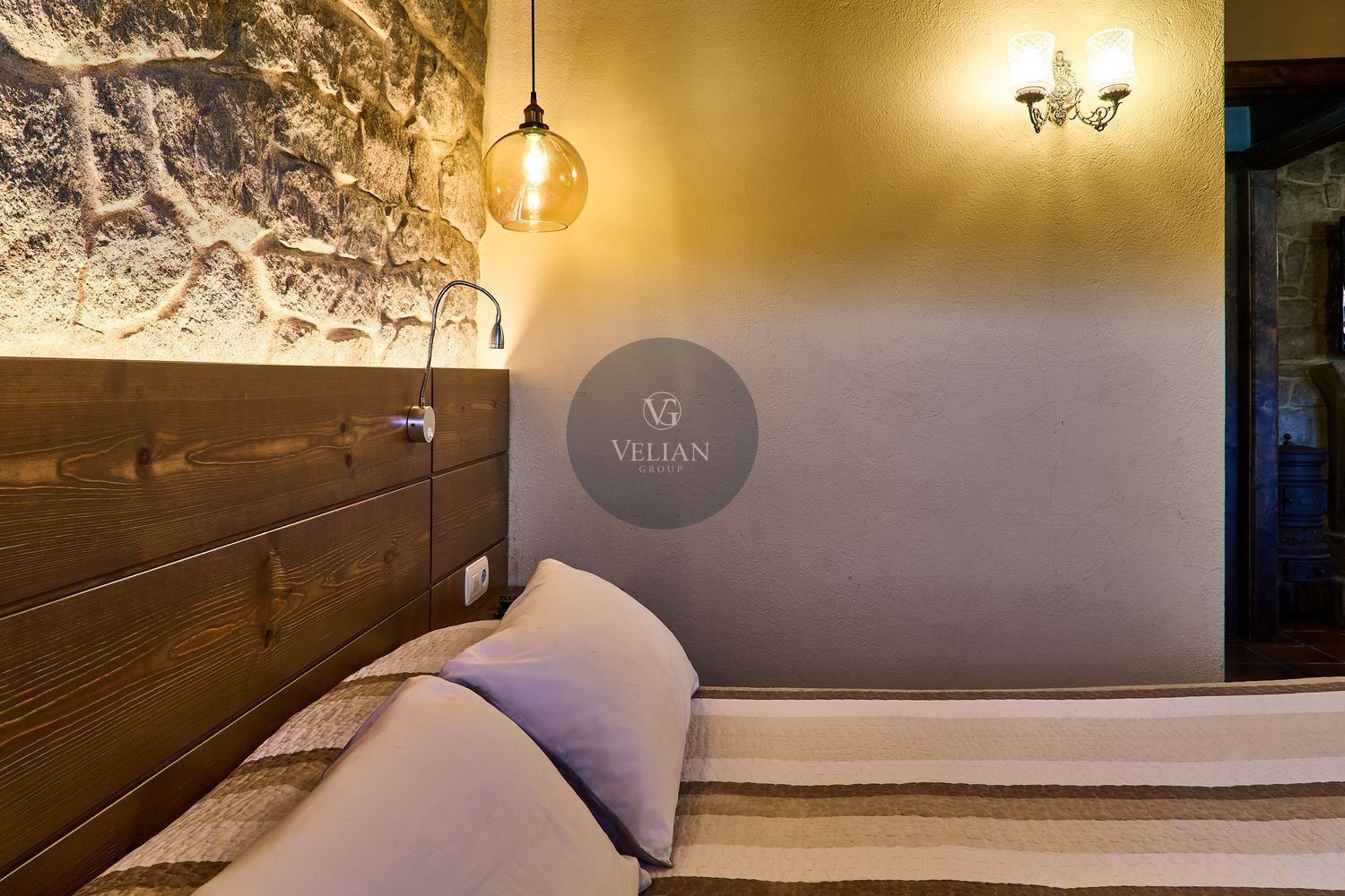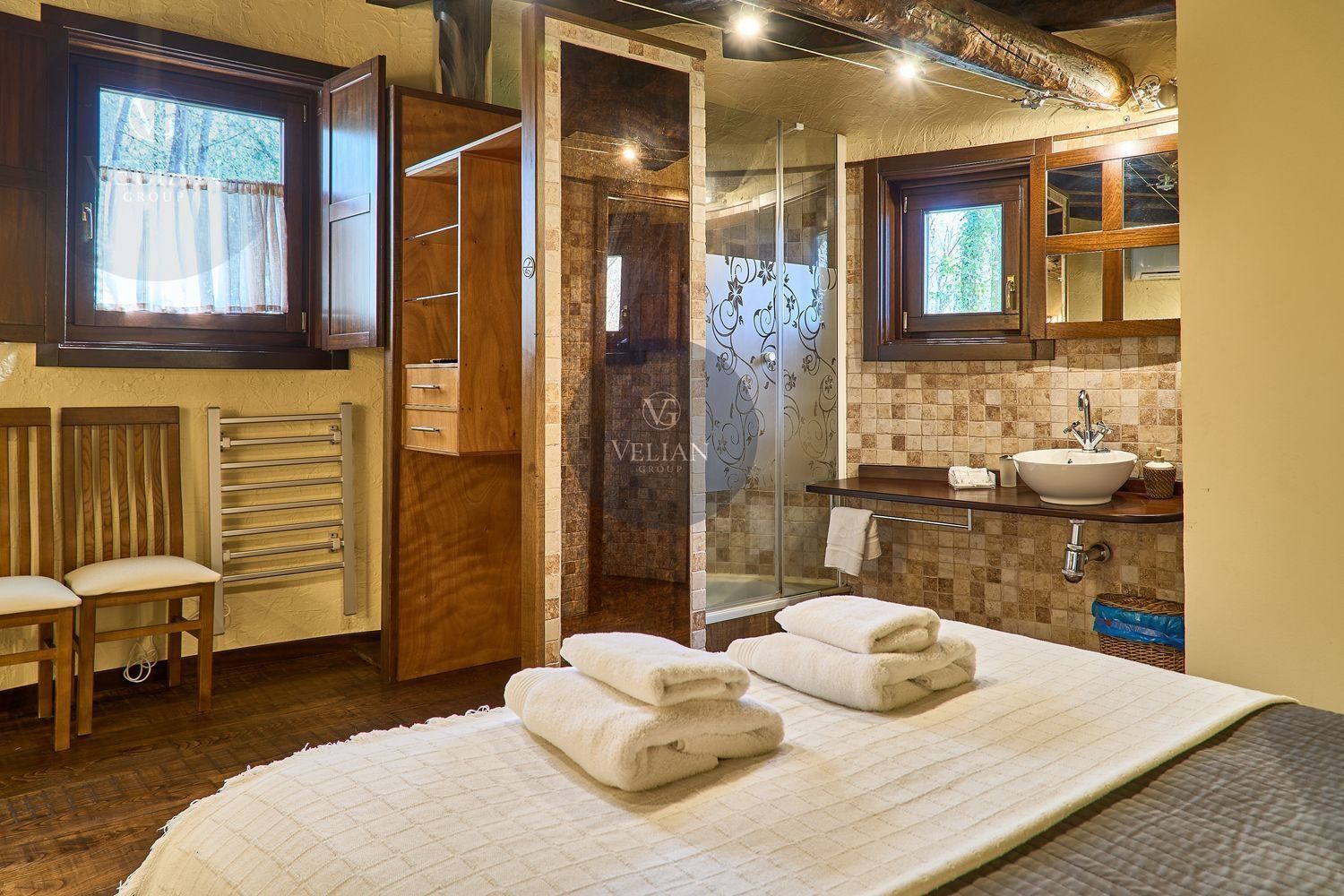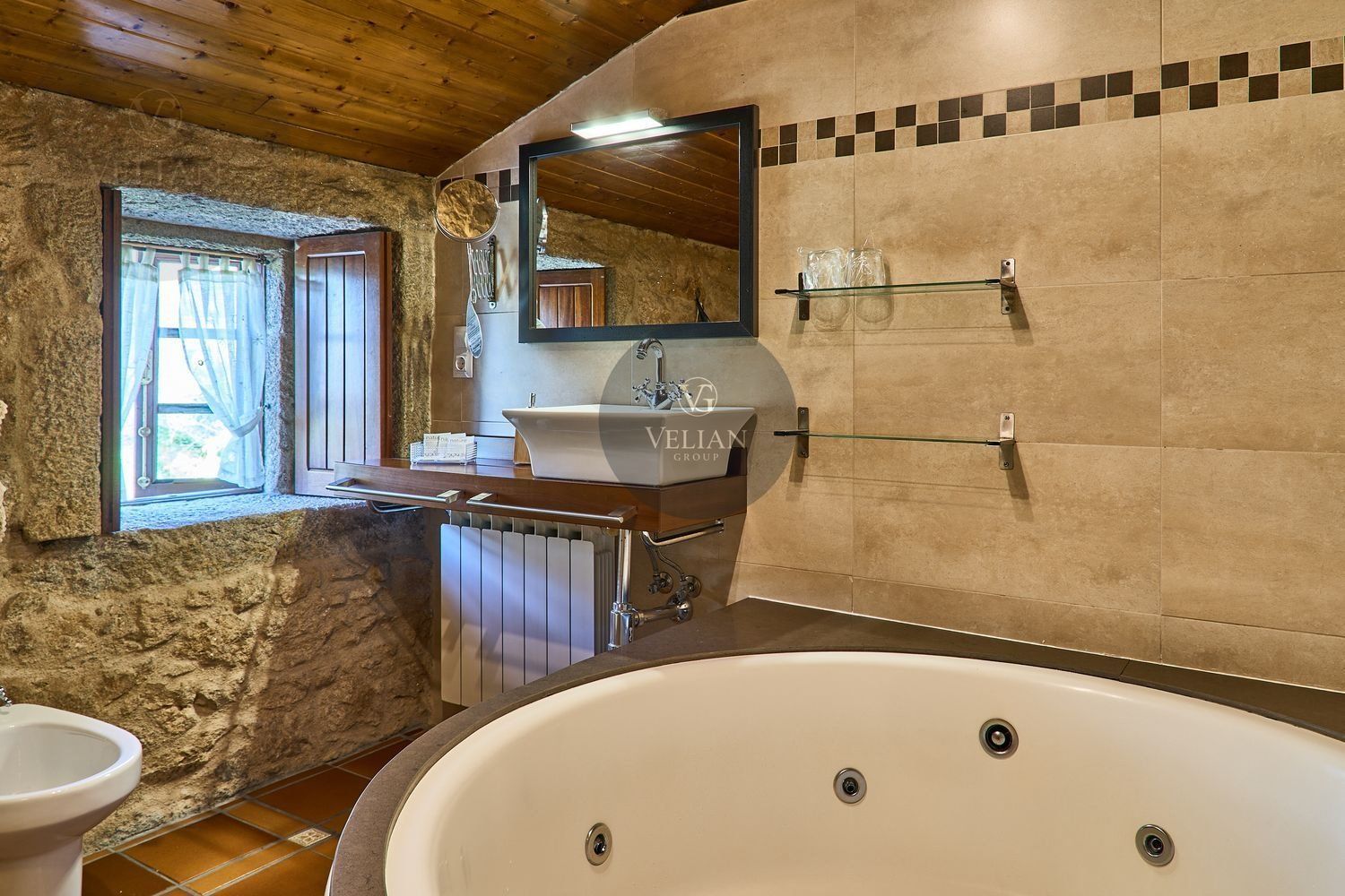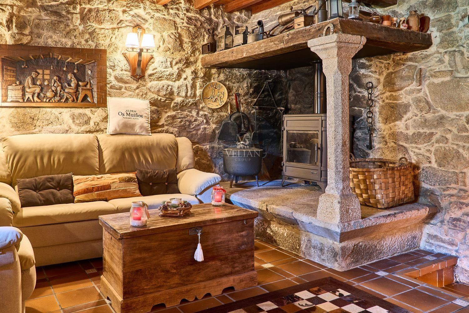 El complejo está compuesto por una casa principal de piedra con seis habitaciones dobles con baño en suite, amplias, luminosas, con calefacción central por gasoil, por suelo radiante y aire acondicionado, ofreciendo una estancia de máximo confort. Además, cuenta con tres cabañas bioclimáticas situadas en el bosque, construidas con contenedores marítimos reciclados y revestidas en madera para una integración perfecta con el entorno. Estas cabañas han sido diseñadas con un enfoque sostenible y funcional, incluyendo chimenea, cocina equipada, televisión, bañera de hidromasaje, terraza privada con barbacoa y acceso a una piscina-jacuzzi compartida. Una de ellas, un antiguo palomar reformado, ha sido convertida en una espectacular suite con un diseño exclusivo.