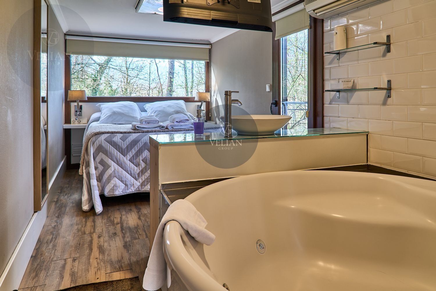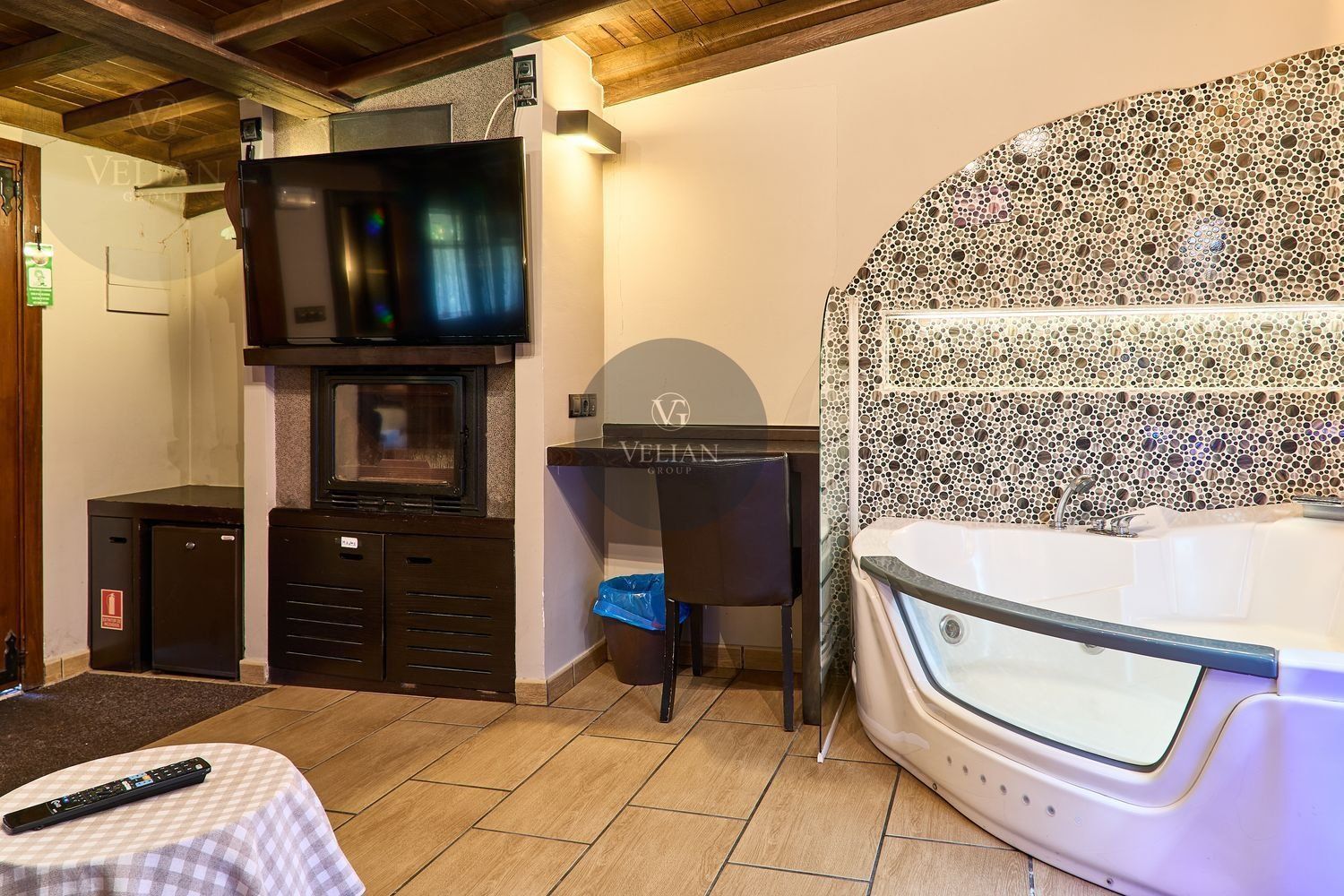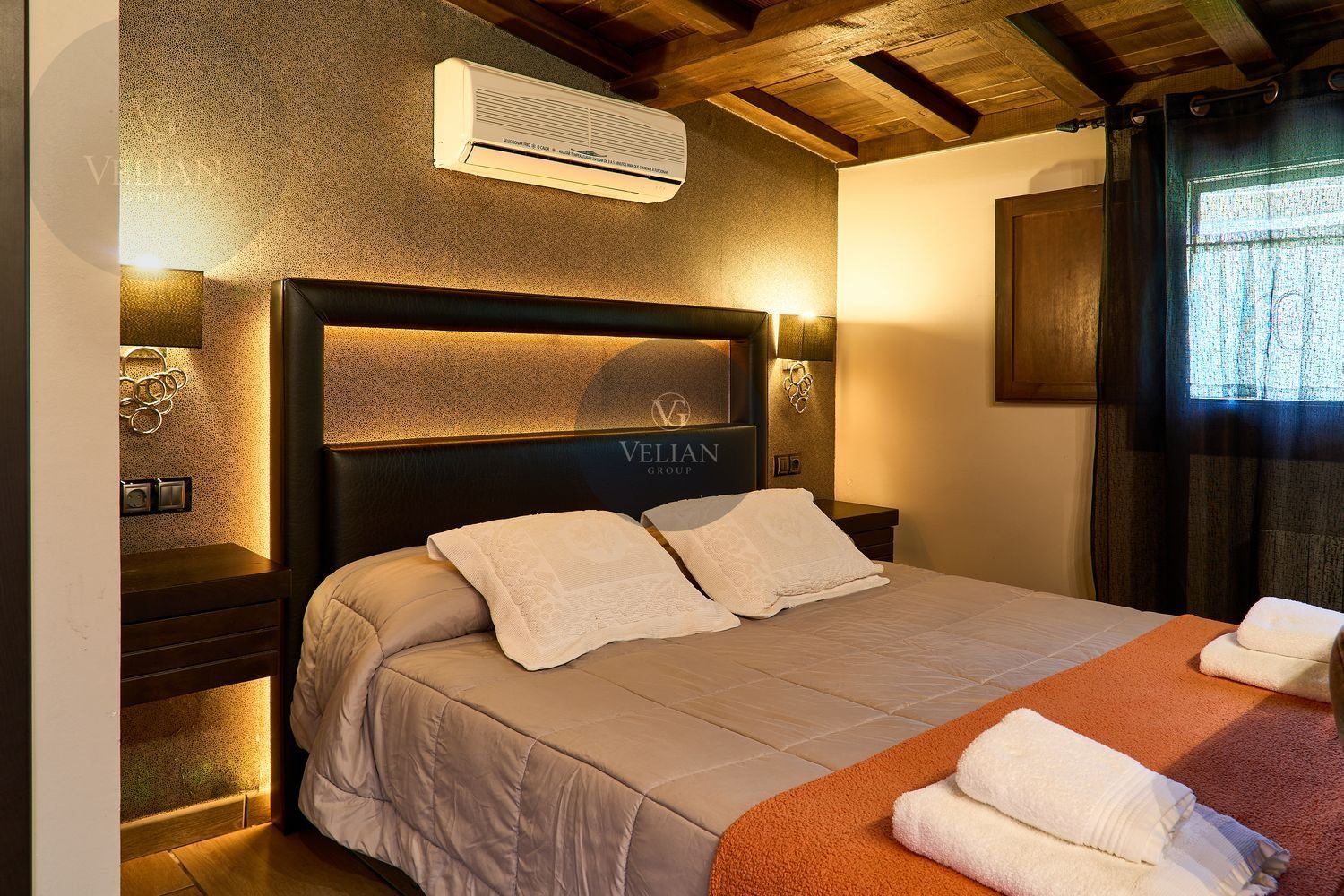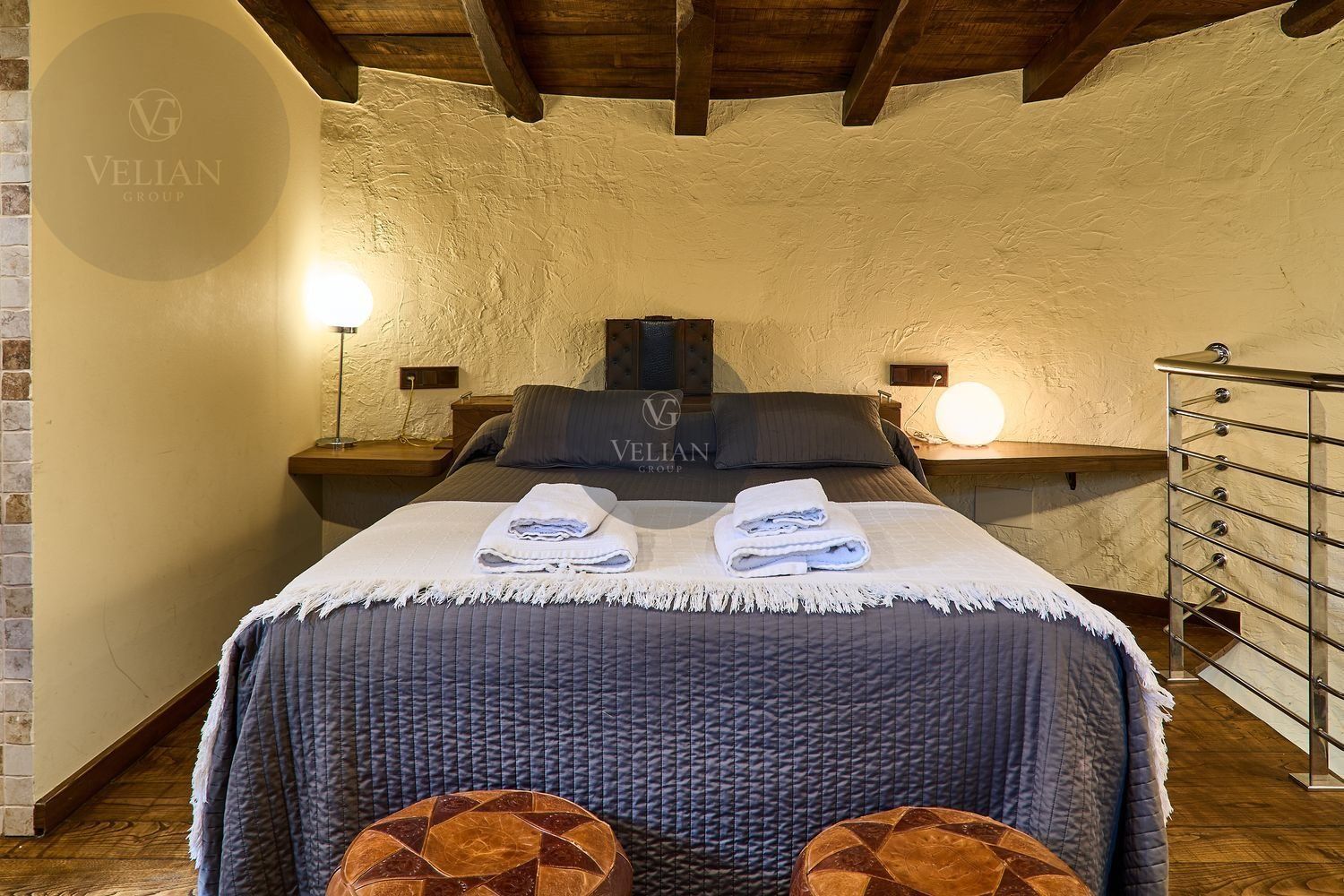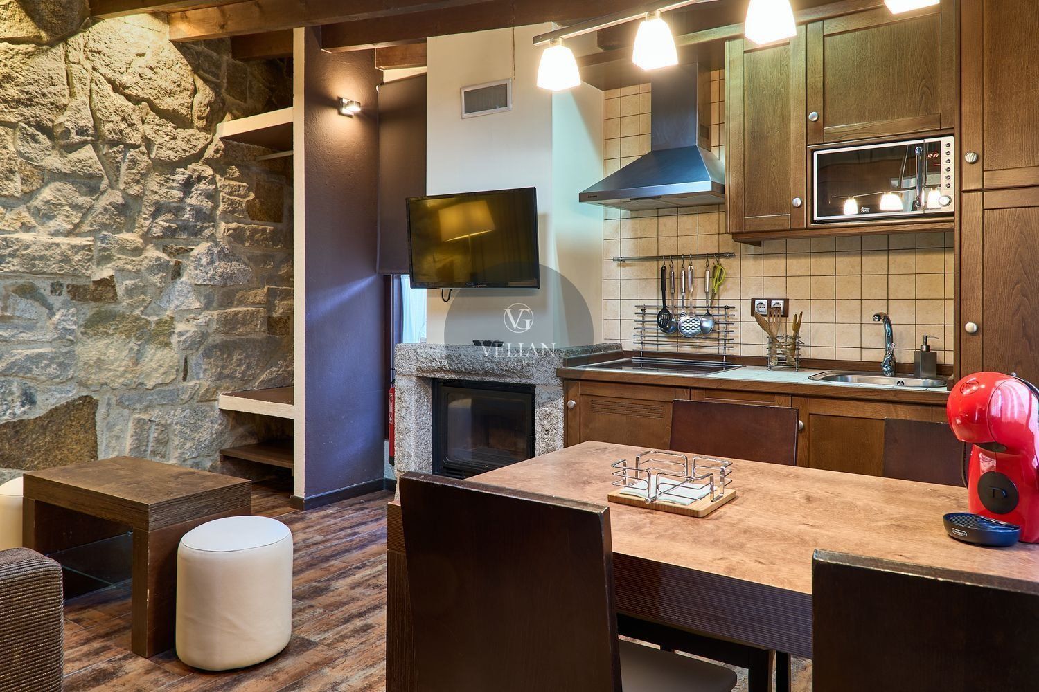 El complejo está compuesto por una casa principal de piedra con seis habitaciones dobles con baño en suite, amplias, luminosas, con calefacción central por gasoil, por suelo radiante y aire acondicionado, ofreciendo una estancia de máximo confort. Además, cuenta con tres cabañas bioclimáticas situadas en el bosque, construidas con contenedores marítimos reciclados y revestidas en madera para una integración perfecta con el entorno. Estas cabañas han sido diseñadas con un enfoque sostenible y funcional, incluyendo chimenea, cocina equipada, televisión, bañera de hidromasaje, terraza privada con barbacoa y acceso a una piscina-jacuzzi compartida. Una de ellas, un antiguo palomar reformado, ha sido convertida en una espectacular suite con un diseño exclusivo.