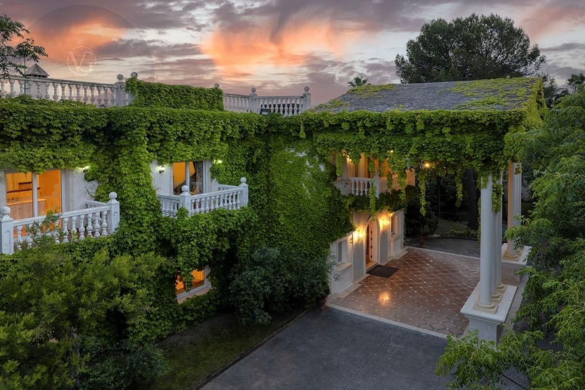 Desde el primer momento, una imponente fachada con columnas dóricas y marquesina esculpida te recibe con la solemnidad de una villa aristocrática. La vegetación que abraza sus muros, las puertas dobles arqueadas enmarcadas en piedra natural y los balcones con barandales tallados evocan una escena salida de un cuento. El acceso, flanqueado por un elegante patio de mármol, anuncia una experiencia residencial sin igual.
